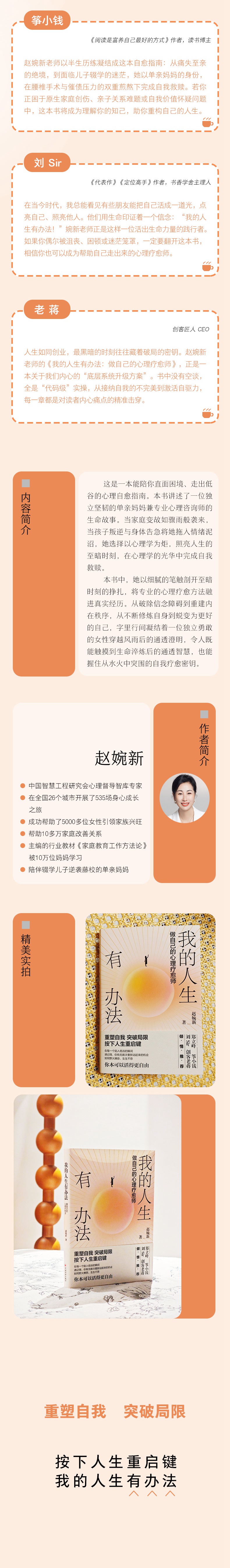 人生如同创业,*黑暗的时刻往往藏着破局的密钥。赵婉新老师的《我的人生有办法:做自己的心理疗愈师》,正是一本关于我们内心的“底层系统升级方案”。书中没有空谈,全是“代码级”实操,从接纳自我的不*到*自驱力,每一章*是对读者内心痛点的*击穿。