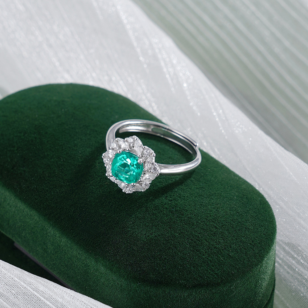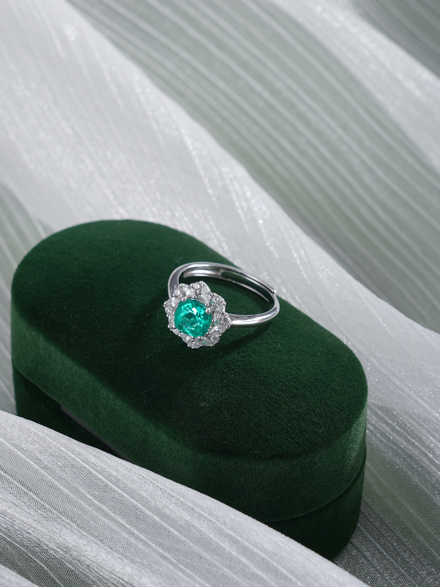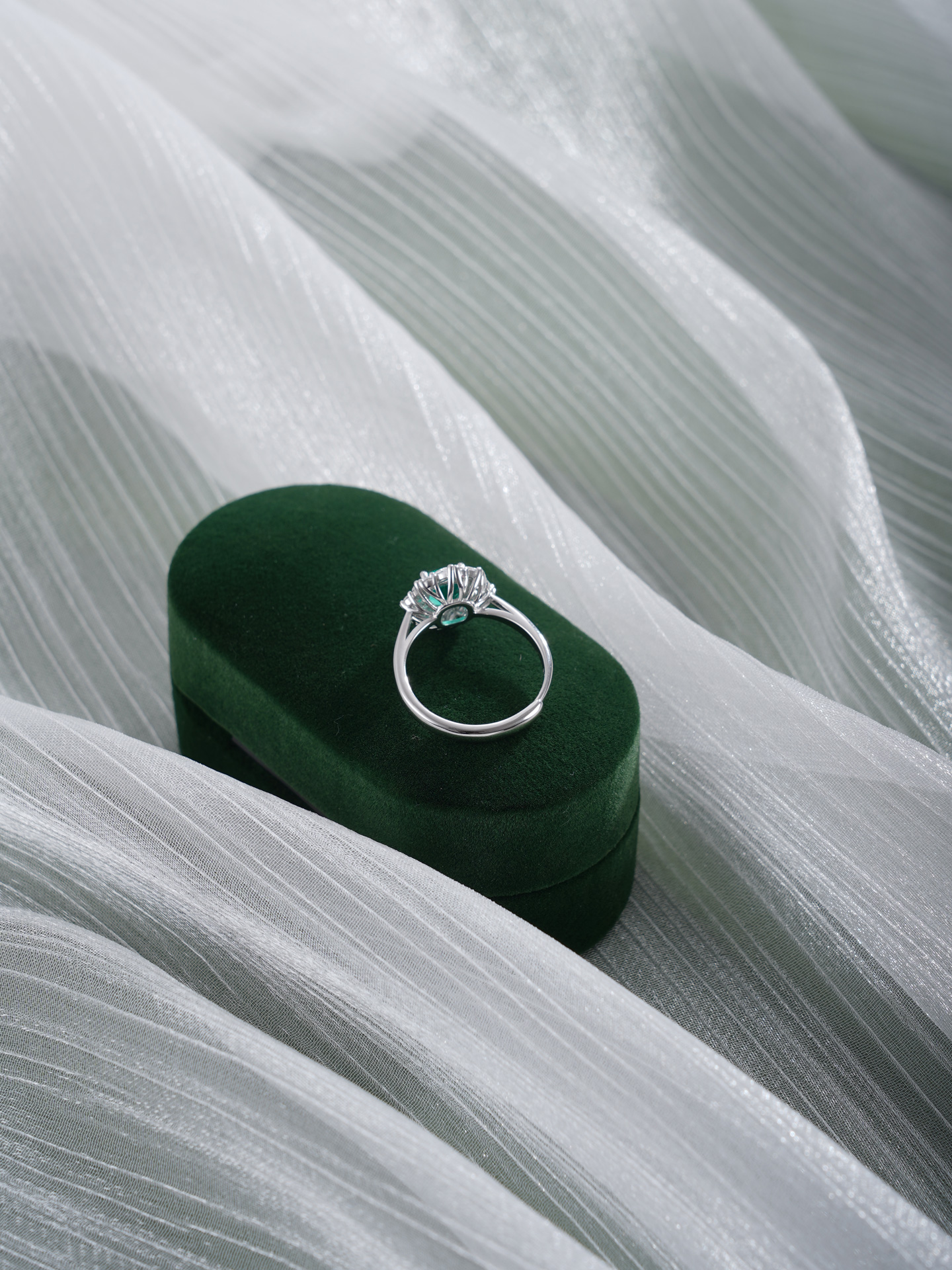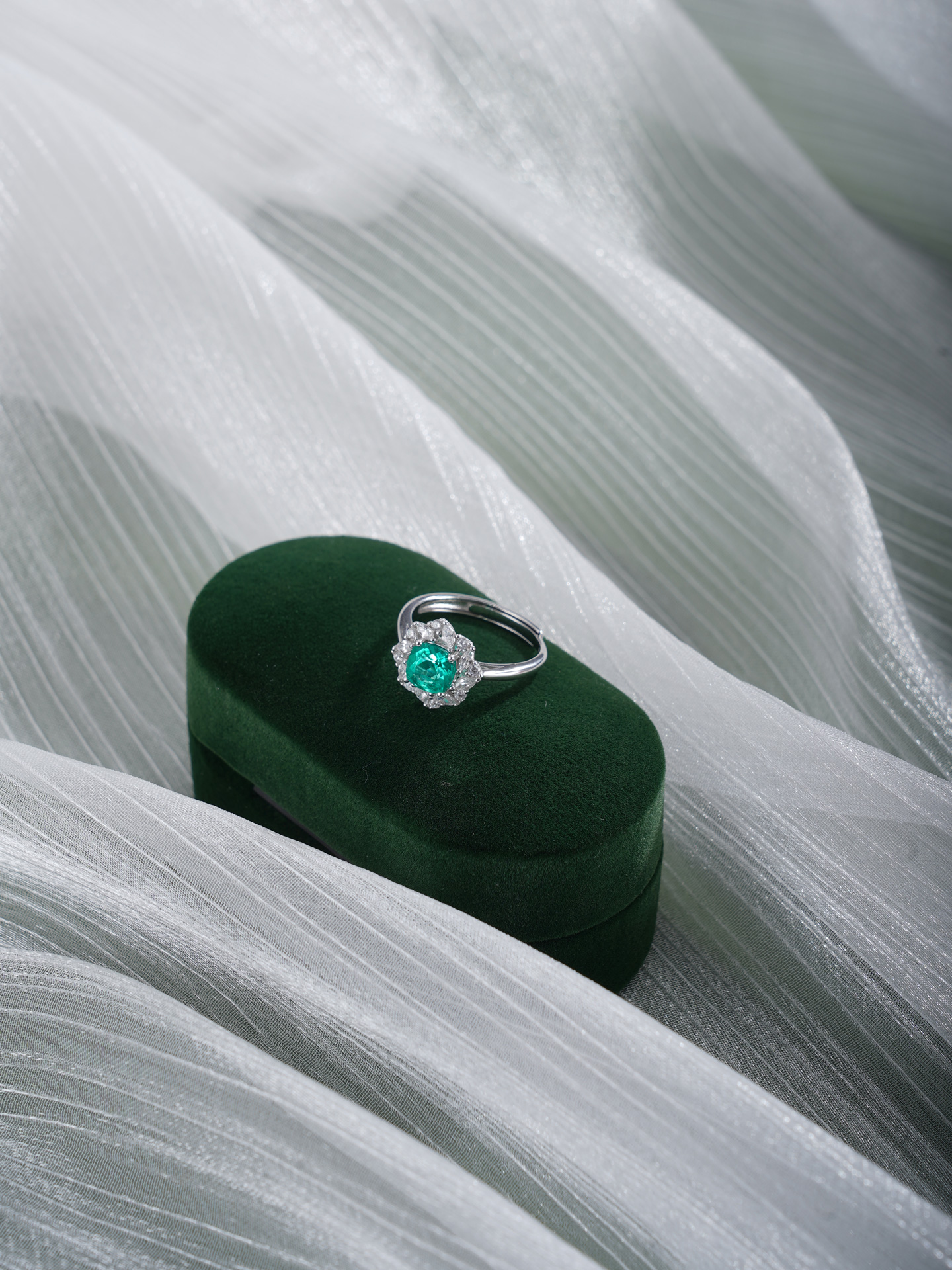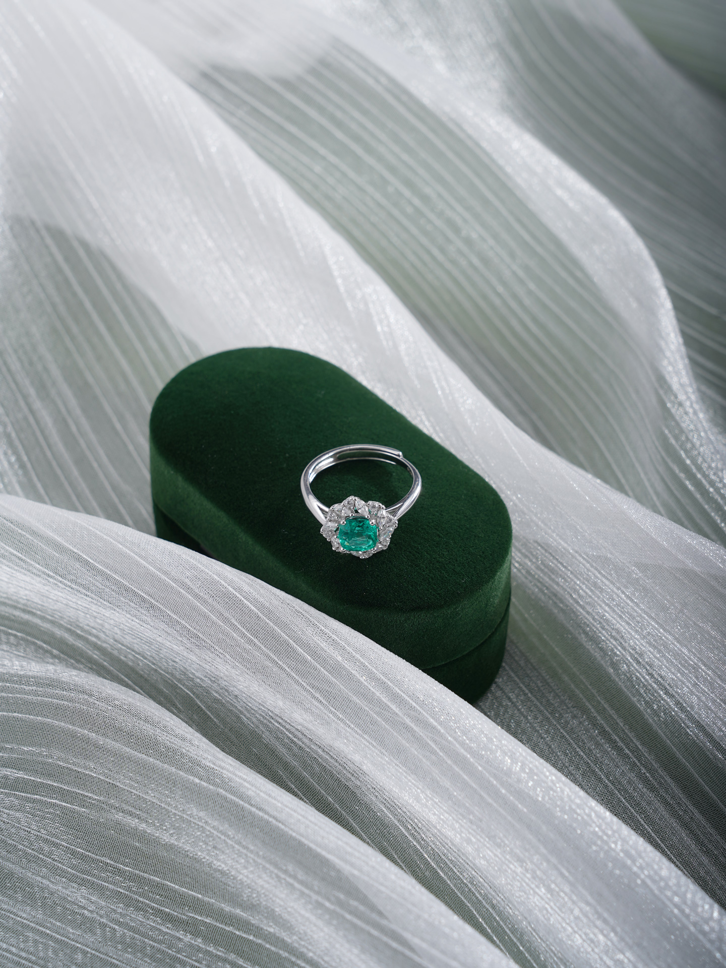 【寓意】:采用S925纯银为戒托,以锆石勾勒花瓣柔弧,祖母绿镶嵌,如晴空下涟漪凝成的花影,象征生命在时光中绚烂生长。