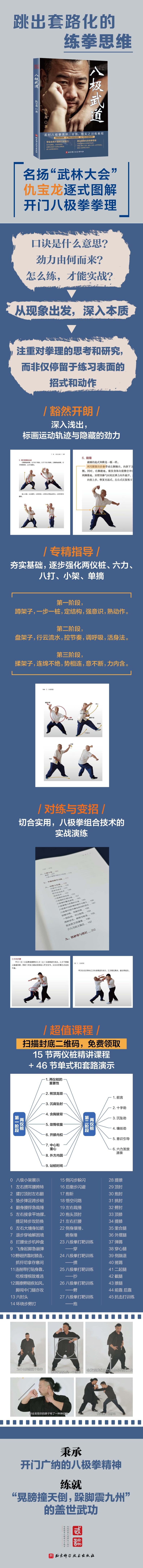 本书就是从八极拳的现象出发,跳出练套路的思维模式,深入本质,用意义不同的指示线条、图形,揭示招式背后的八极拳拳理,并附赠总计61节视频课程与演示,涵盖八极拳必学的桩、单式、招法,让每个热爱八极拳的武者都能学会八极拳的技术与精神内核。