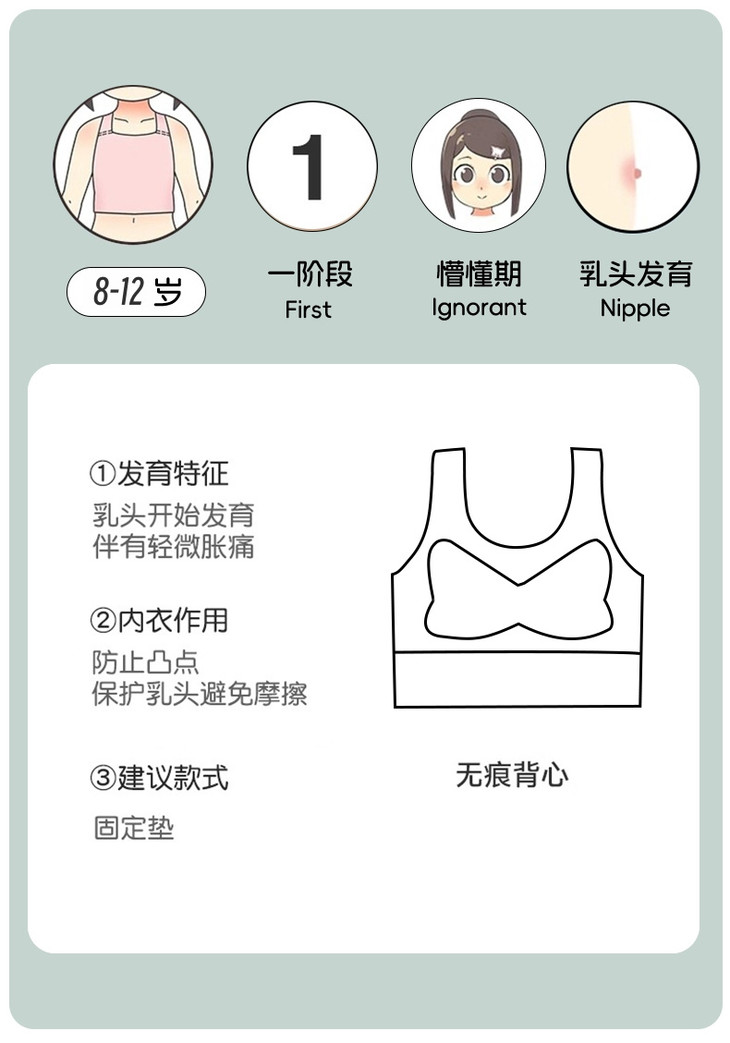 萌芽期的女孩,乳房已经开始有些变化了 希望小内衣穿上能尽可能的隐形,不要有很明显的印迹 因为不想让同学们知道,会觉得不好意思