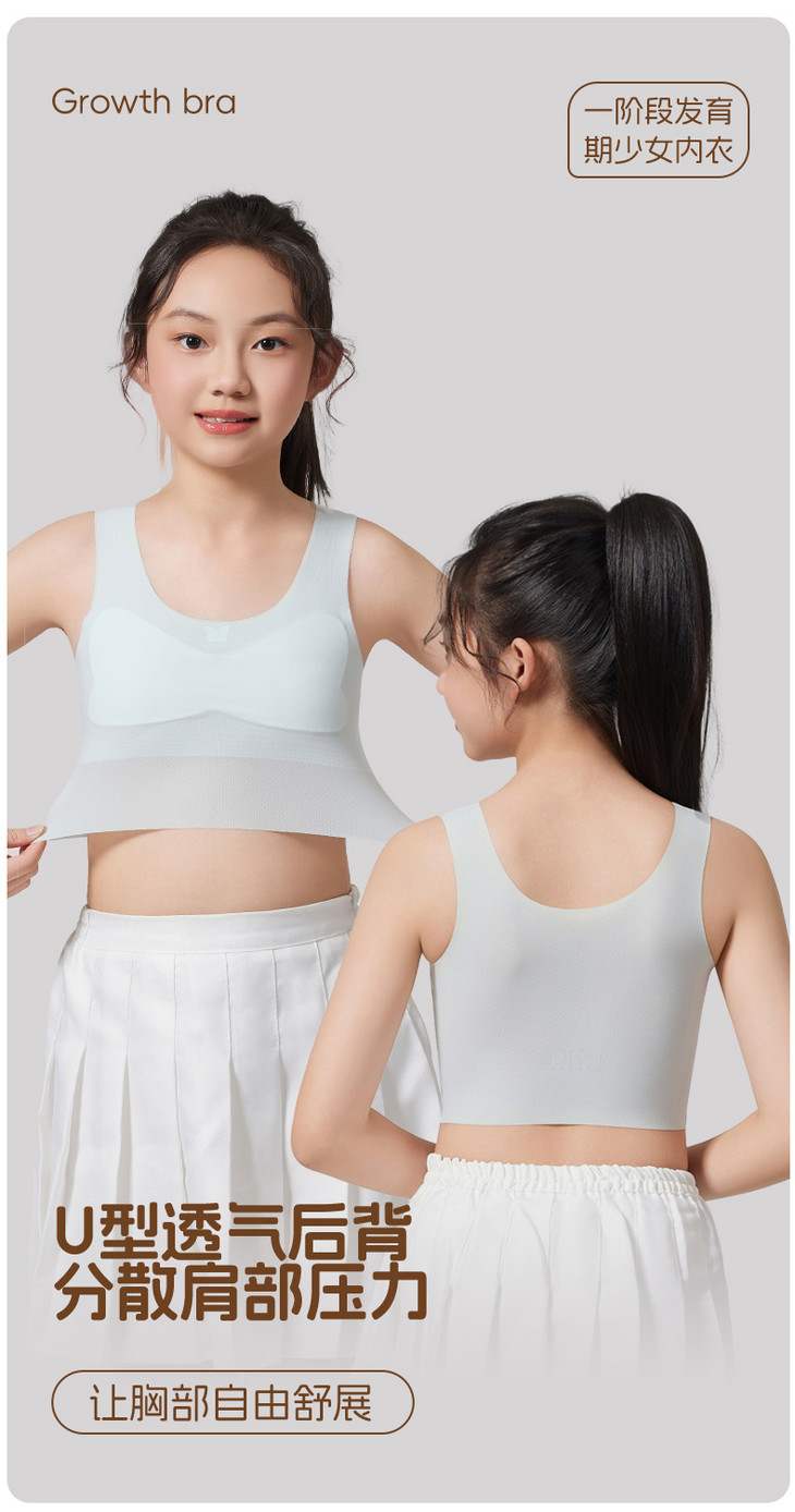 超高的小U型后背,加上到肚脐的长度,真的一点内衣感都没有,太适合刚刚开始发育的小女孩们了~ 加宽肩带+无搭扣设计,孩子穿着舒服又自在,还能减轻背部压力,防止孩子驼背含胸哦~
