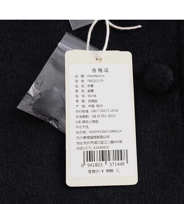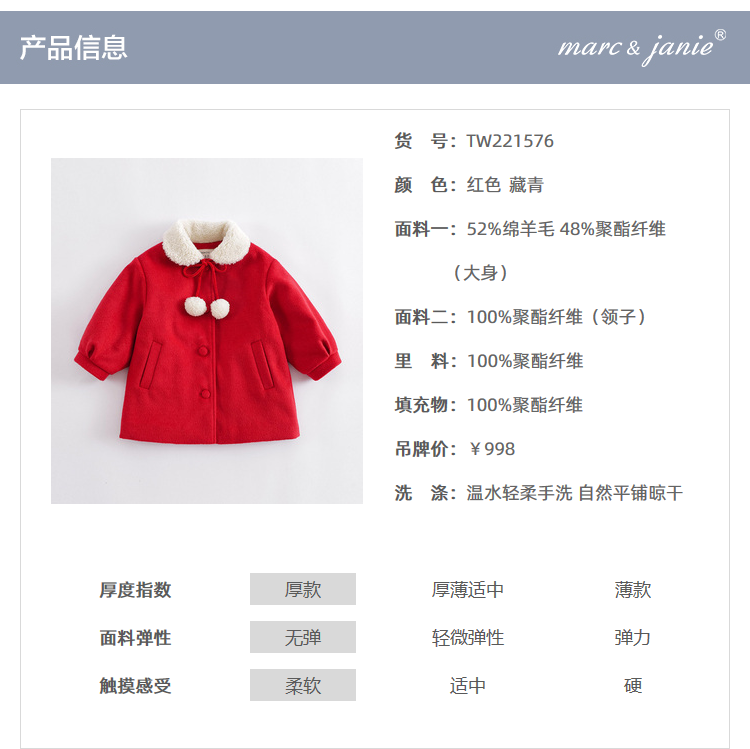 marcjanie马克珍妮秋冬新款 女童娃娃领毛呢夹棉大衣221576