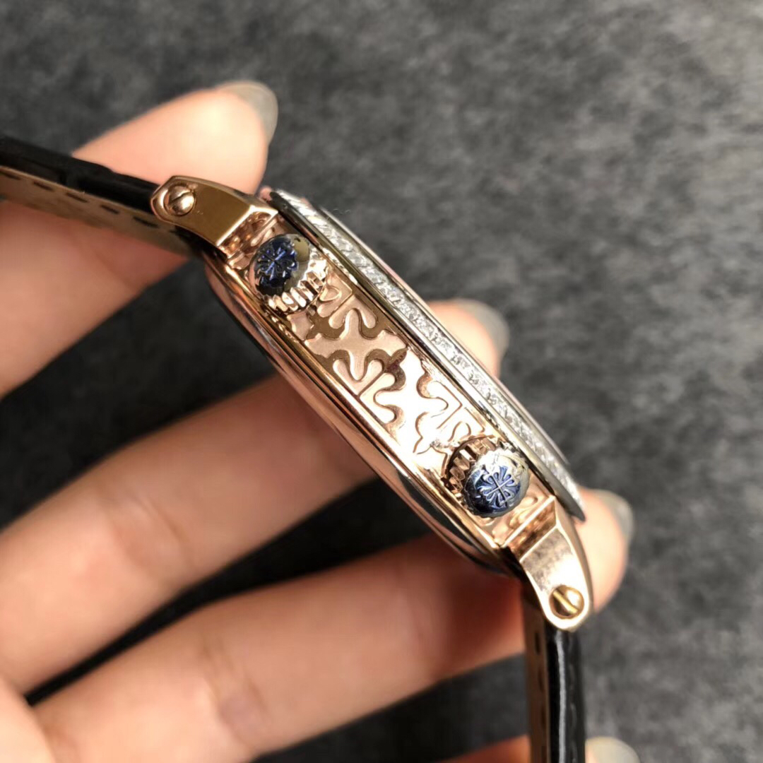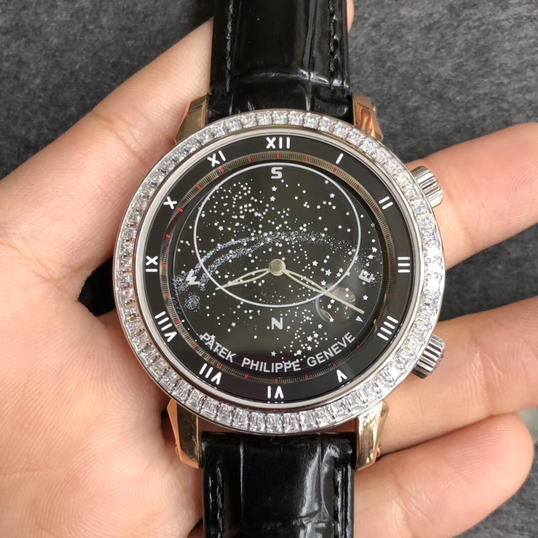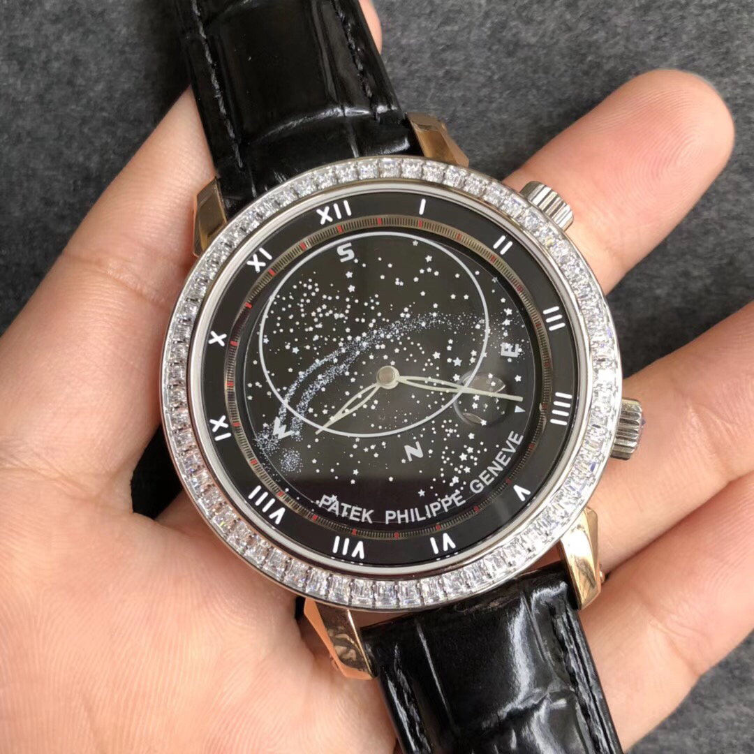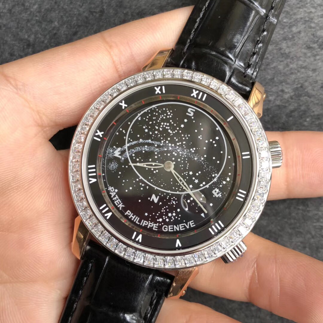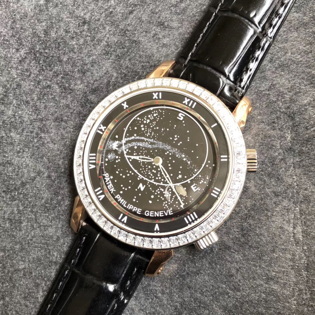 YL百达翡丽星空5102天月款日内瓦苍穹系列,星空腕表独具特别星象功能,蓝色圆表盘上就能欣赏日内瓦苍穹图,还有金色月球运行轨迹,熬时20个月 采用进口9015改造而成的珍珠陀,和正品一样机心 表盘上的月亮会根据天空的月亮月满圆月蚀弯的情况自动变化 表壳前后玻璃采用先进技术处理让玻璃折射光提高,让表盘看起来更加通透 似乎没有玻璃的感觉 5字位把头调星空盘转动。本厂壳身百达翡丽花纹 花重金采cnc深雕刻 立体感凹凸感 超强。升级了24小时自转的星空 表盘尺寸43mm