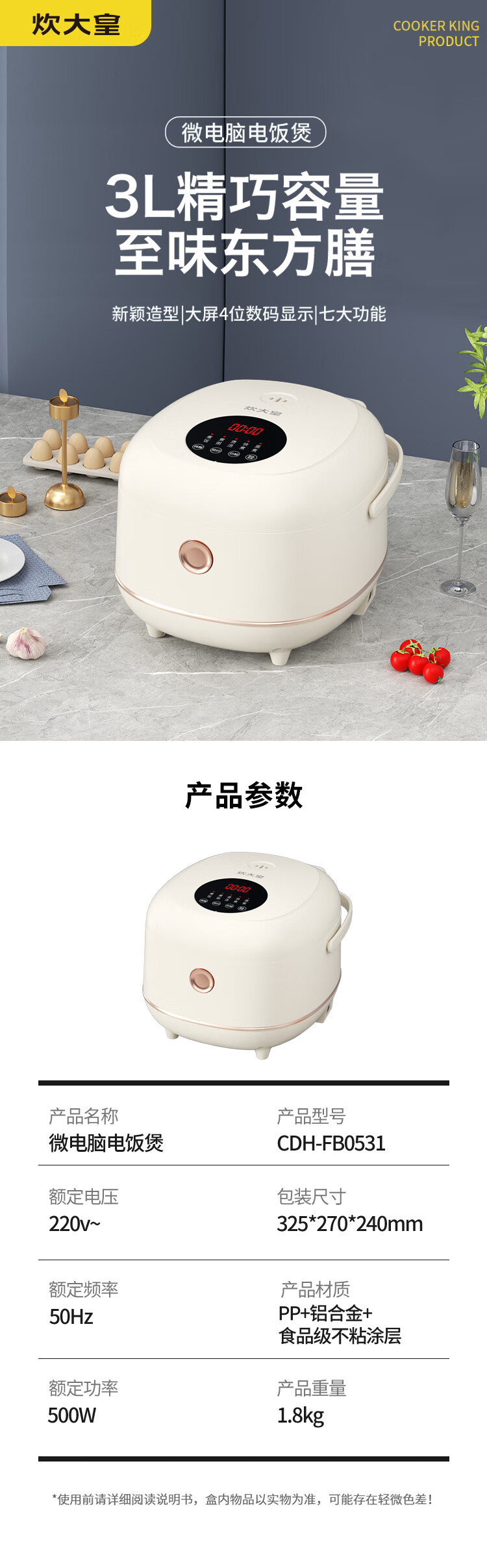 炊大皇 微电脑电饭煲 3L精巧容量 CDH-FB0531