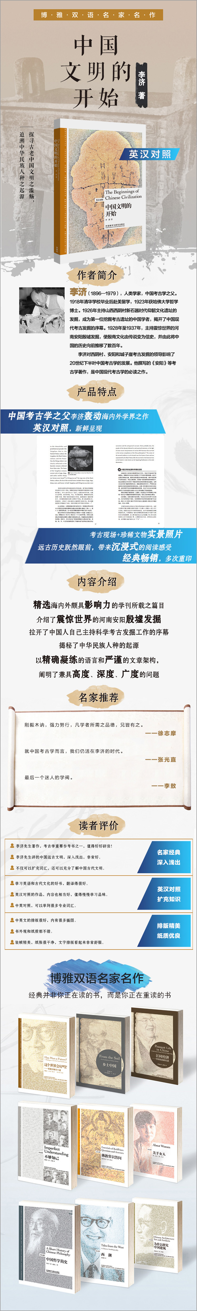 《中国文明的开始(博雅双语名家名作)》一书中由中国考古学泰斗李济讲述震惊世界的殷墟发掘,带你探究20世纪中国伟大的考古传奇,解密千年前中华民族人种起源之谜。美国出版后十年间加印五次。
