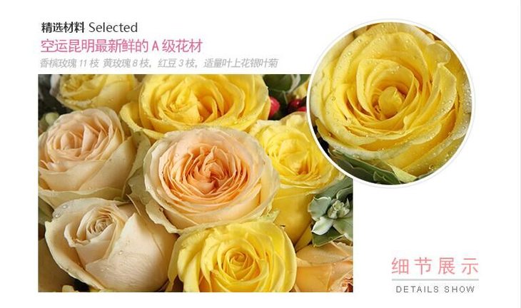 香槟玫瑰11枝,黄玫瑰8枝,红豆3枝,适量叶上花,银叶菊(如当地红豆缺货,用相思梅等其他寓意相近配材替代。)