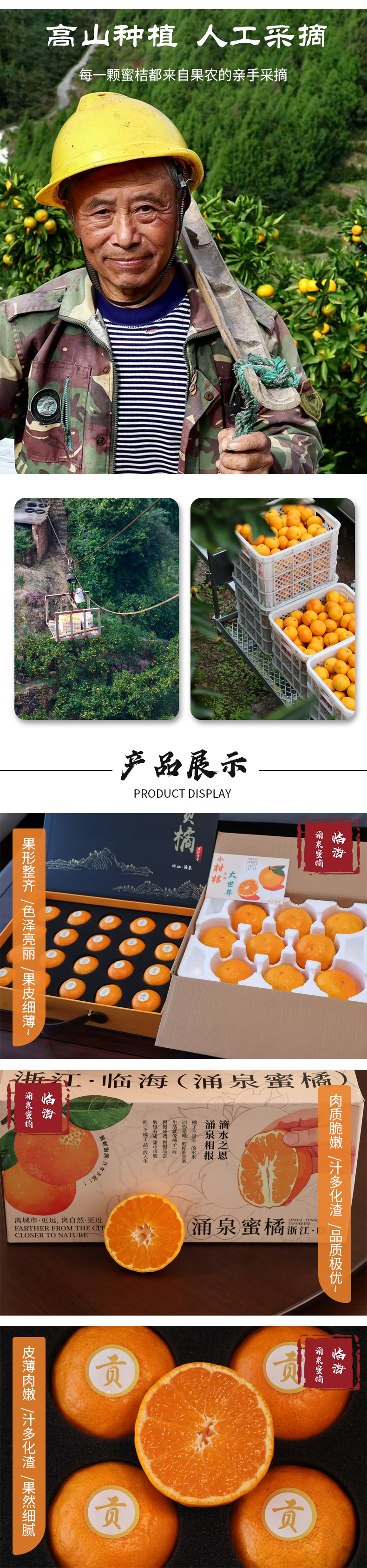 【产品规格】临海涌泉蜜桔:5斤±100g彩箱装(约18-24枚左右),10斤±150g彩箱装(约36-48枚左右),20-24枚礼盒装(约4斤左右)。