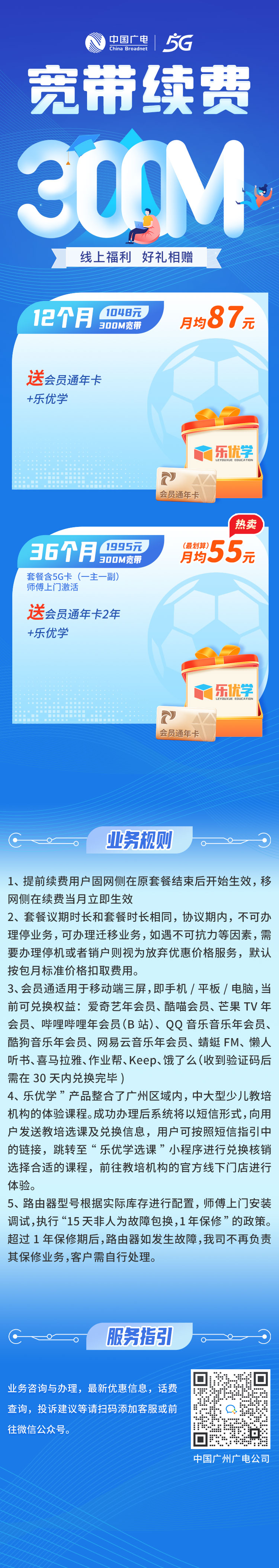 【300M宽带续费】线上福利 好礼相赠。宽带续费专享优惠(不含电视费),视频会员+乐优学免费送!