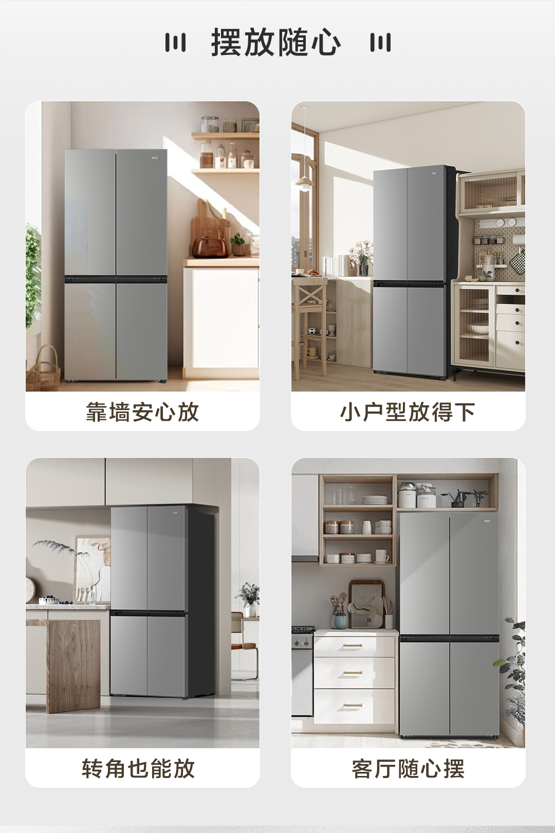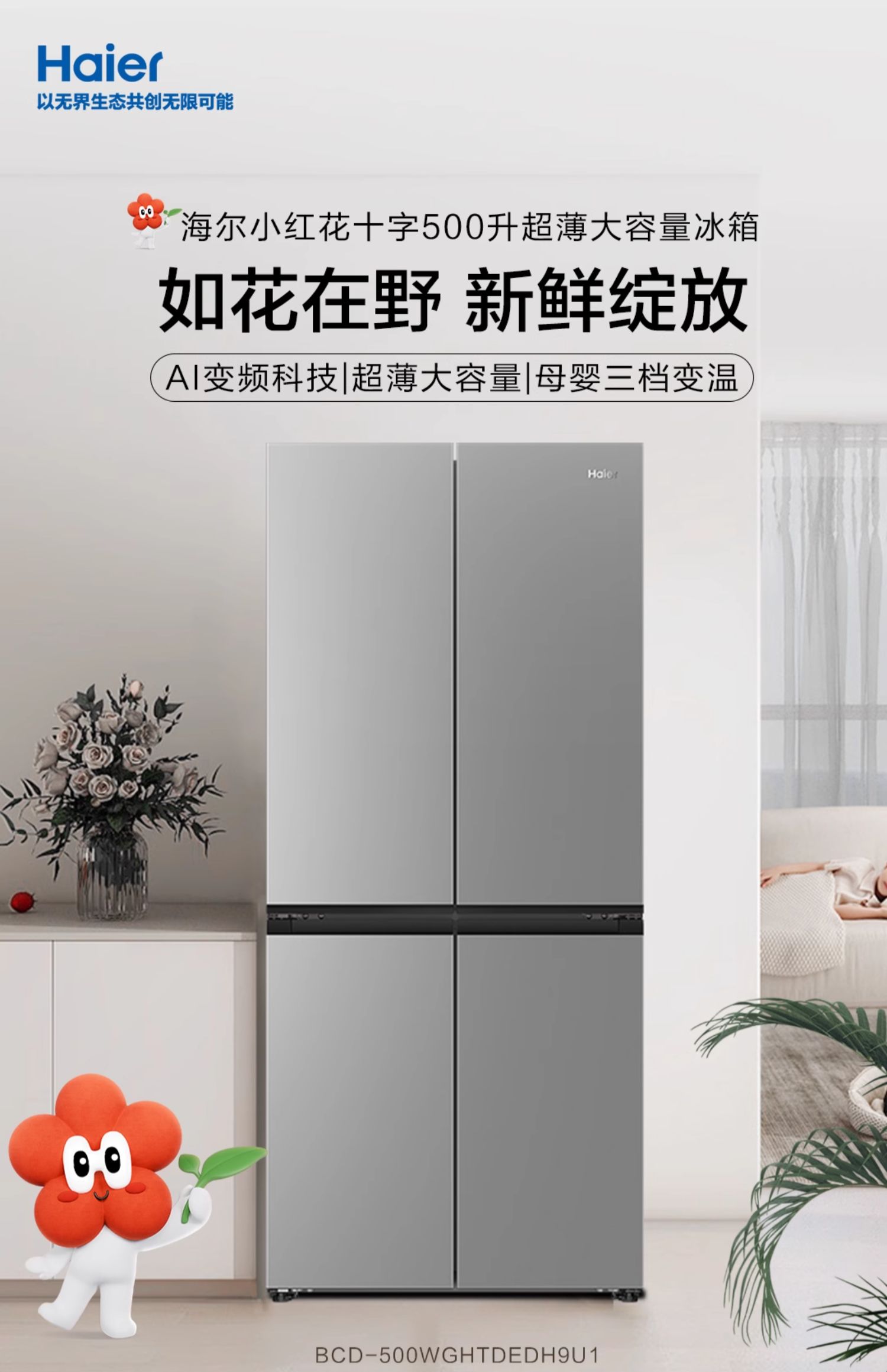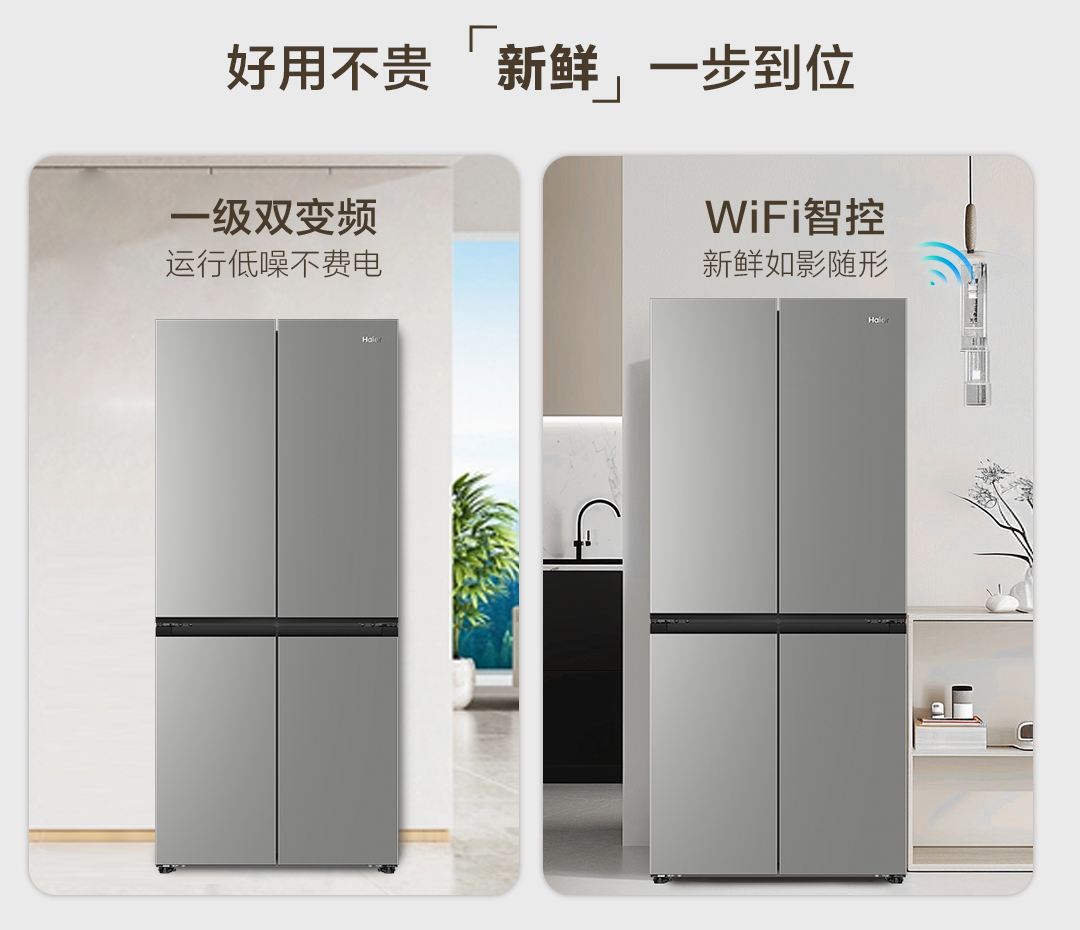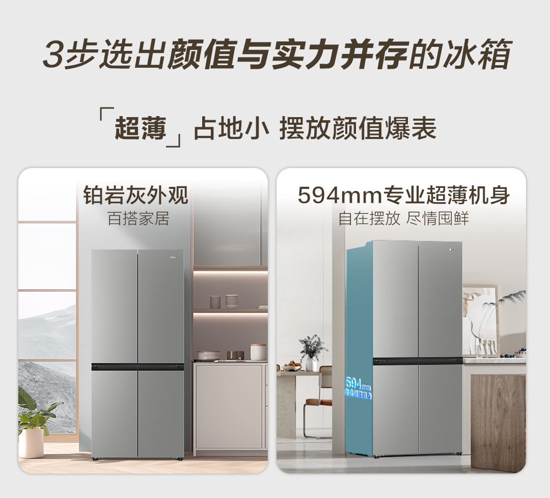 海尔小红花500L十字双开四门一级超薄家用风冷无霜电冰箱BCD-500WGHTDEDH9U1 500L铂岩灰