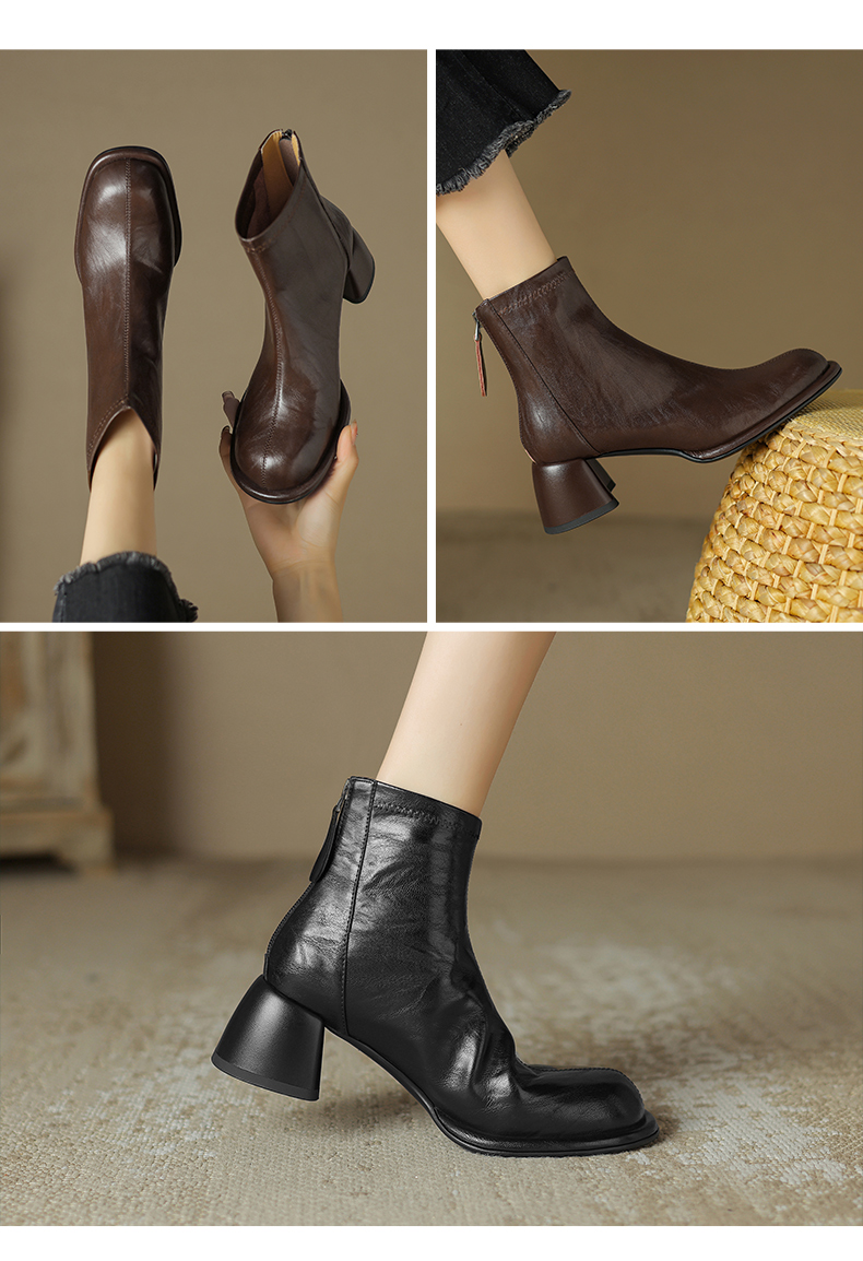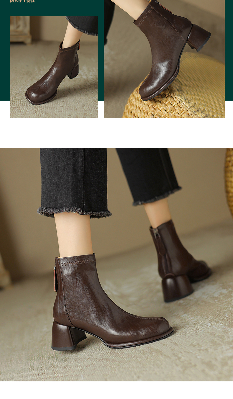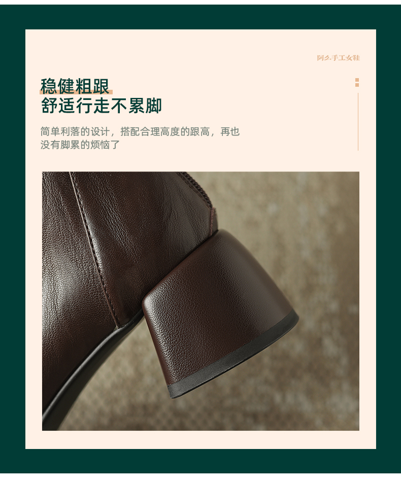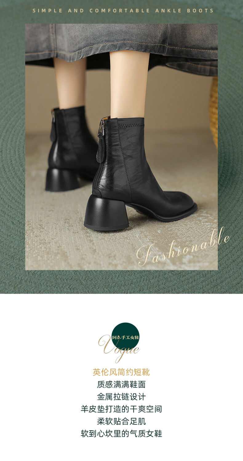 阿么手工女鞋小方头短靴高跟5.5CM雅丹风百搭新款法式复古时装靴