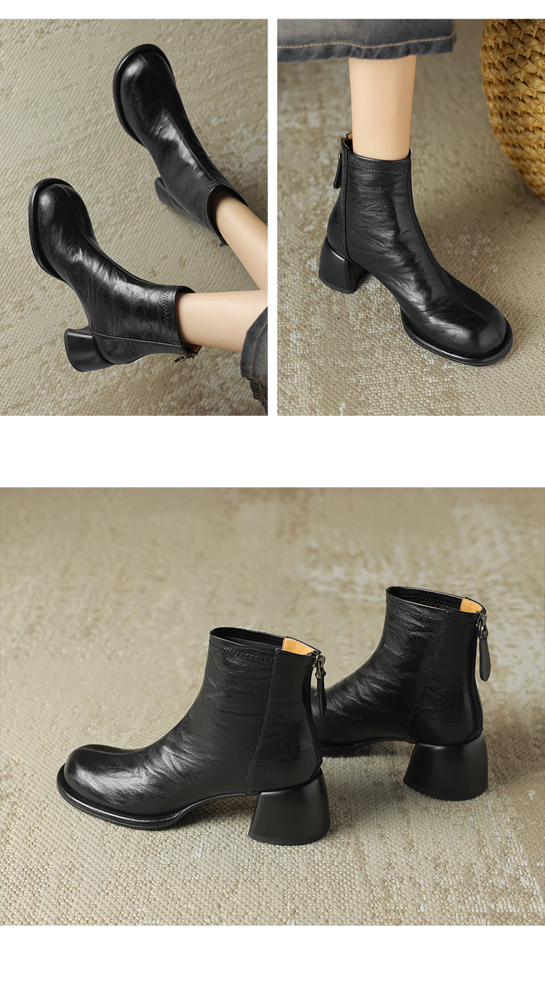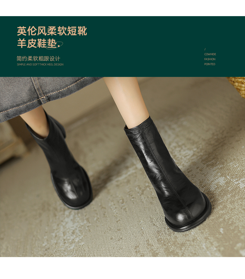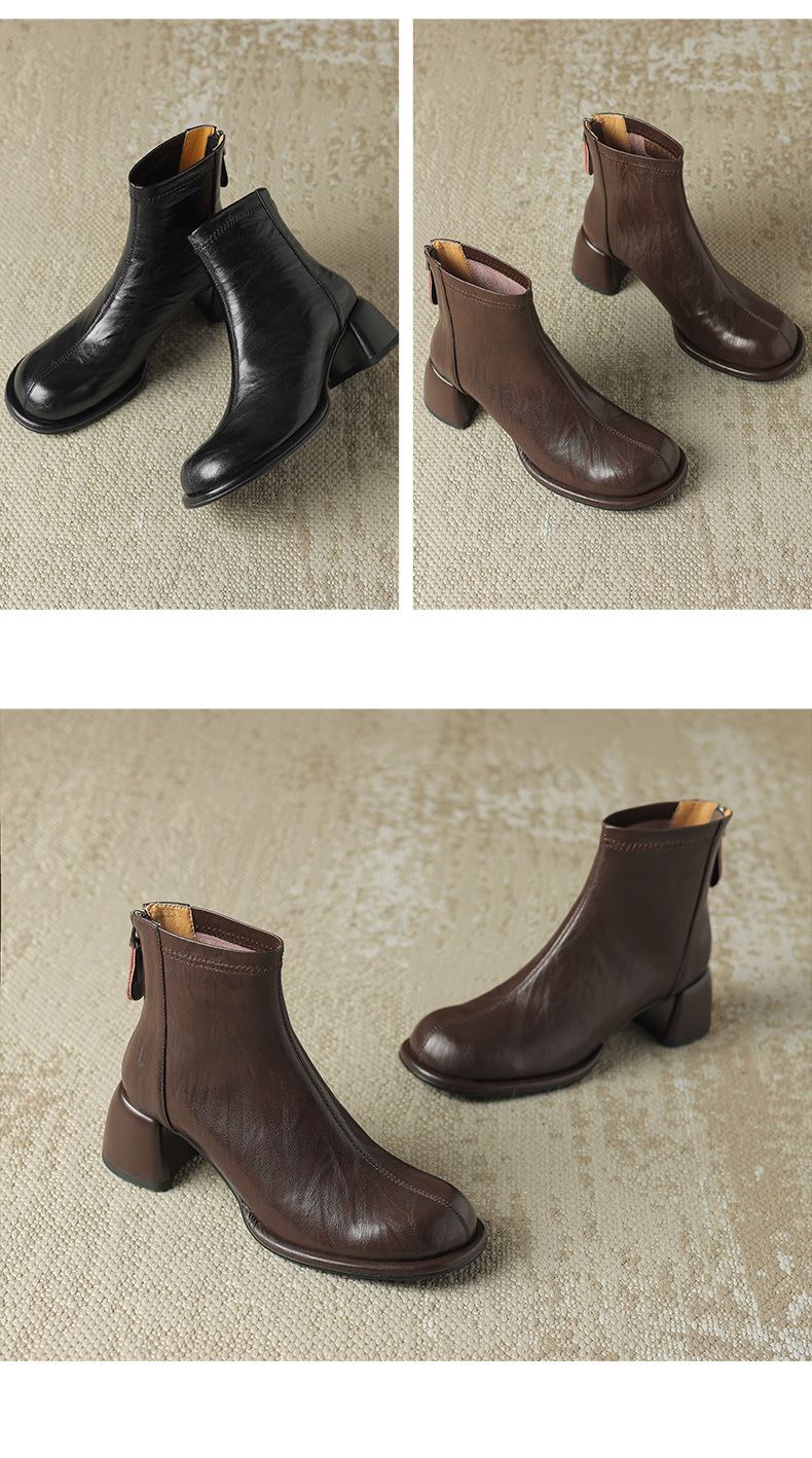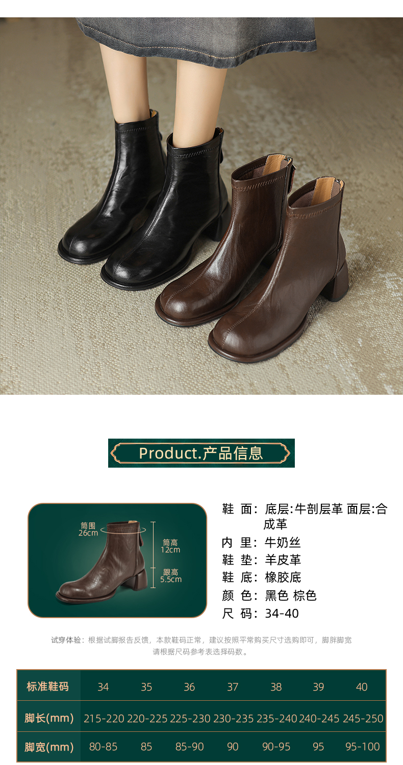 阿么手工女鞋小方头短靴高跟5.5CM雅丹风百搭新款法式复古时装靴