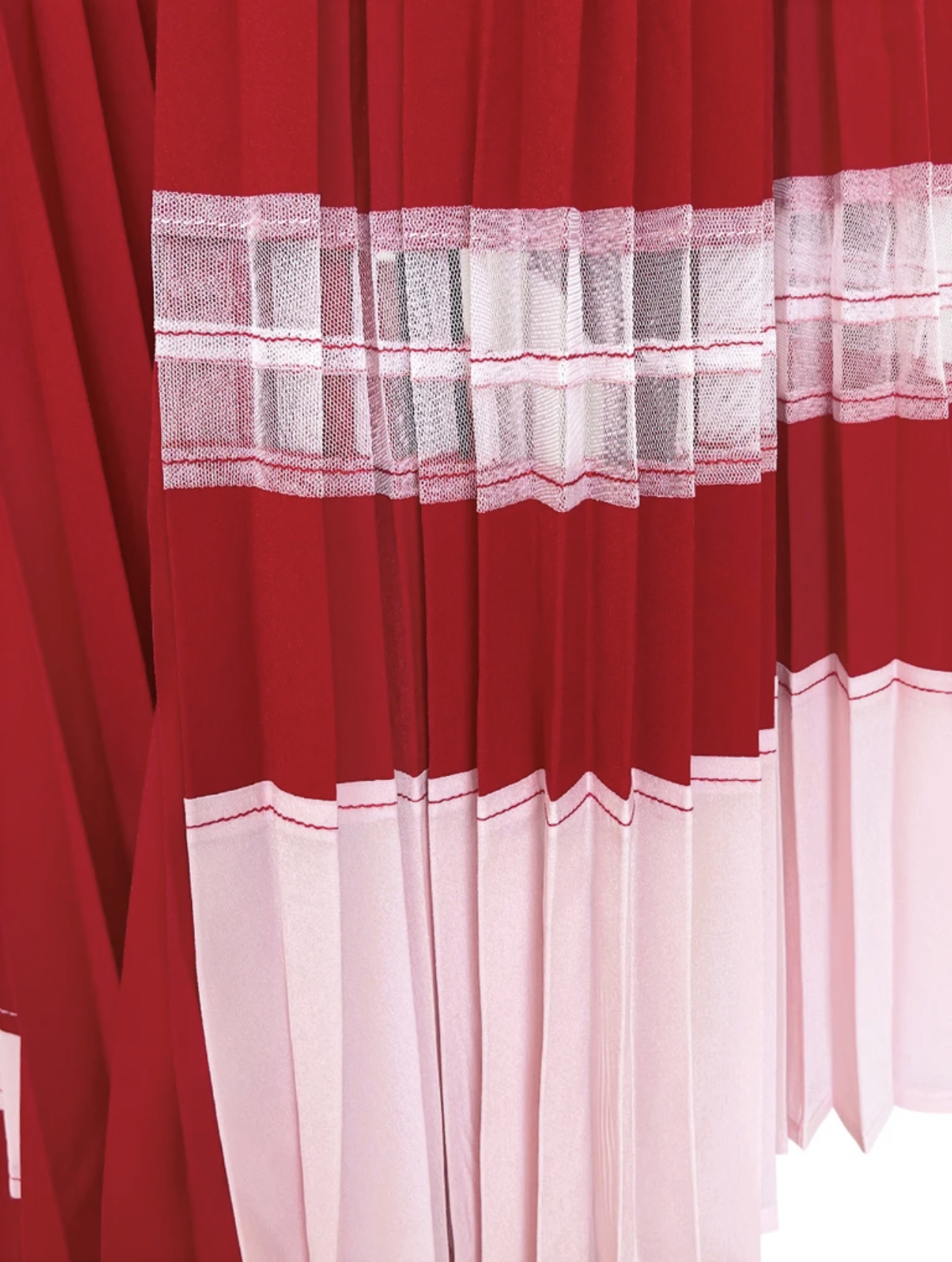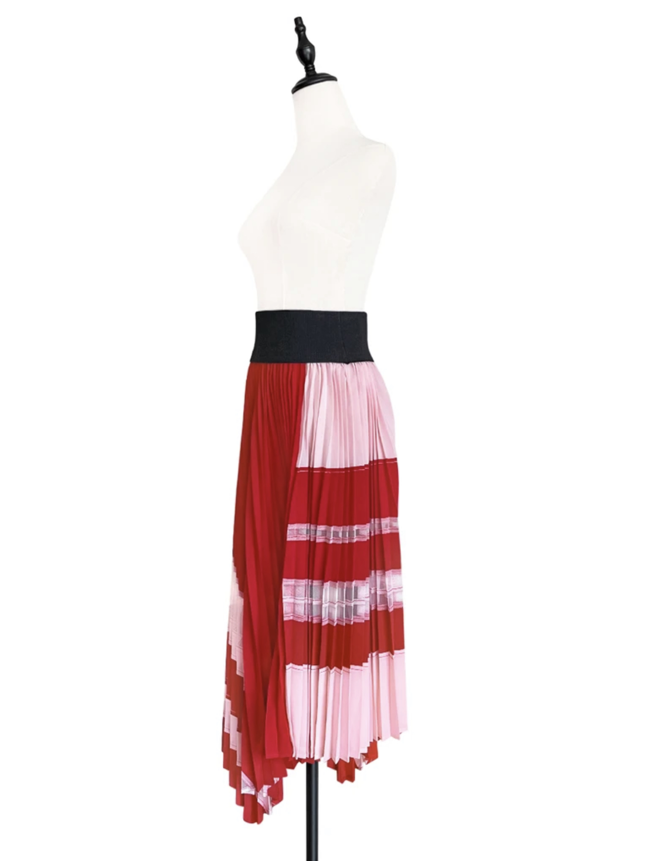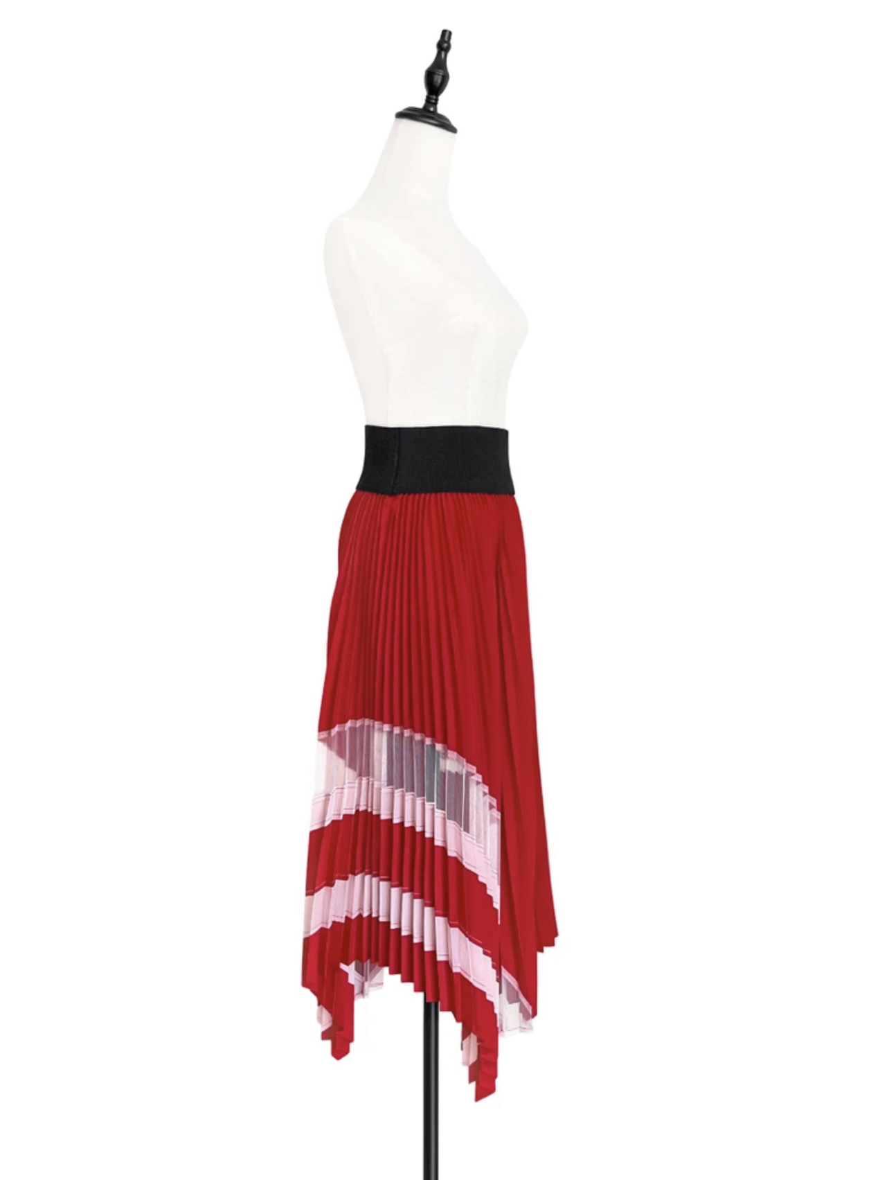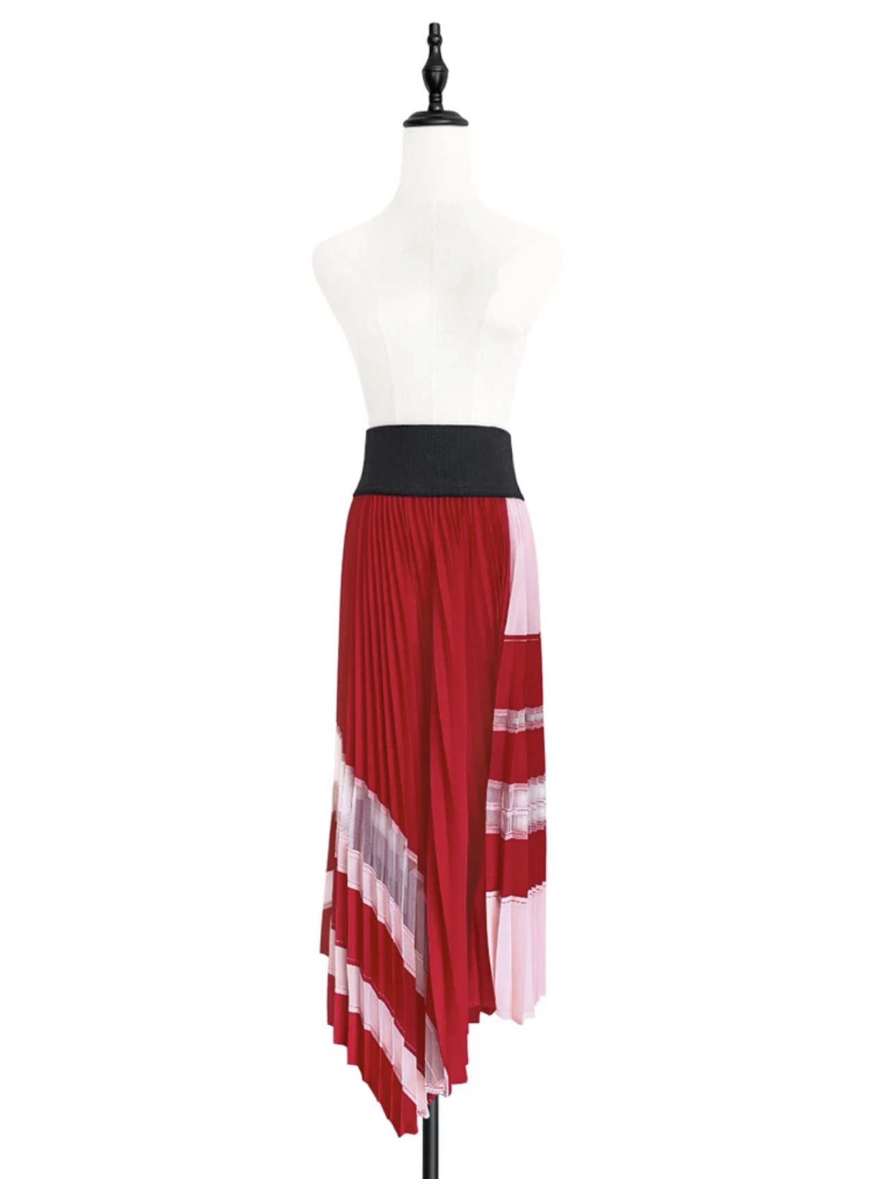 TYNVIE 不对称裙摆百褶拼接半身长裙-红粉色