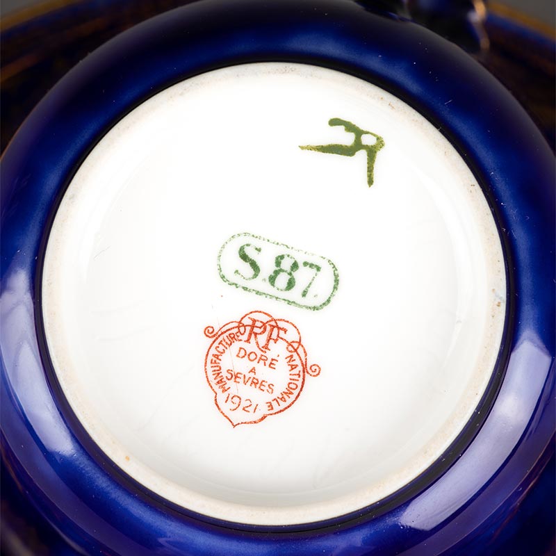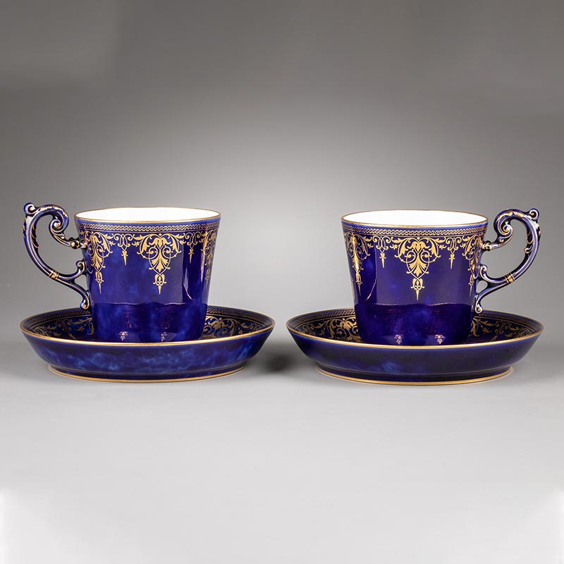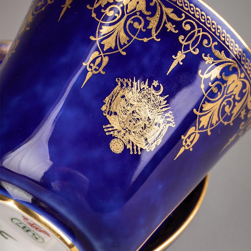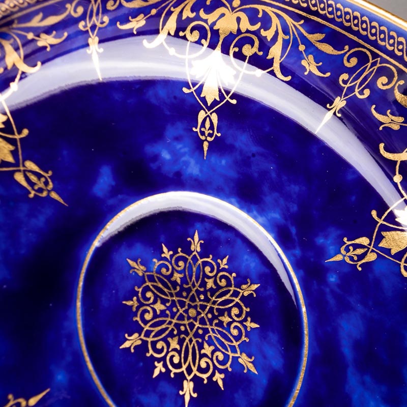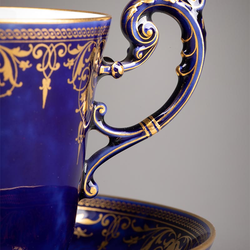 1921年代法国御窑出品手绘描金装饰古典花叶纹帝王蓝釉瓷器杯碟
