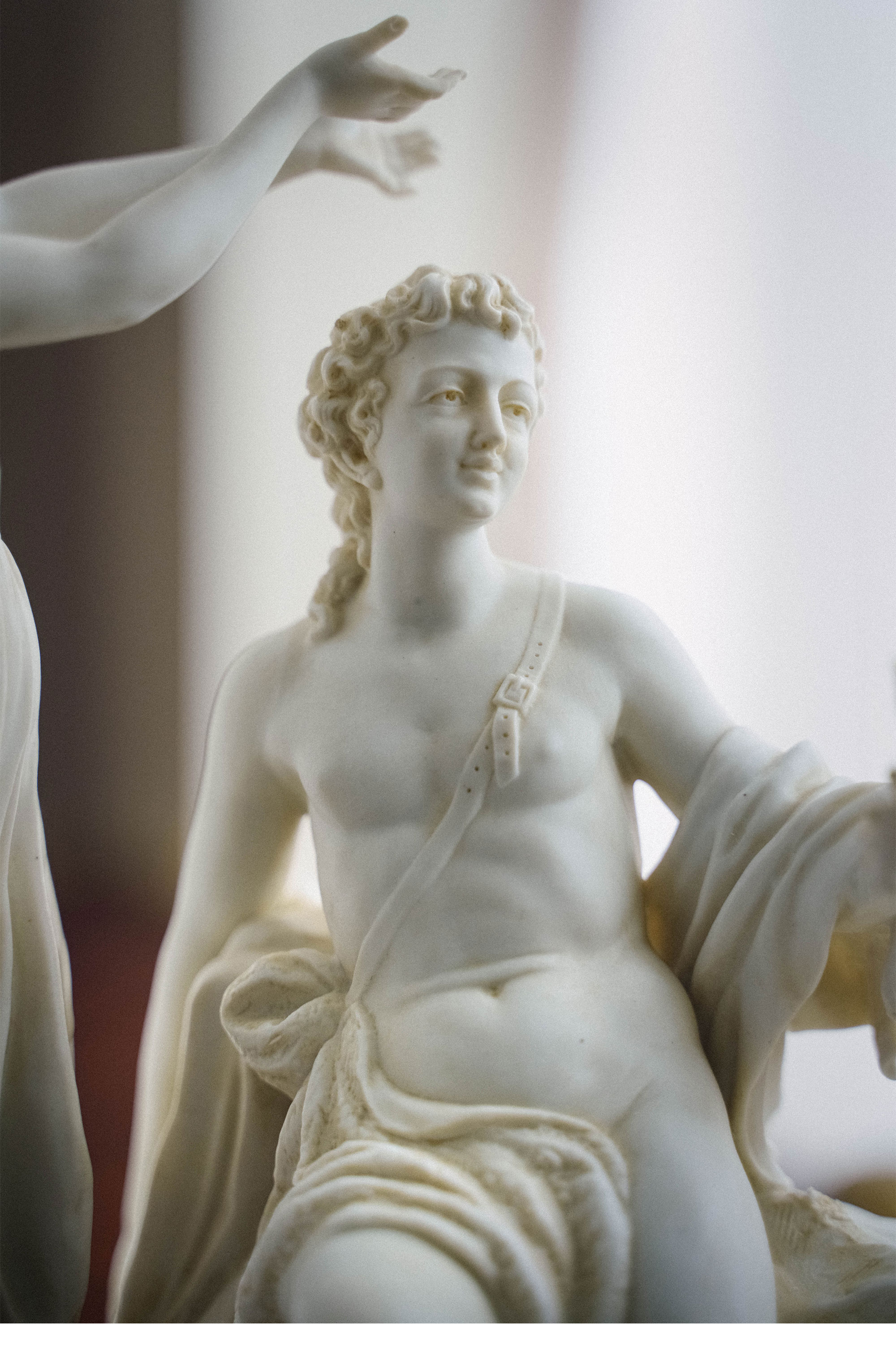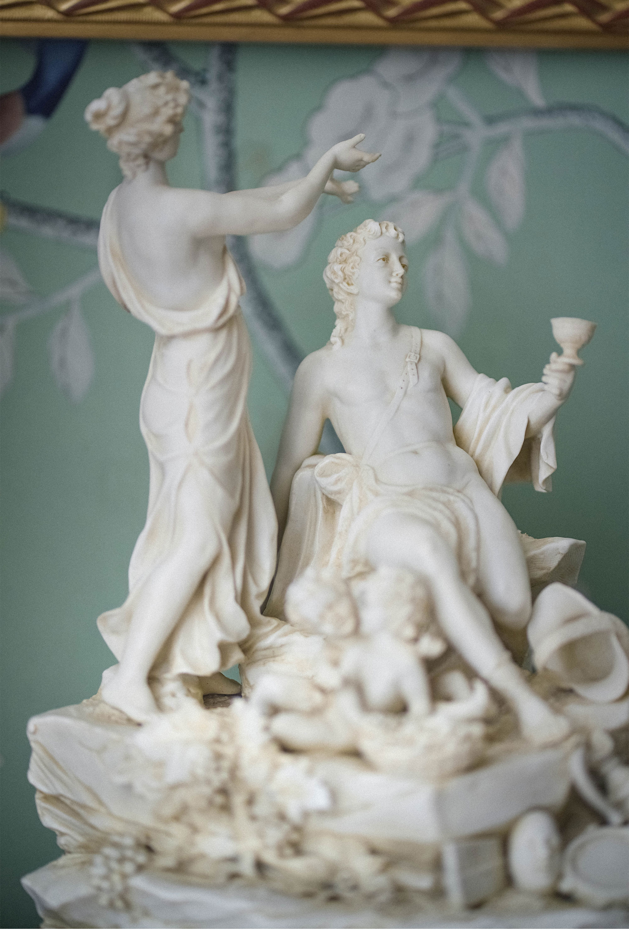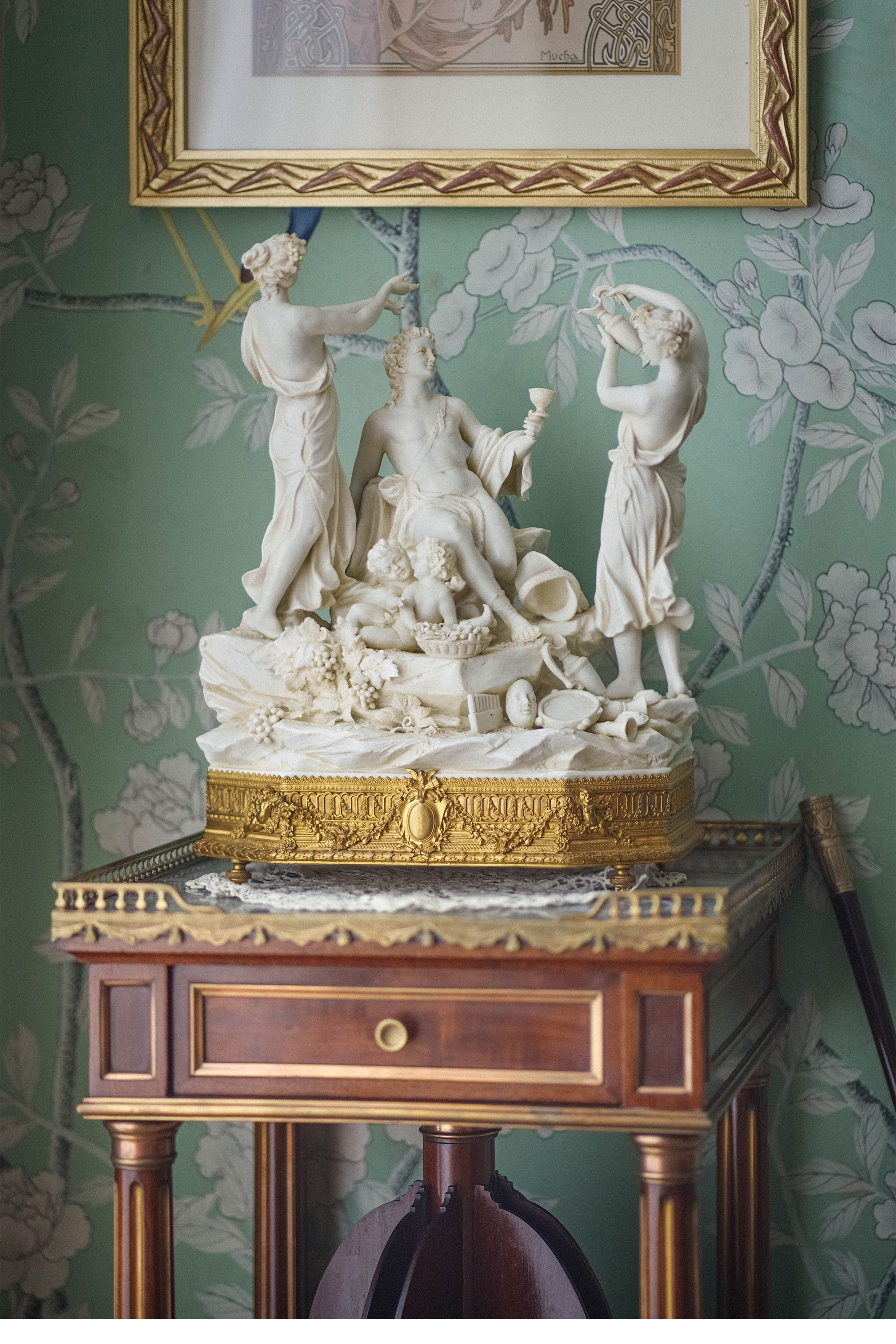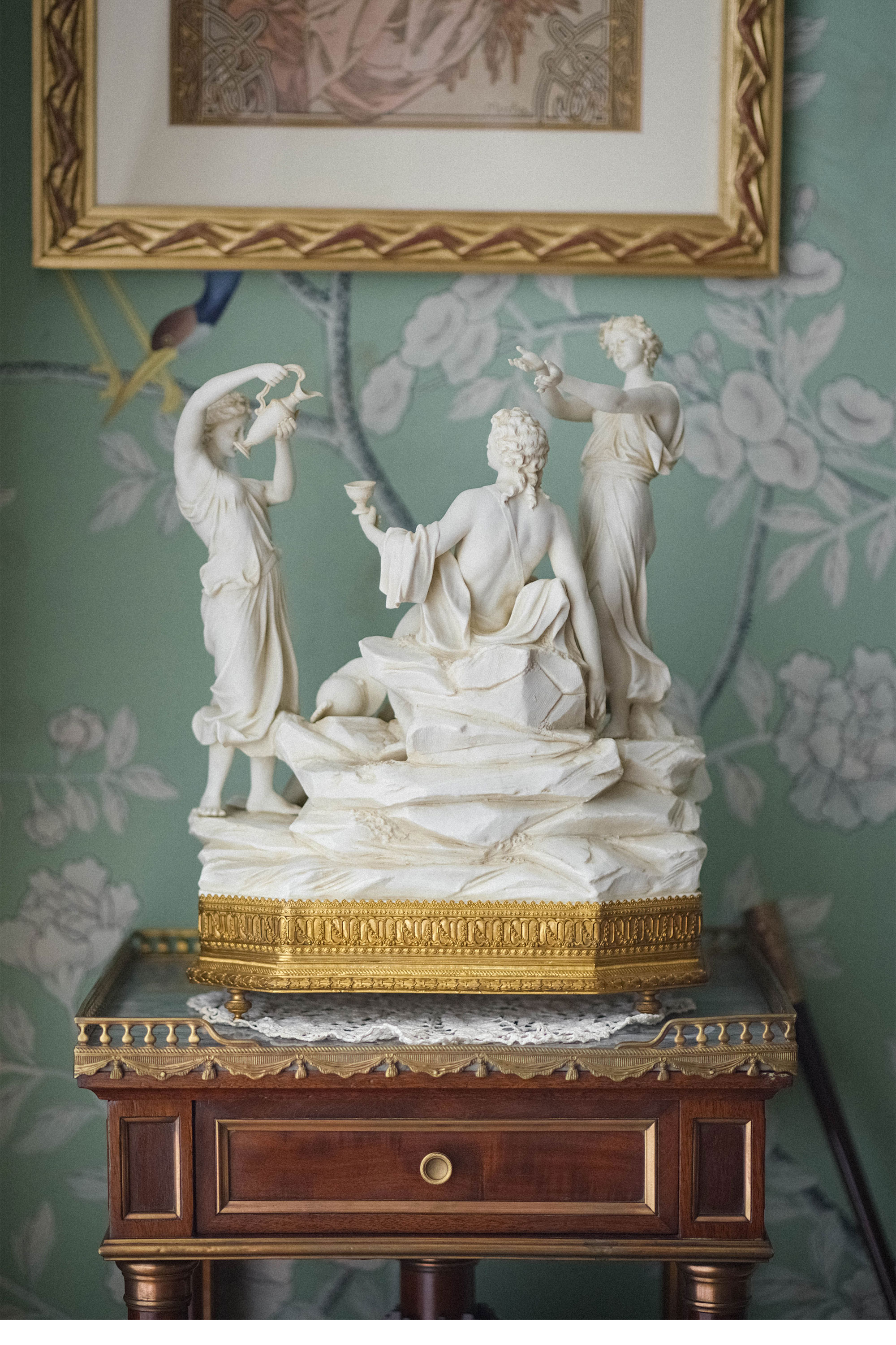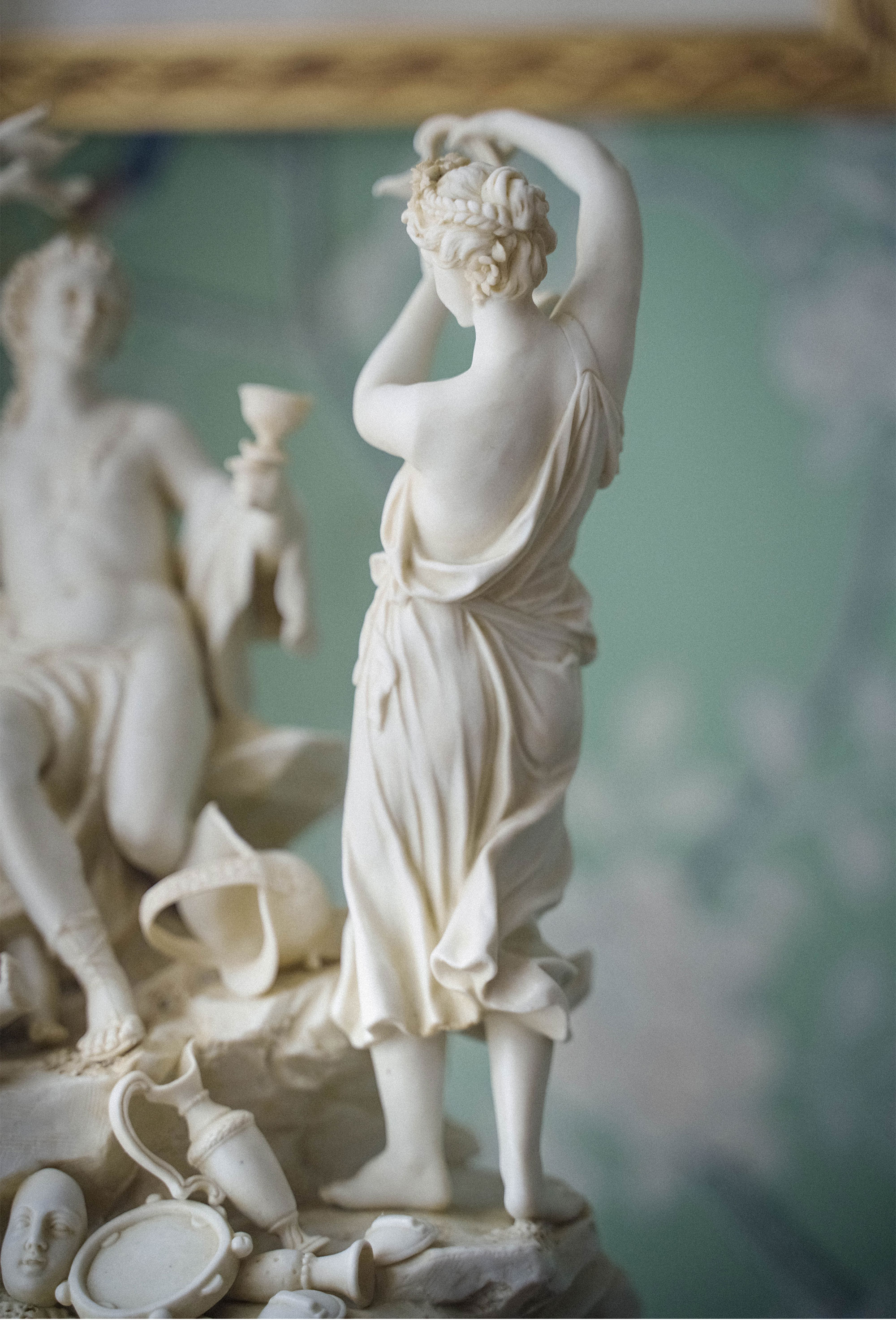 20世纪早期德国出品路易十六风格铜鎏金精雕底座嵌素胎瓷群雕「Bacchus & Bacchantes酒神巴克斯与女祭司」