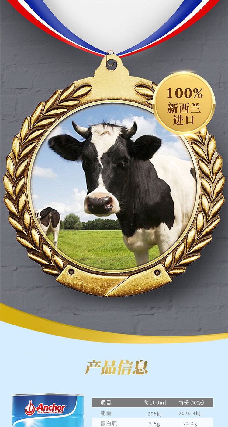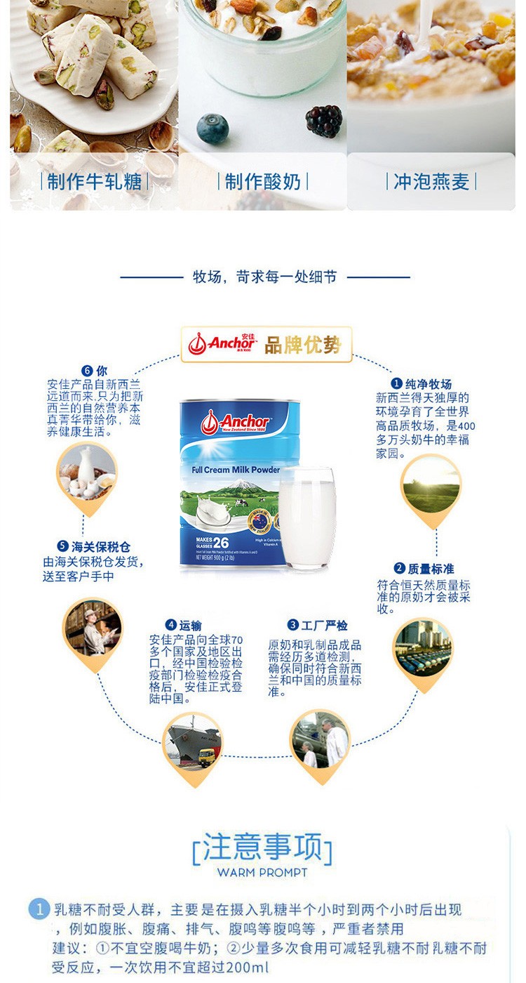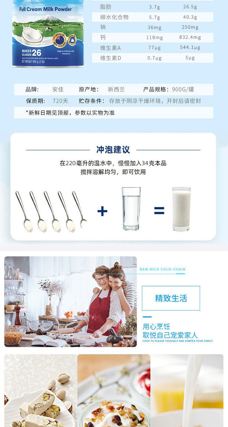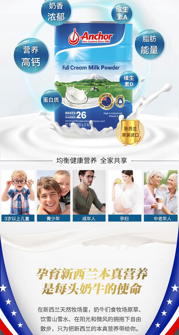【保税】新西兰进口Anchor安佳牛奶罐装全脂成人奶粉900g/罐