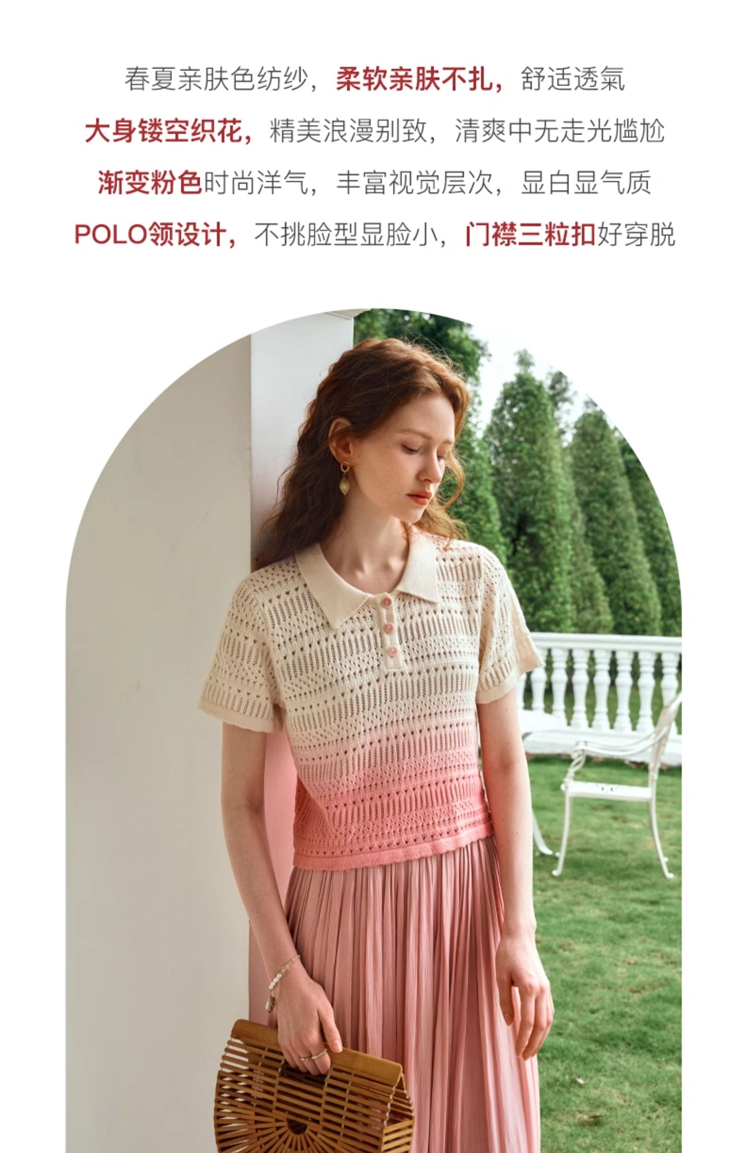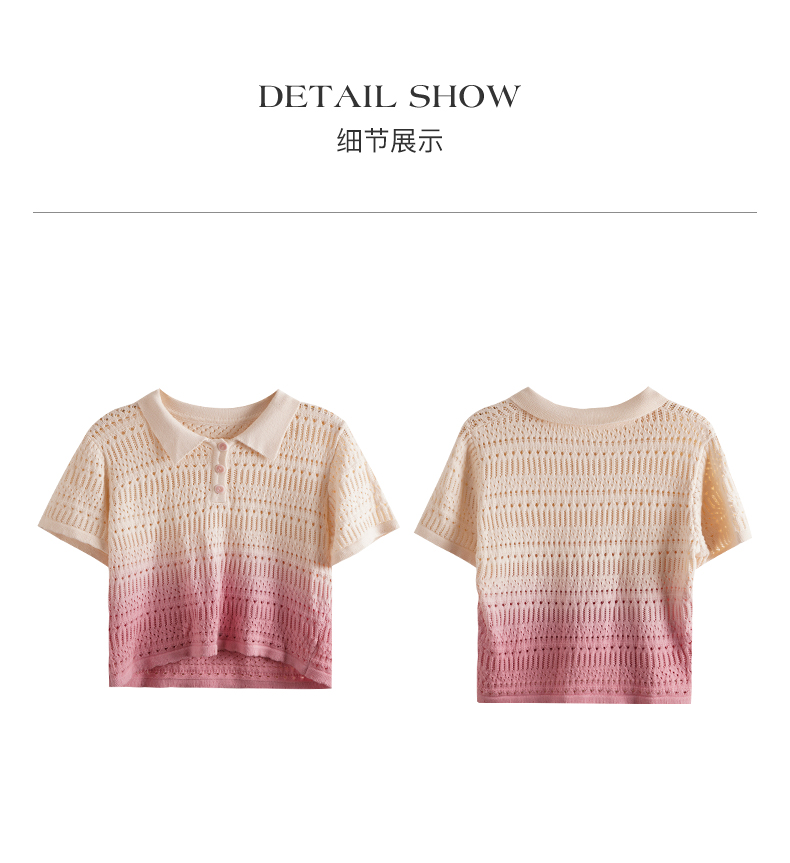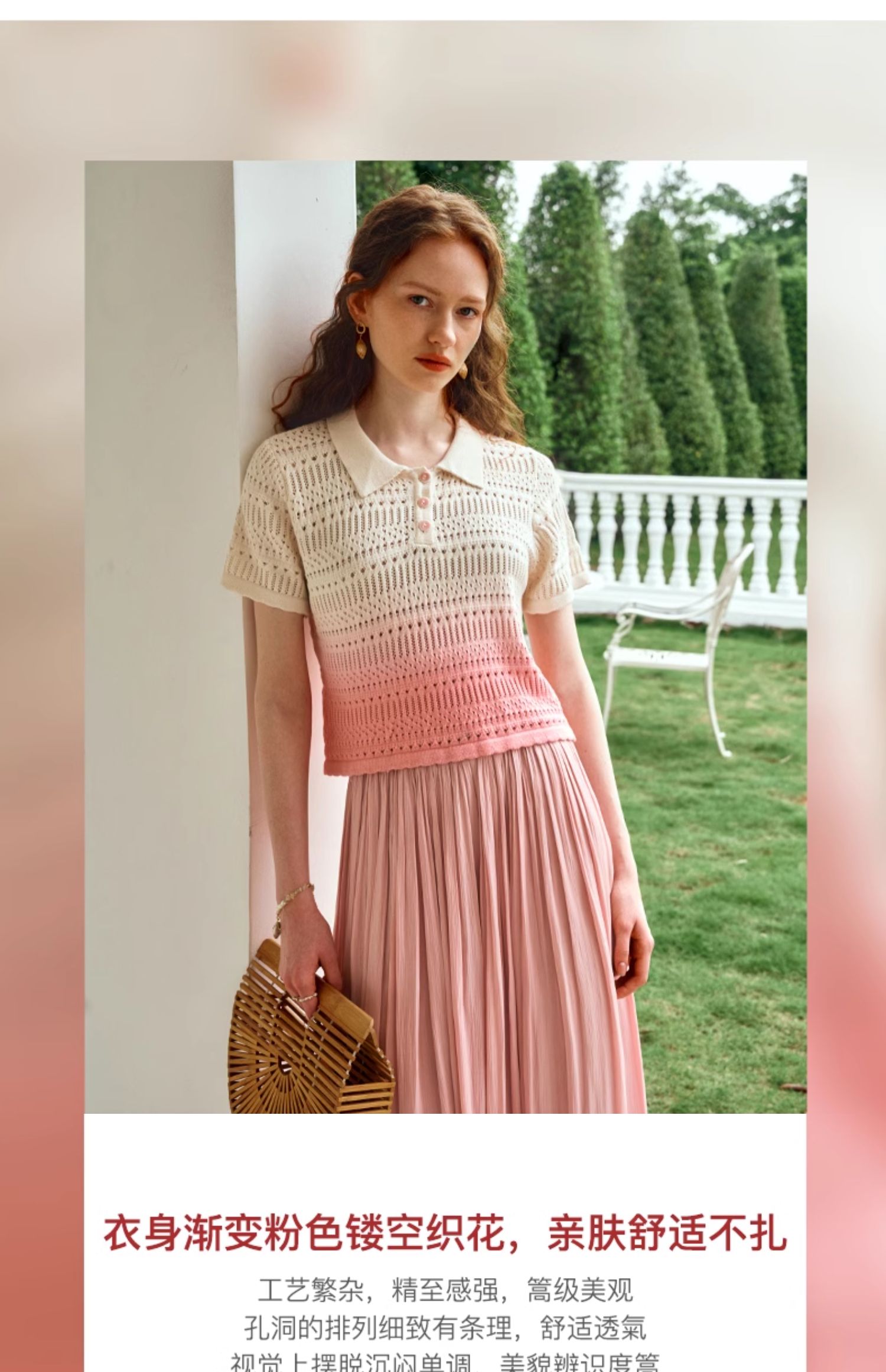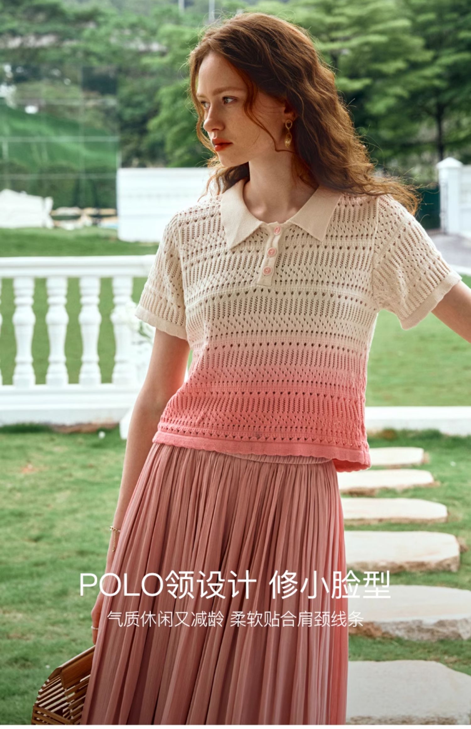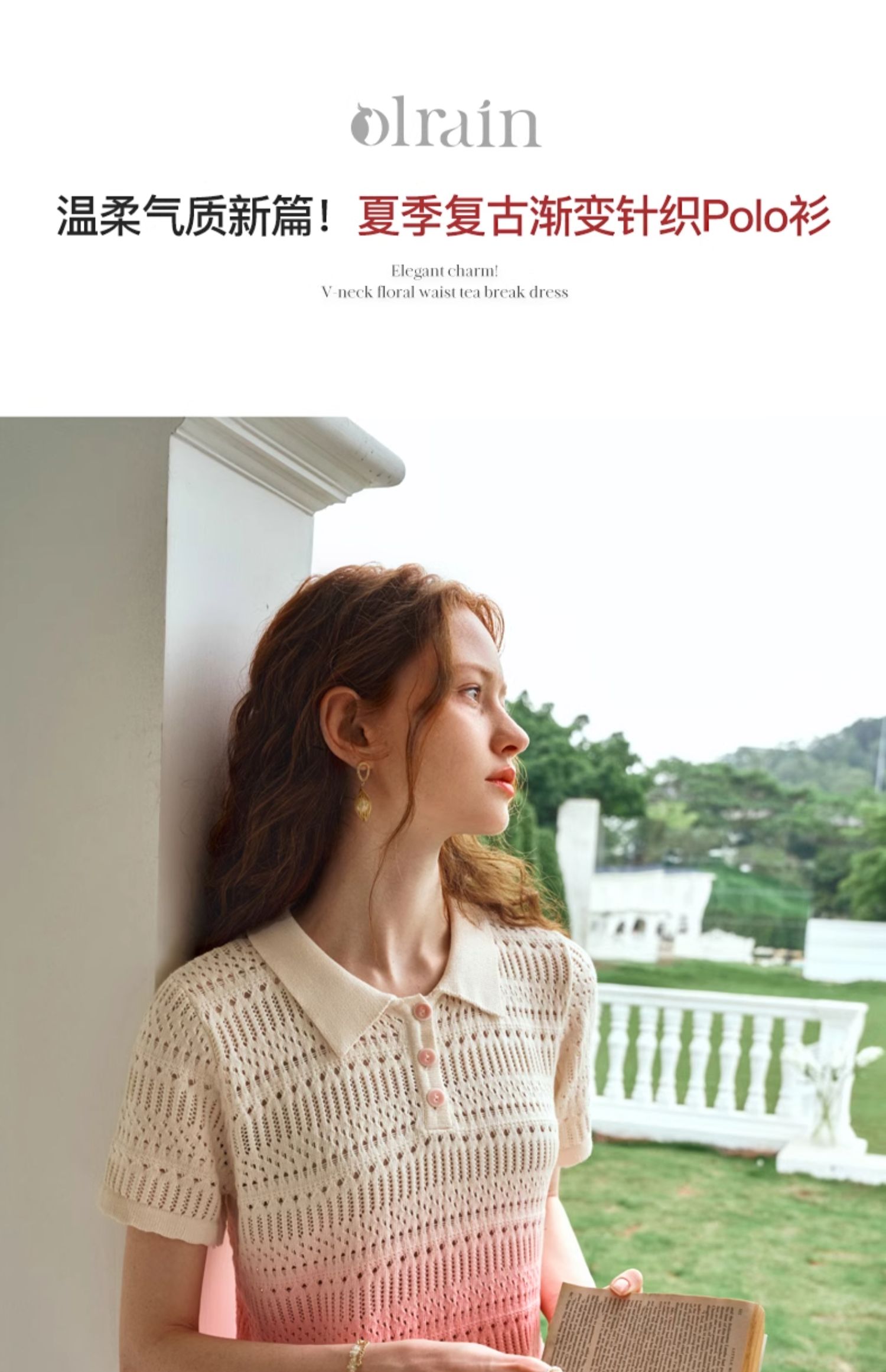 OLrain欧芮儿粉色POLO领针织衫女夏季2024年新款美式复古渐变短袖