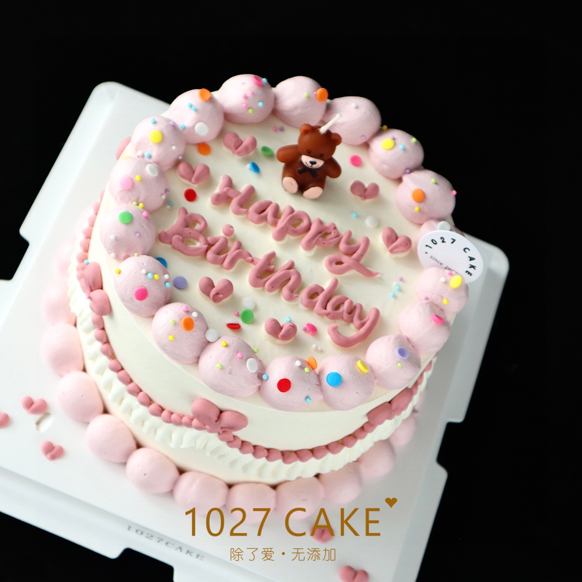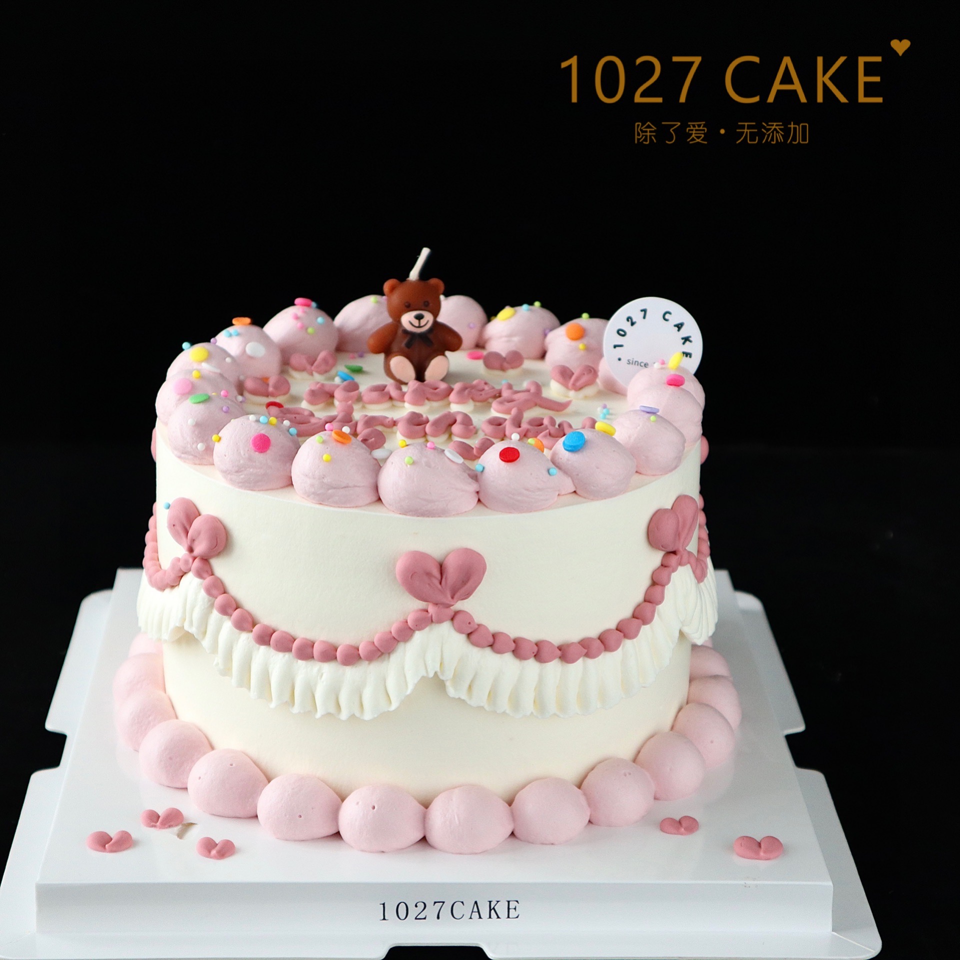 1027CAKE | 粉色花边蛋糕 小熊蜡烛 简约