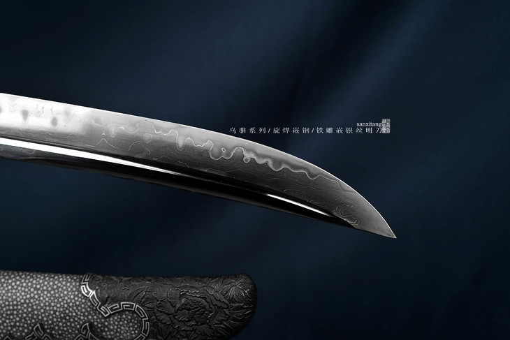 古法旋焊16000余层锻打 嵌钢工艺 大家可以看看刃部 纹路不是烧出来的 是整个刃口嵌了高硬度的钢 背部是硬度稍微低一点点的钢 这样子实用的时候会有一个缓冲 让这把东西兼顾硬度和韧性 经过手工高档研磨以后 纹路非常漂亮 表面非常柔顺 在灯光下看不出来一丝黑色的脏东西 很好的收藏选择 难道的东西!