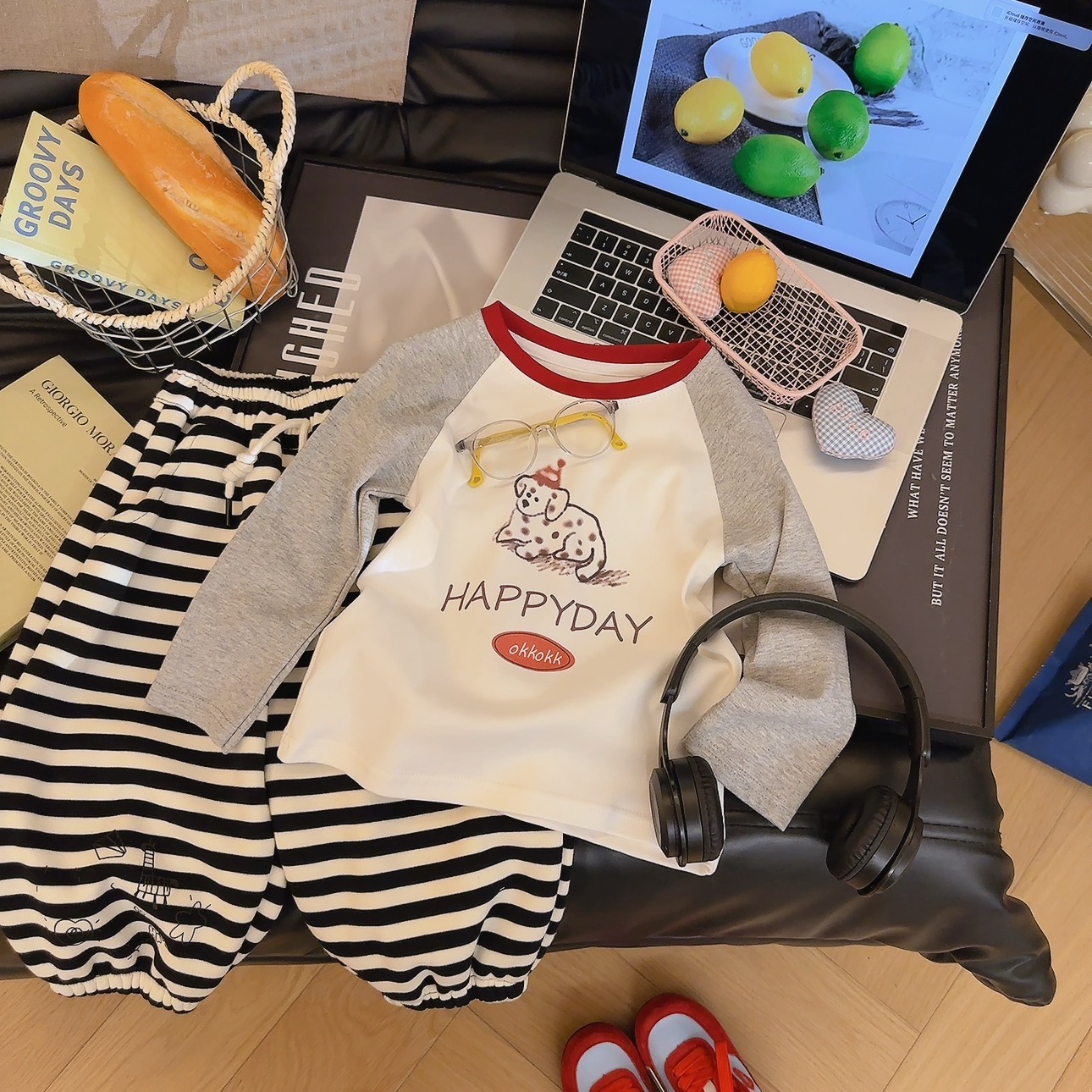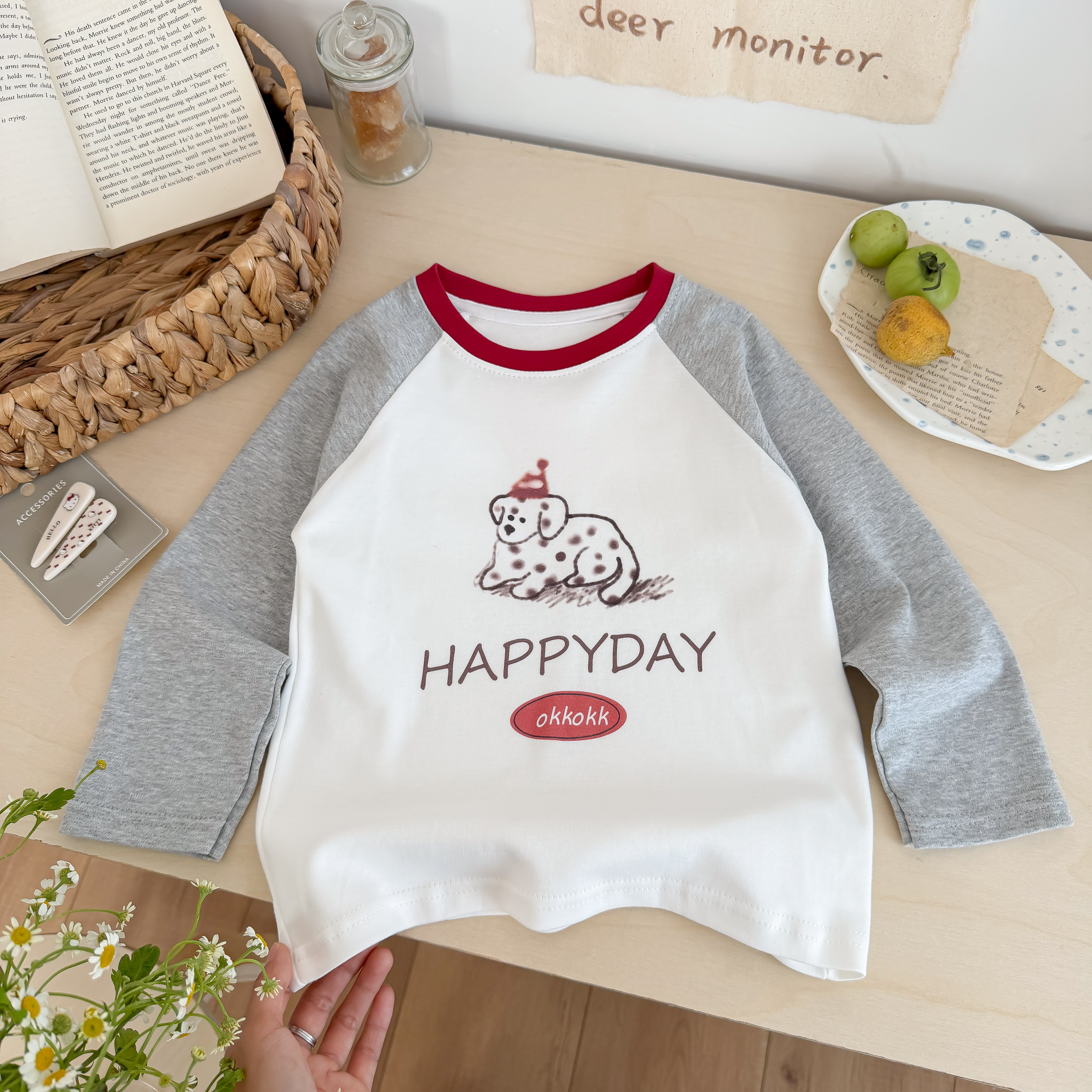 🤍 简约灰白撞色(红领点缀),戴帽斑点狗 +“HAPPYDAY” 字样,元气男童款!
