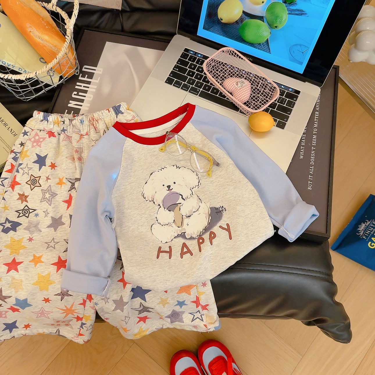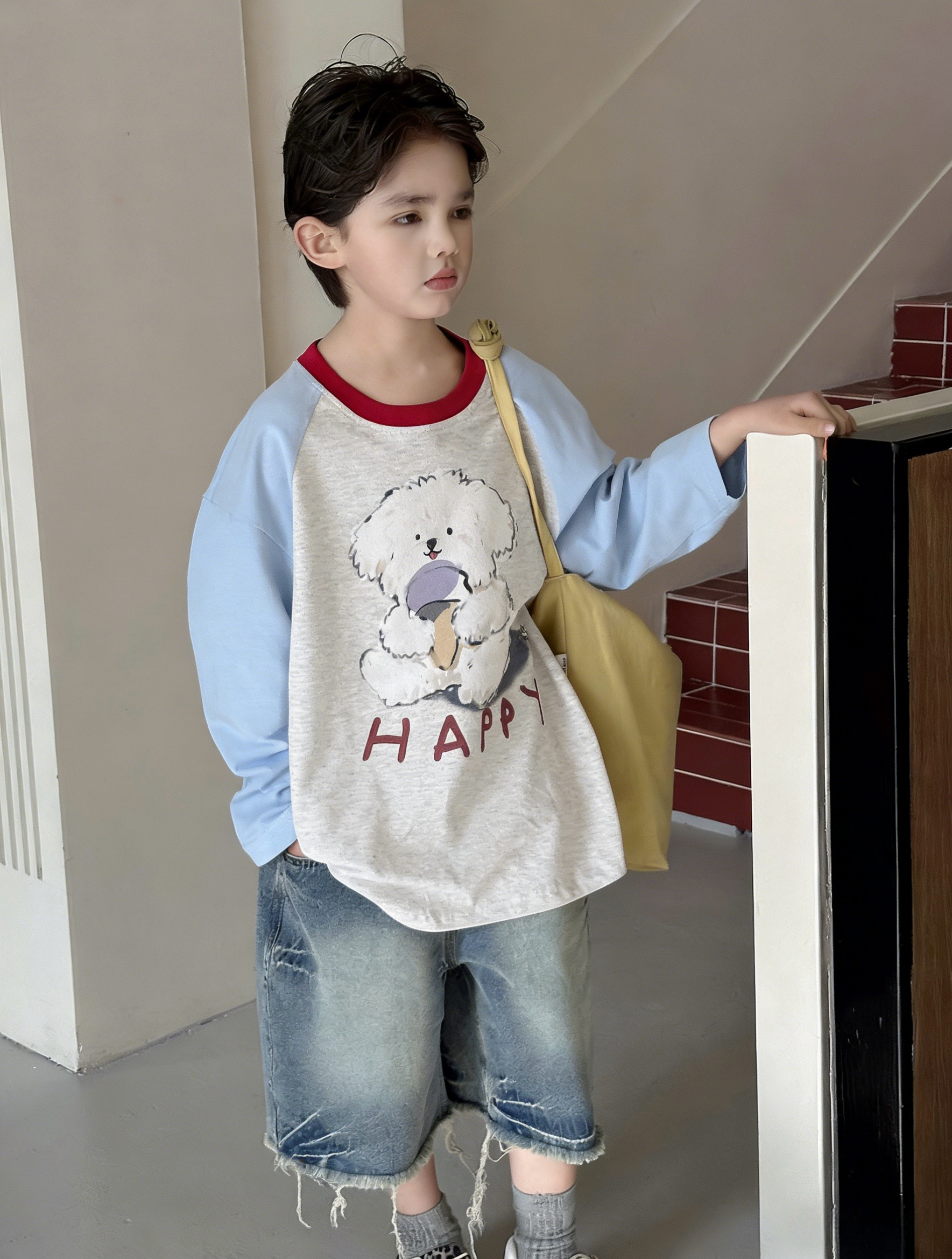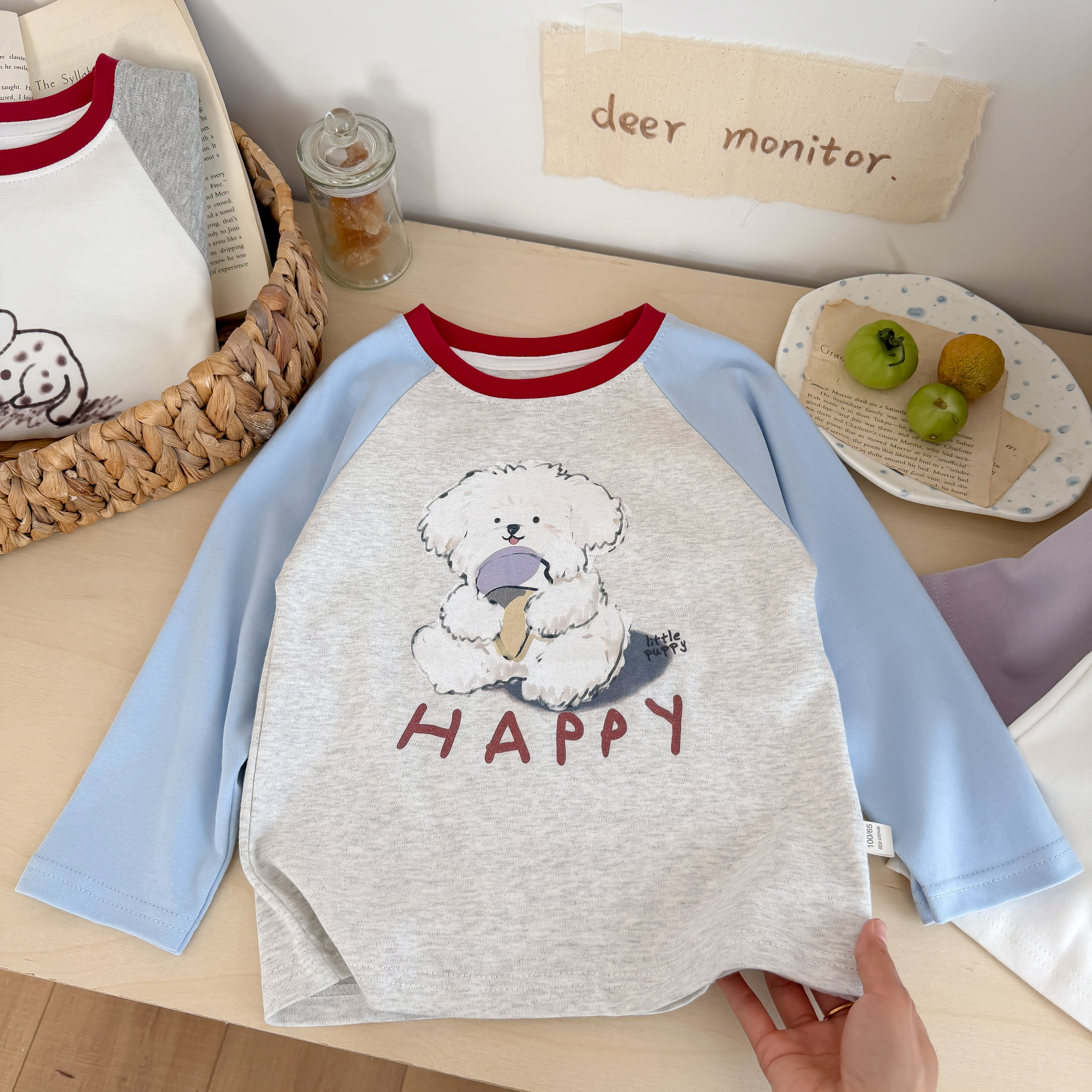 🩵 清爽浅蓝灰撞色(红领点缀),抱杯小白狗 +“HAPPY” 字母,活泼男童款!