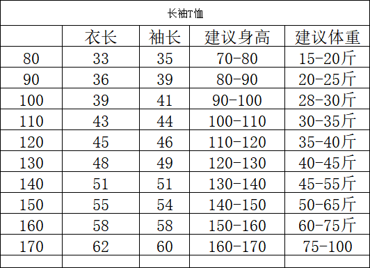 尺码表: