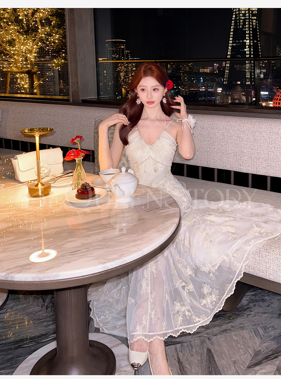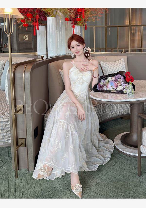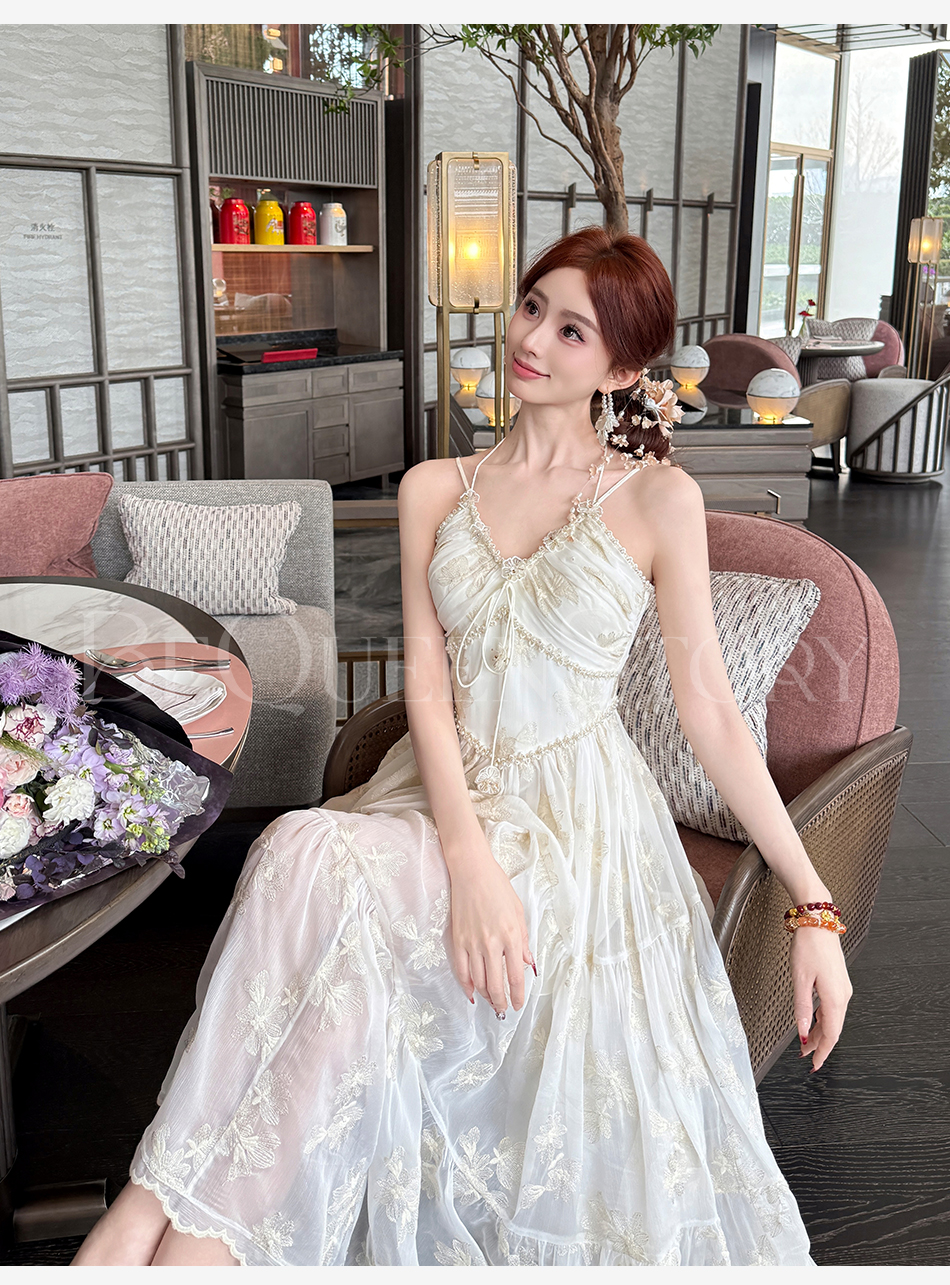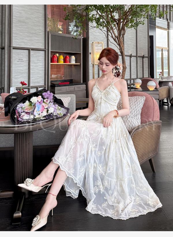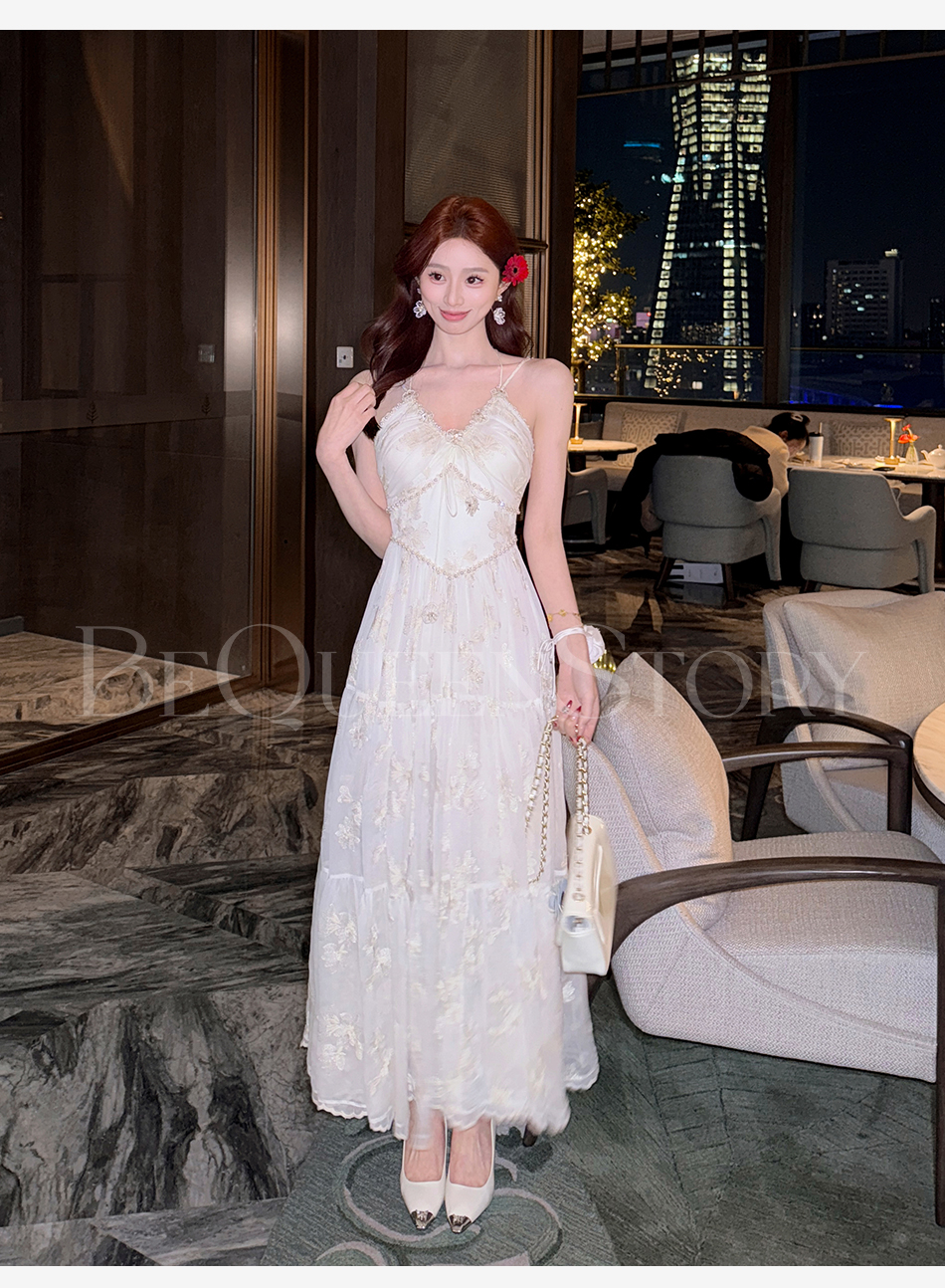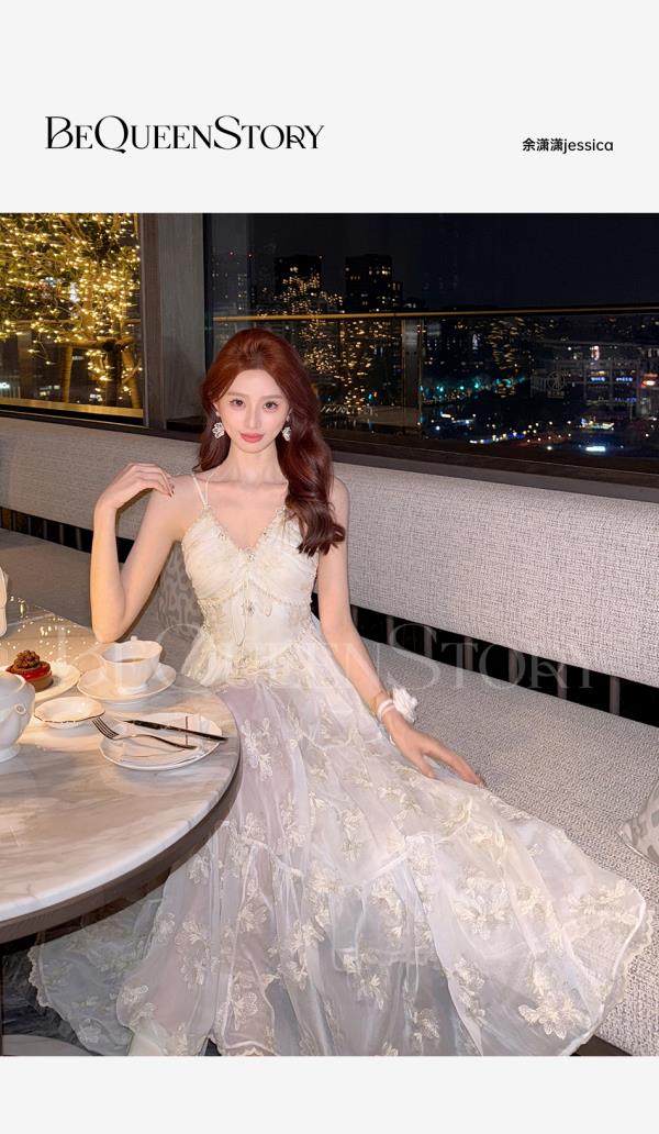 余潇潇【西域女神】金丝绣花吊带收腰连衣裙精致轻奢2025春装新款