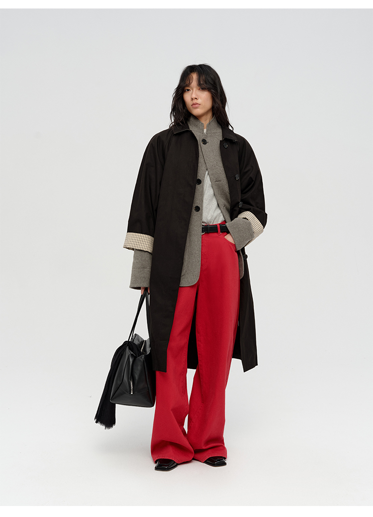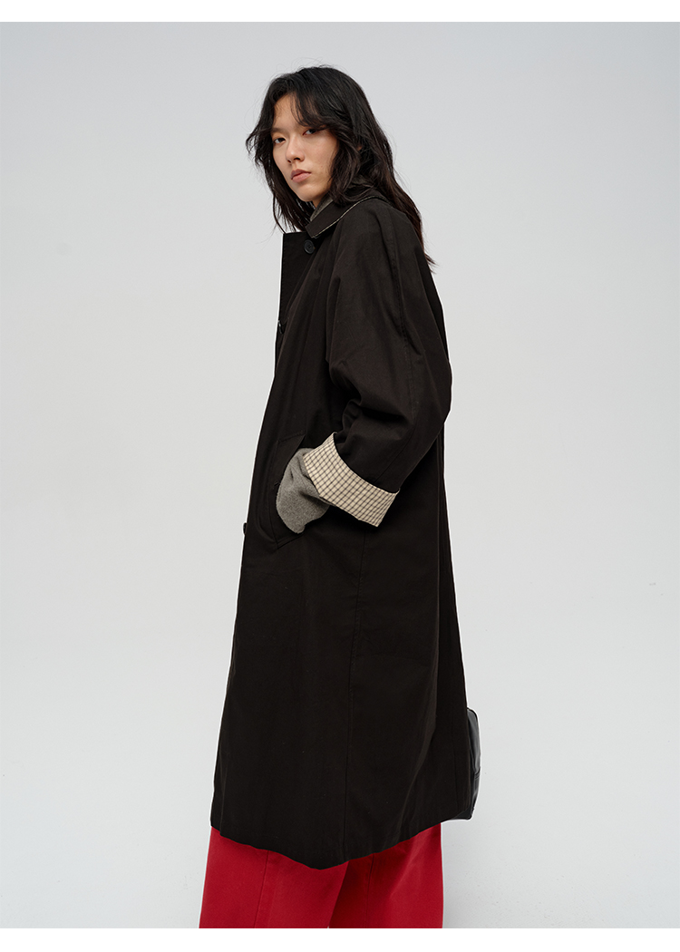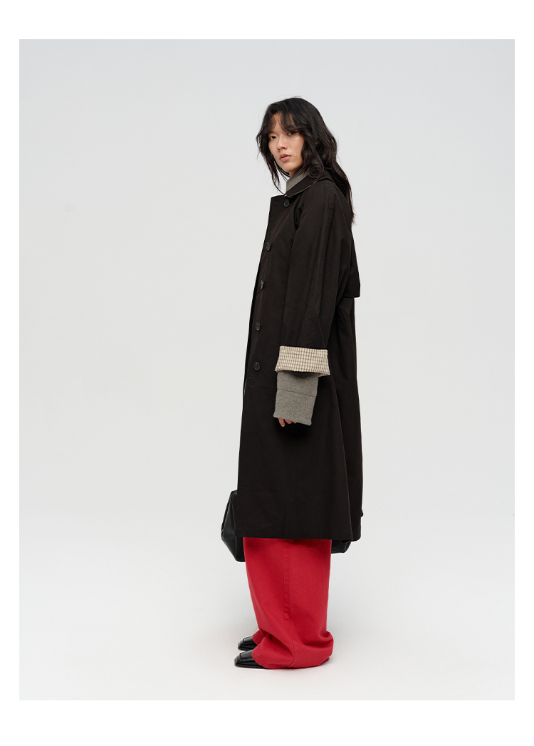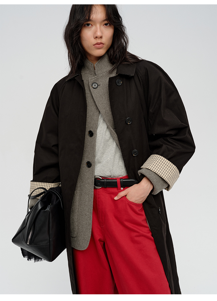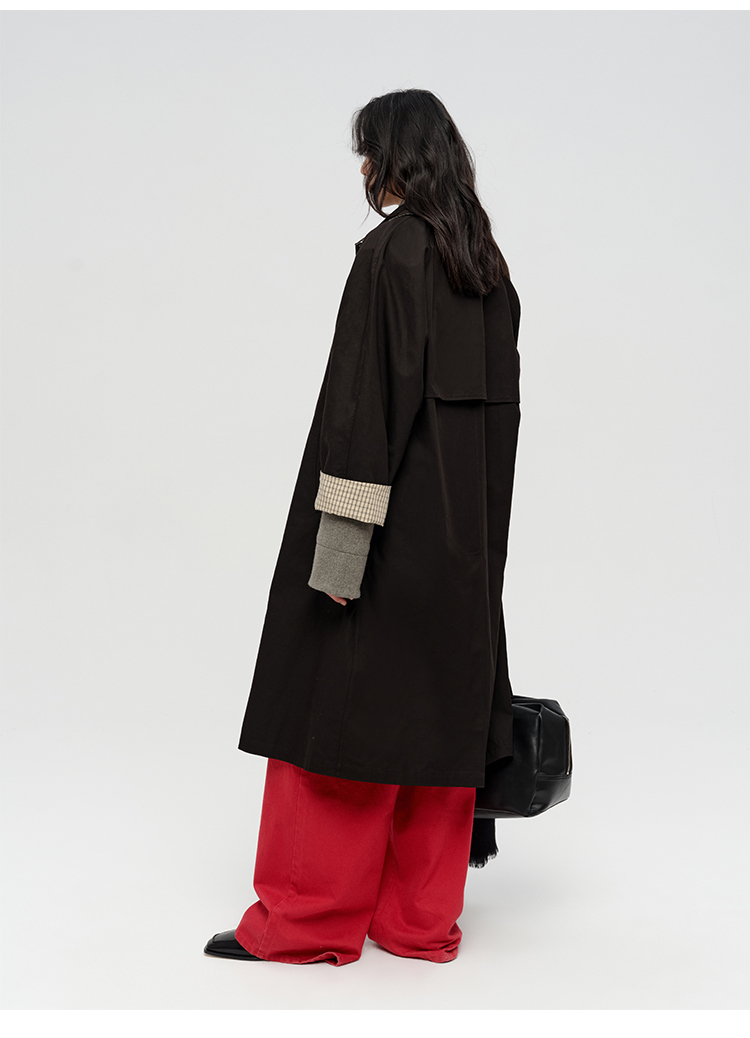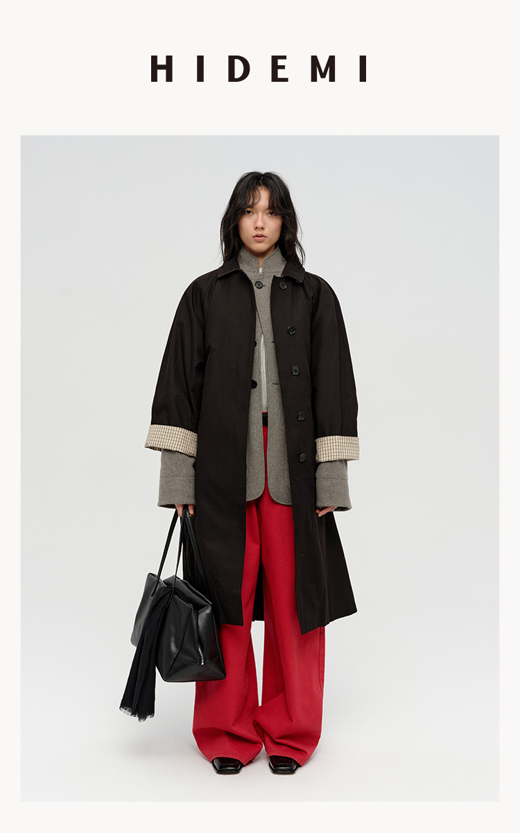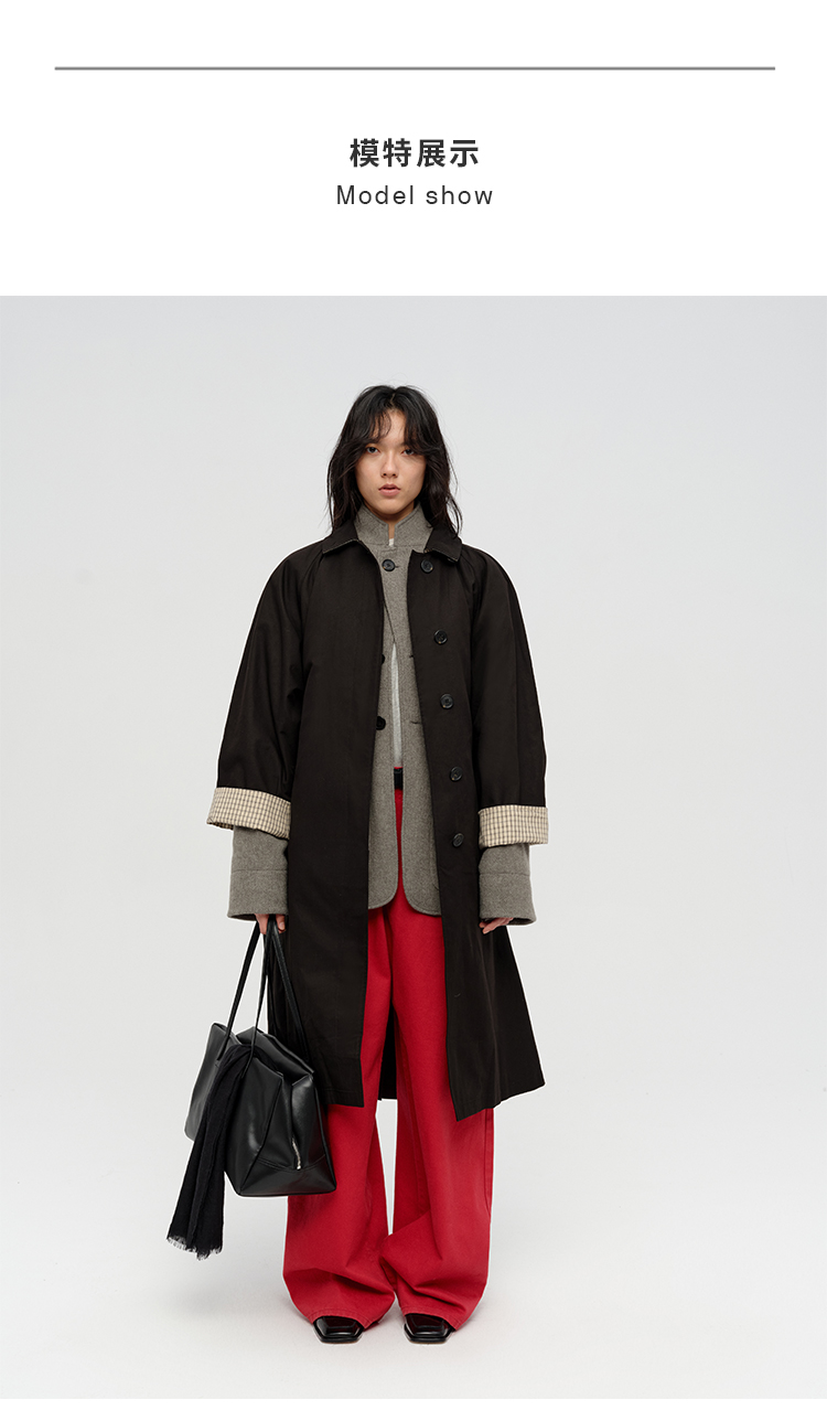 HIDEMI【吴千语同款】极简廓形设计感复古宽肩格纹拼接卷边式长款风衣 黑色/卡其色