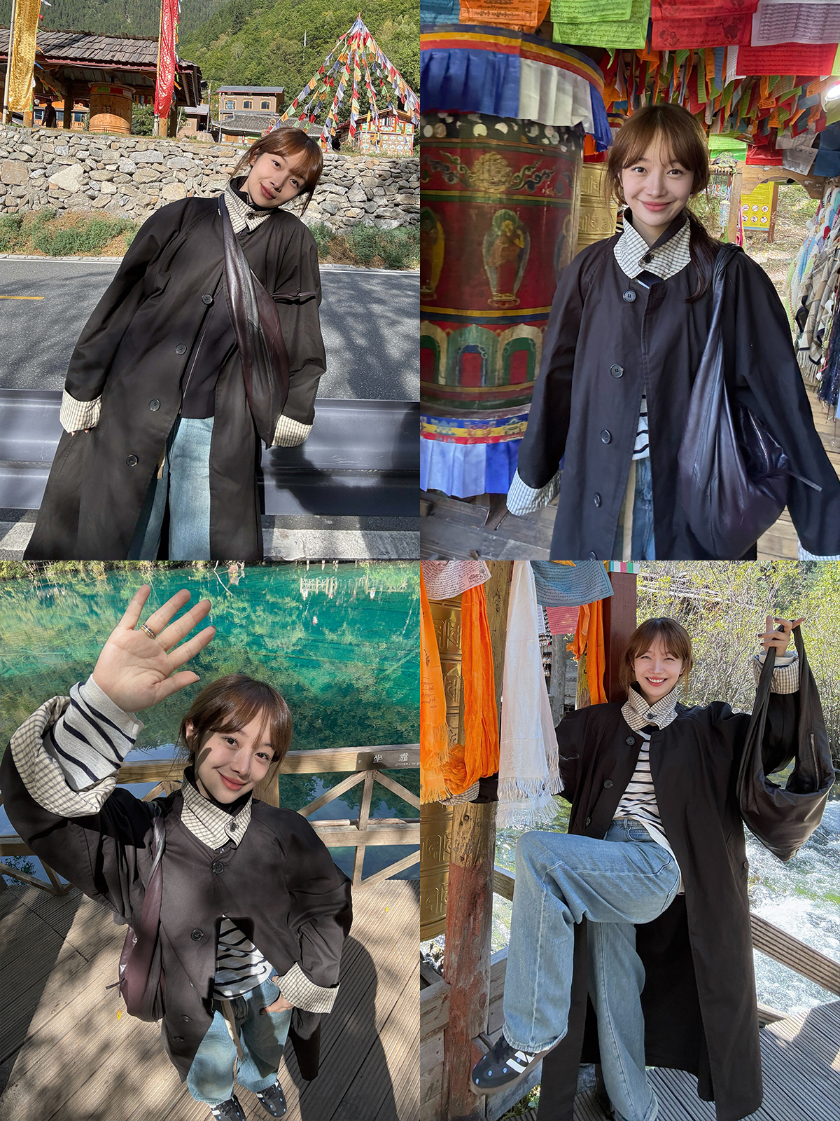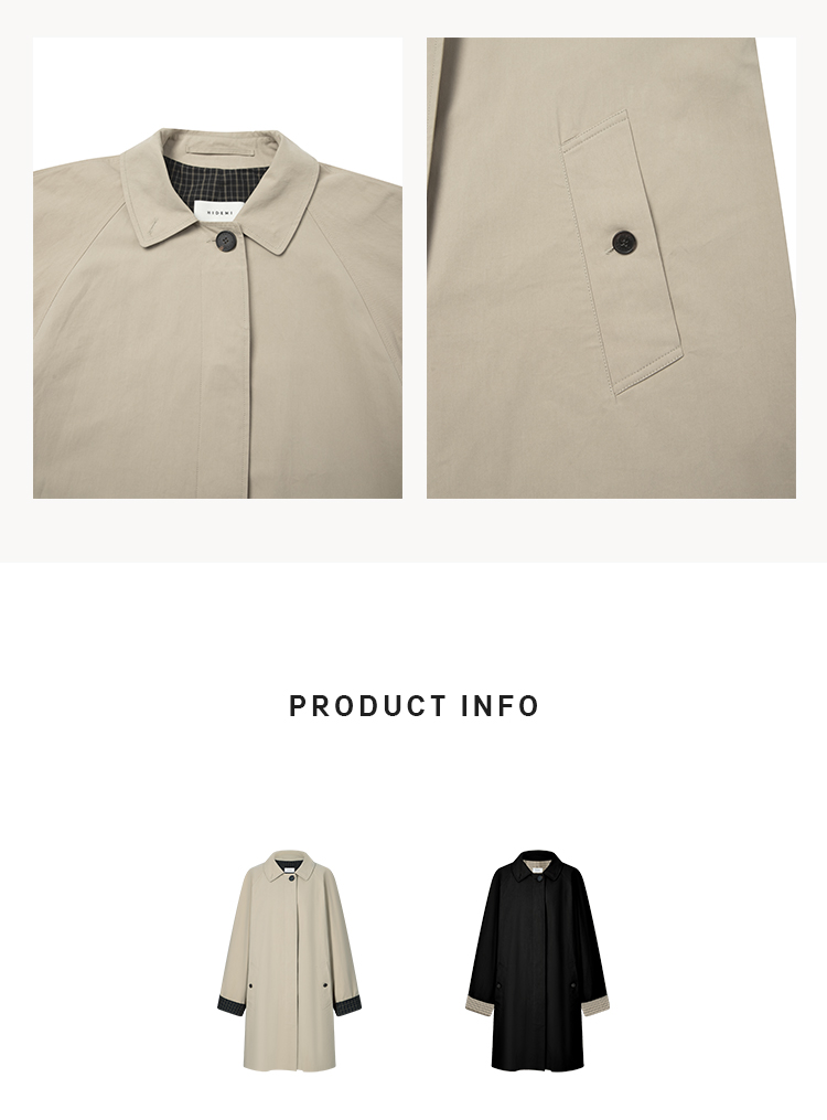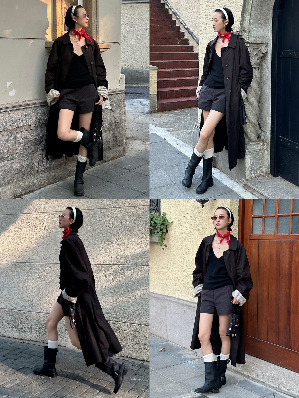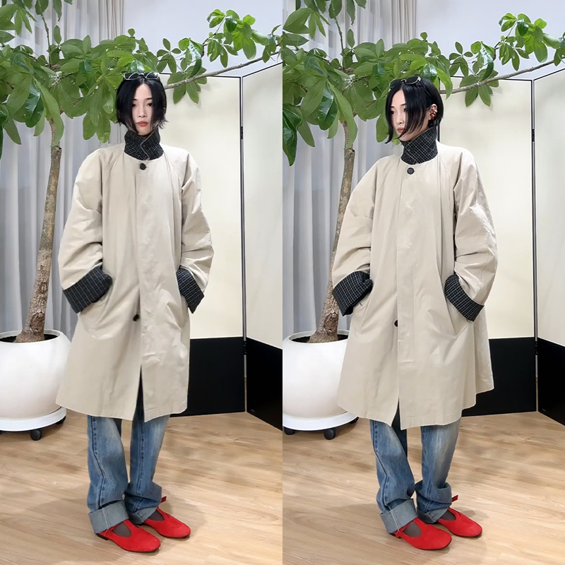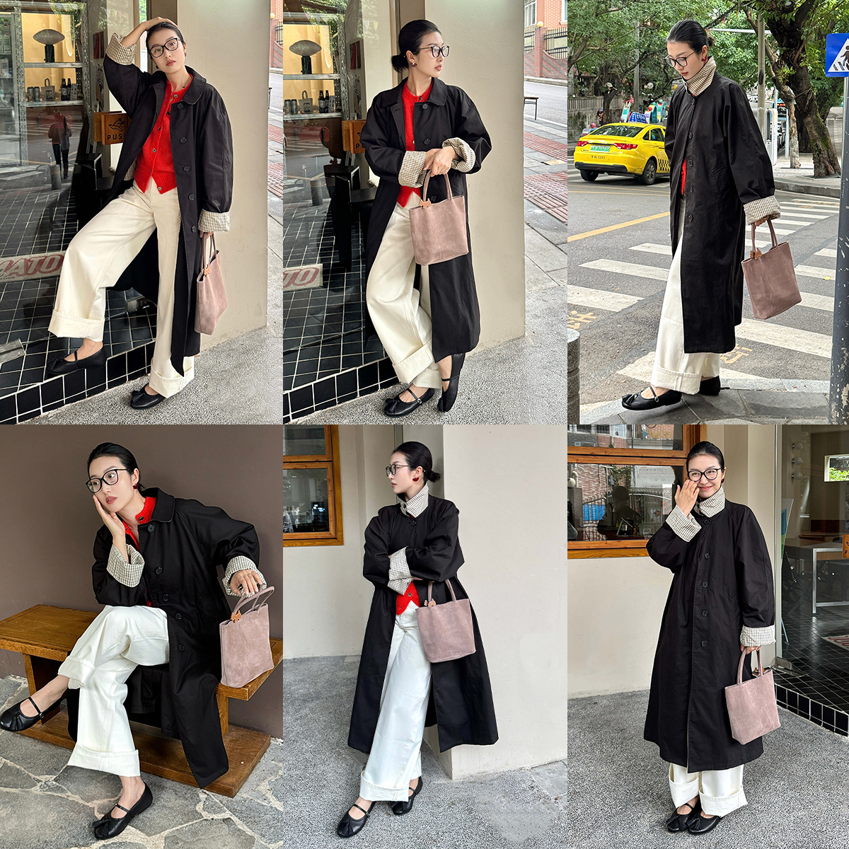 HIDEMI【吴千语同款】极简廓形设计感复古宽肩格纹拼接卷边式长款风衣 黑色/卡其色