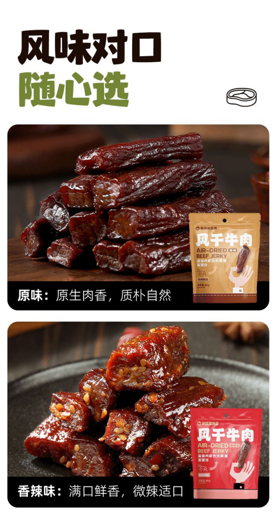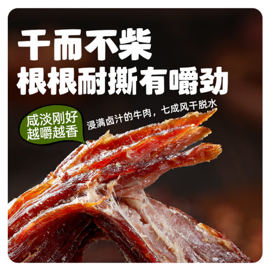 经过七成风干脱水处理的牛肉干,干而不柴,口感十足。无论你是追剧时的小零食,还是运动后的能量补给,它都能给你带来独特的咀嚼体验。