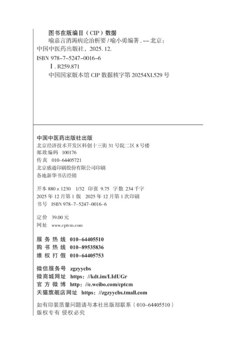 喻嘉言消渴病论治析要 喻小勇 编著 消渴病机理论的承启与突破 学术传承与流派发展 临床医学 9787524700166 中国中医药出版社