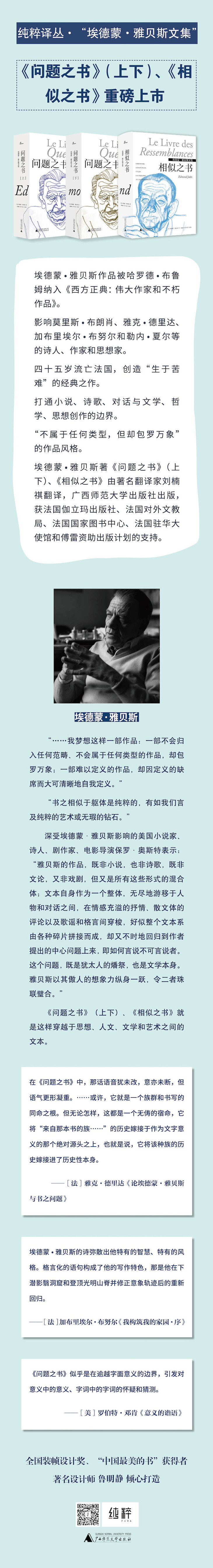 纯粹译丛“埃蒙德•雅贝斯作品系列”重磅完美收官之作:被列入西方正典、法国著名思想家埃德蒙•雅贝斯《边缘之书》中文版首次面世,文笔洋溢浓郁的诗意,闪耀一个哲学家的深邃思考。