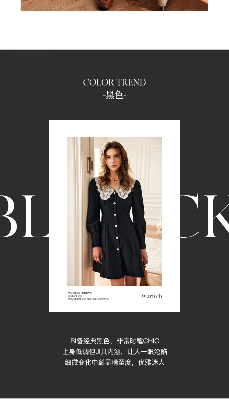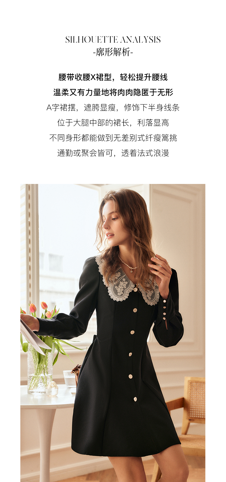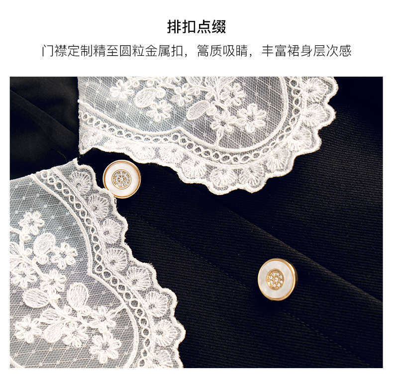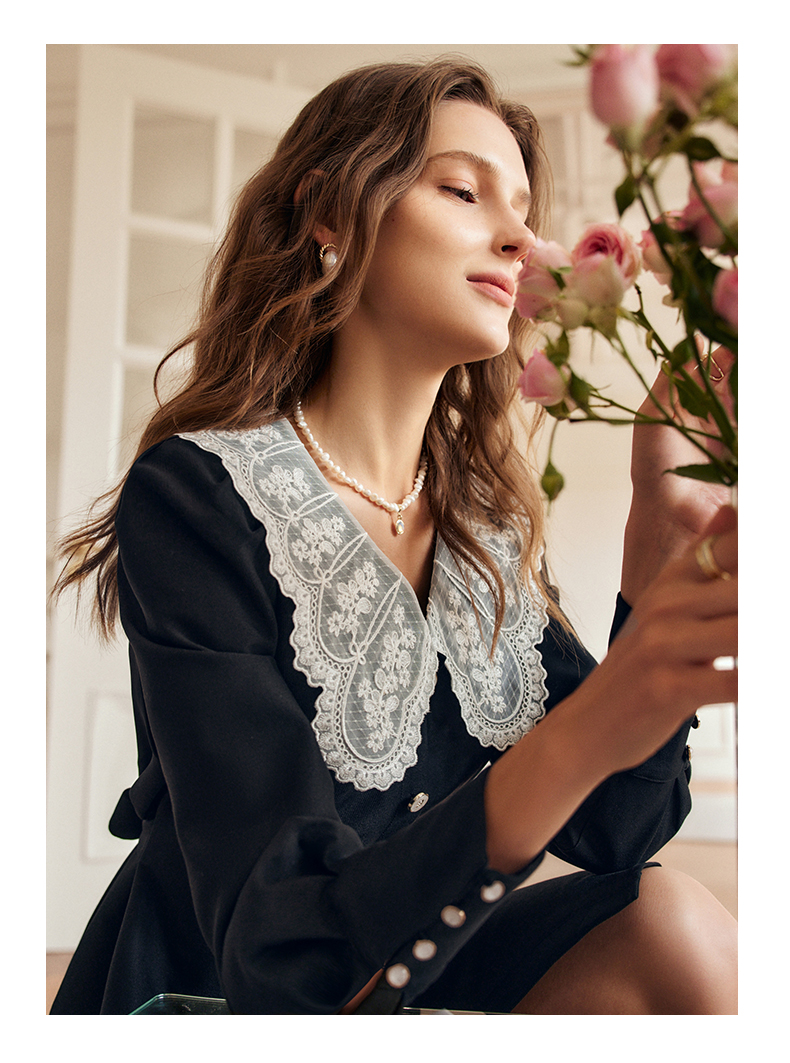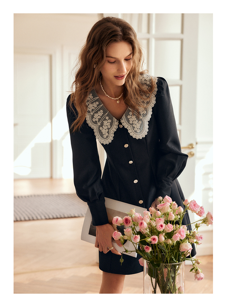 欧芮儿黑色西装连衣裙女秋季2022新款收腰显瘦法式蕾丝领设计感裙