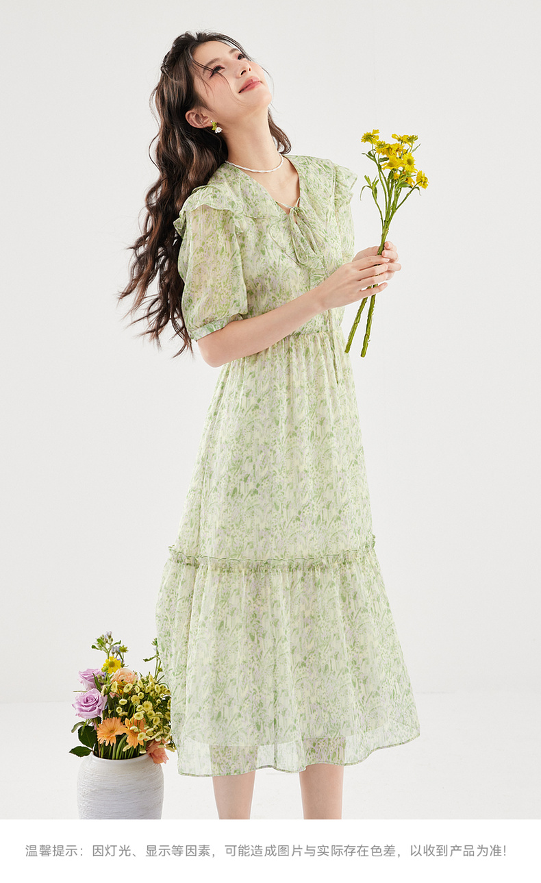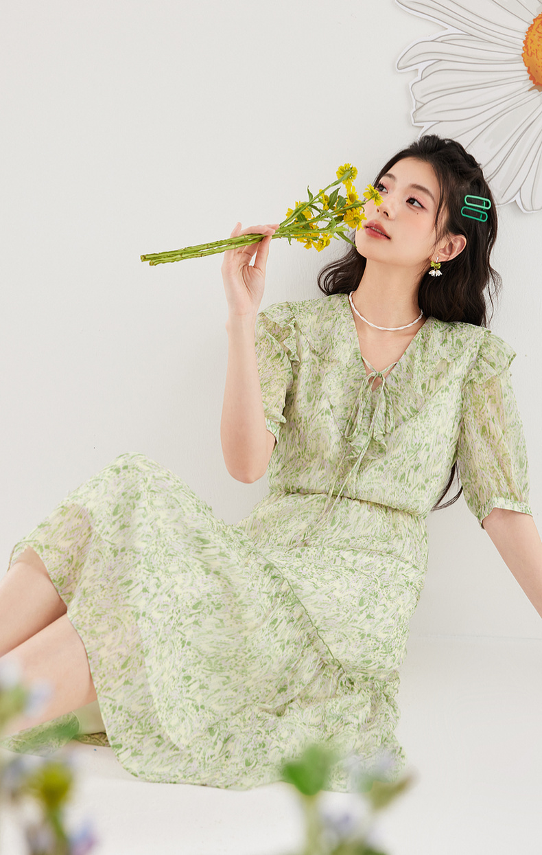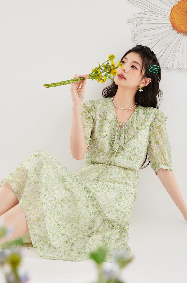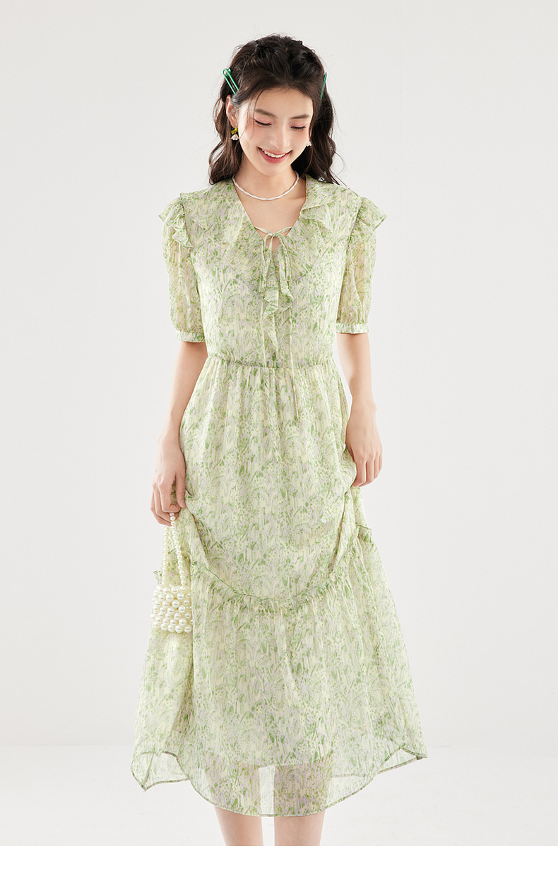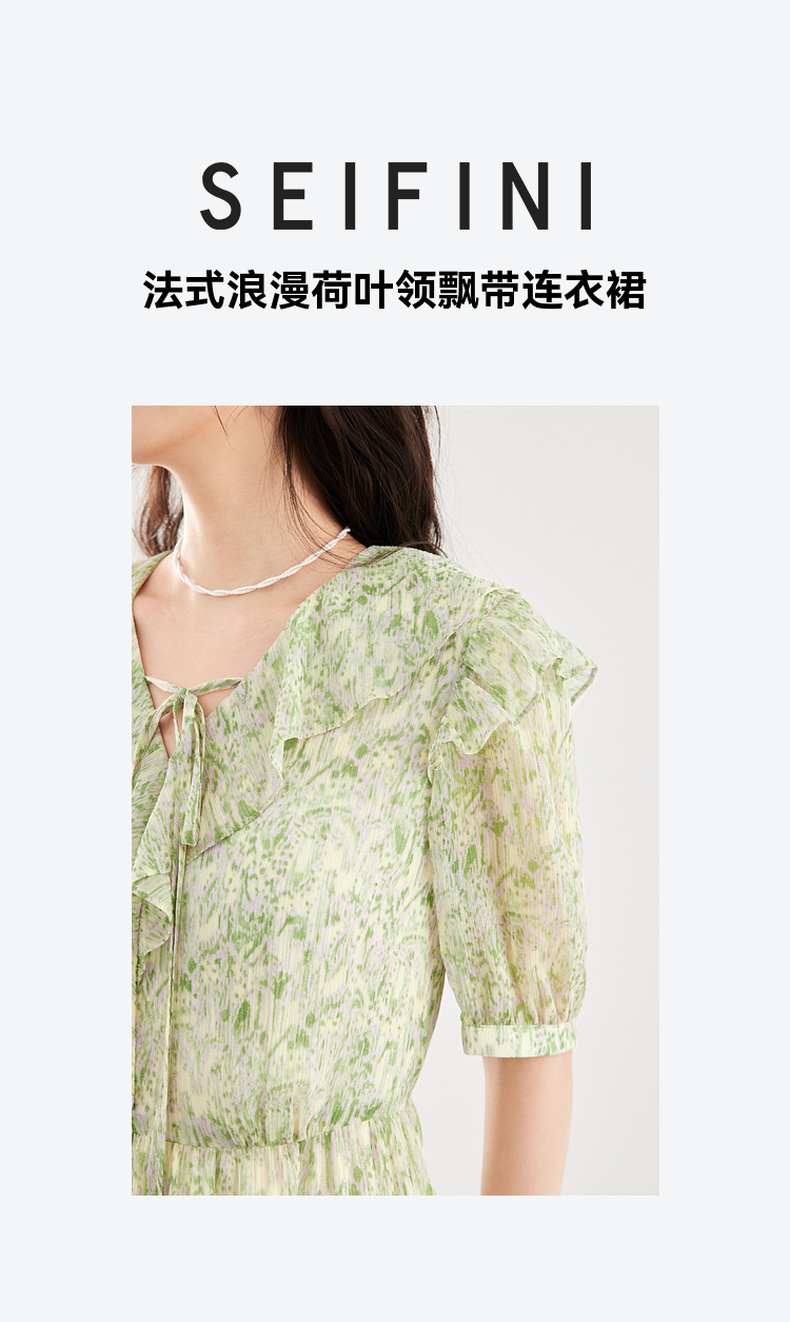 【严选】诗凡黎绿色浪漫荷叶边飘带碎花连衣裙2024年夏新款薄荷曼波长裙女SF4391061