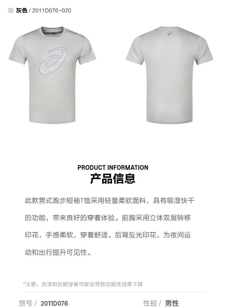 【退仓勿拍】ASICS亚瑟士新款男式吸湿快干跑步短袖套头圆领运动舒适透气T恤2011D076