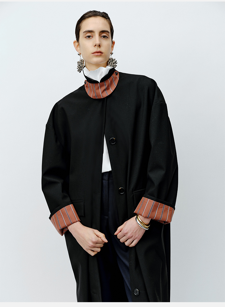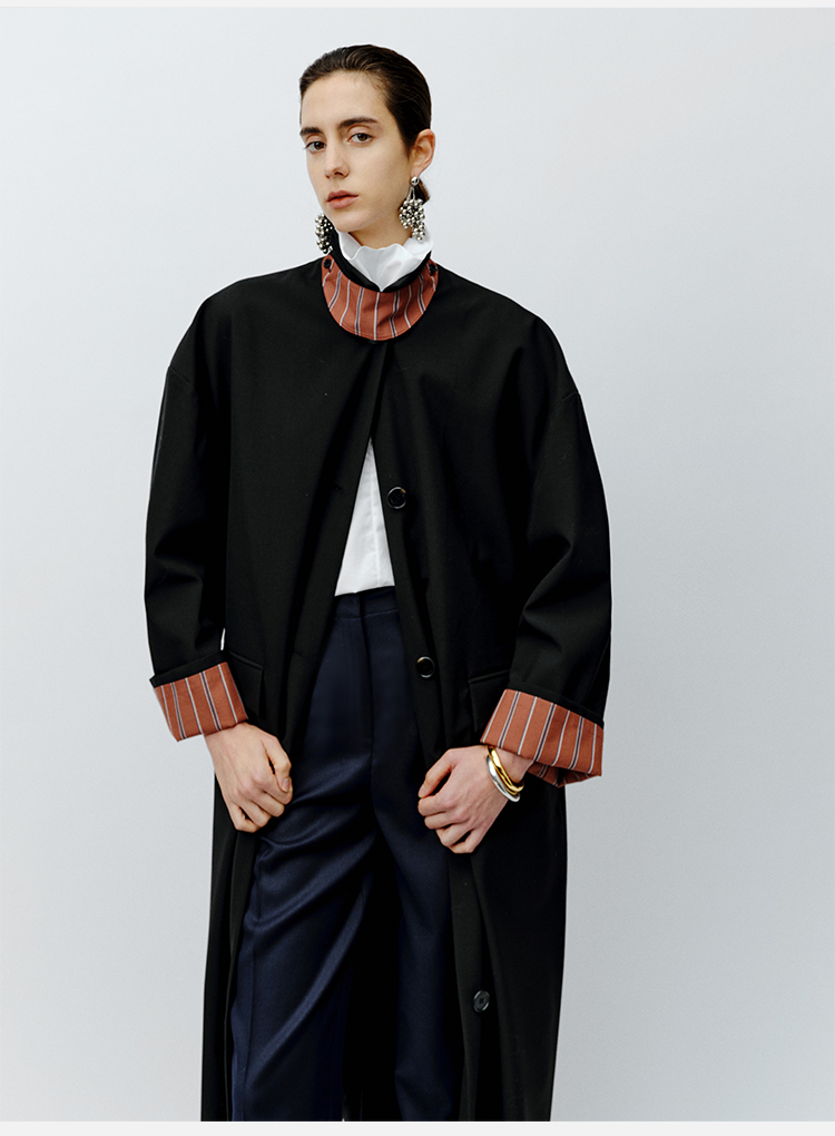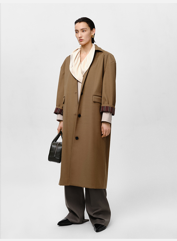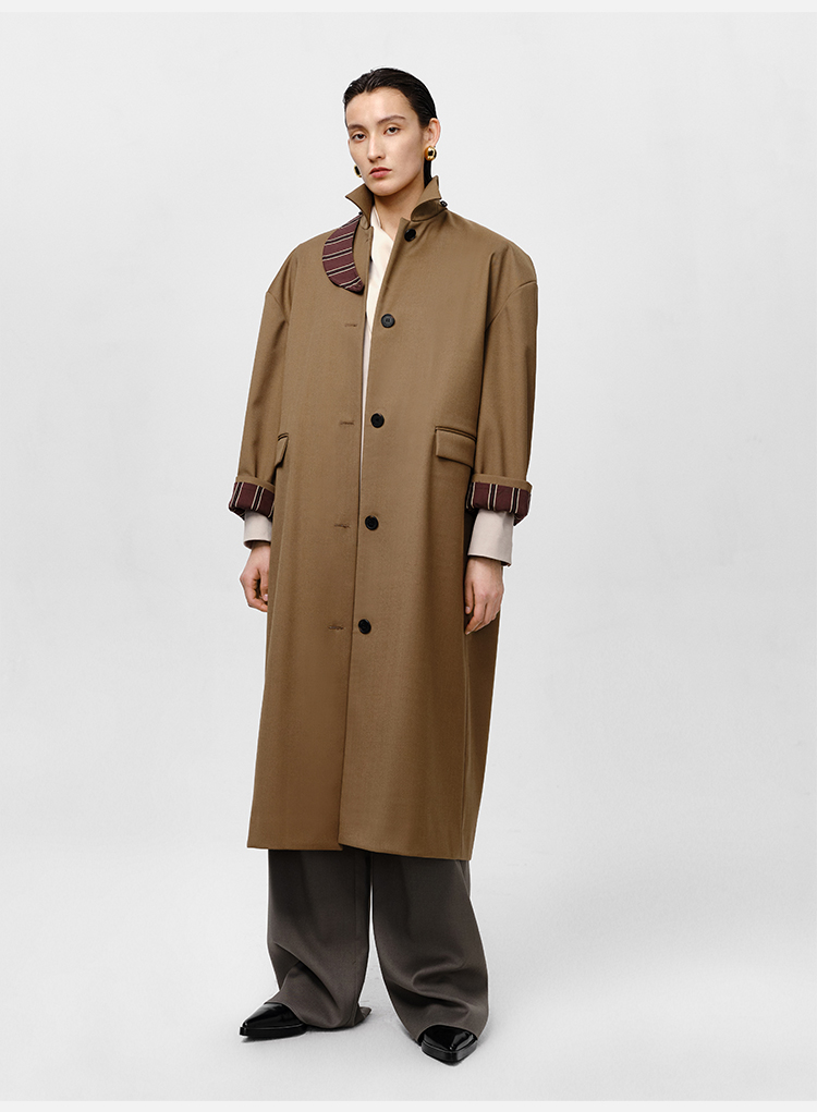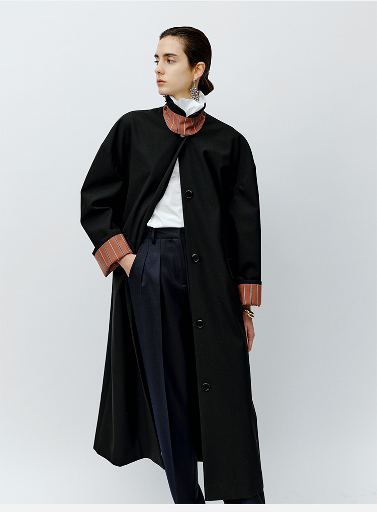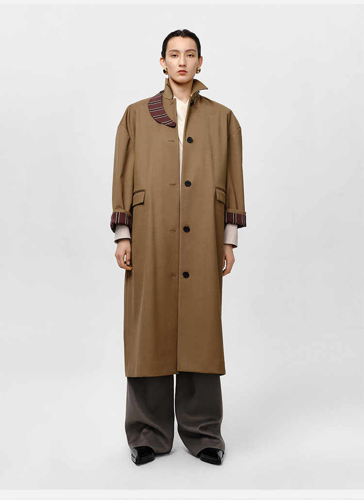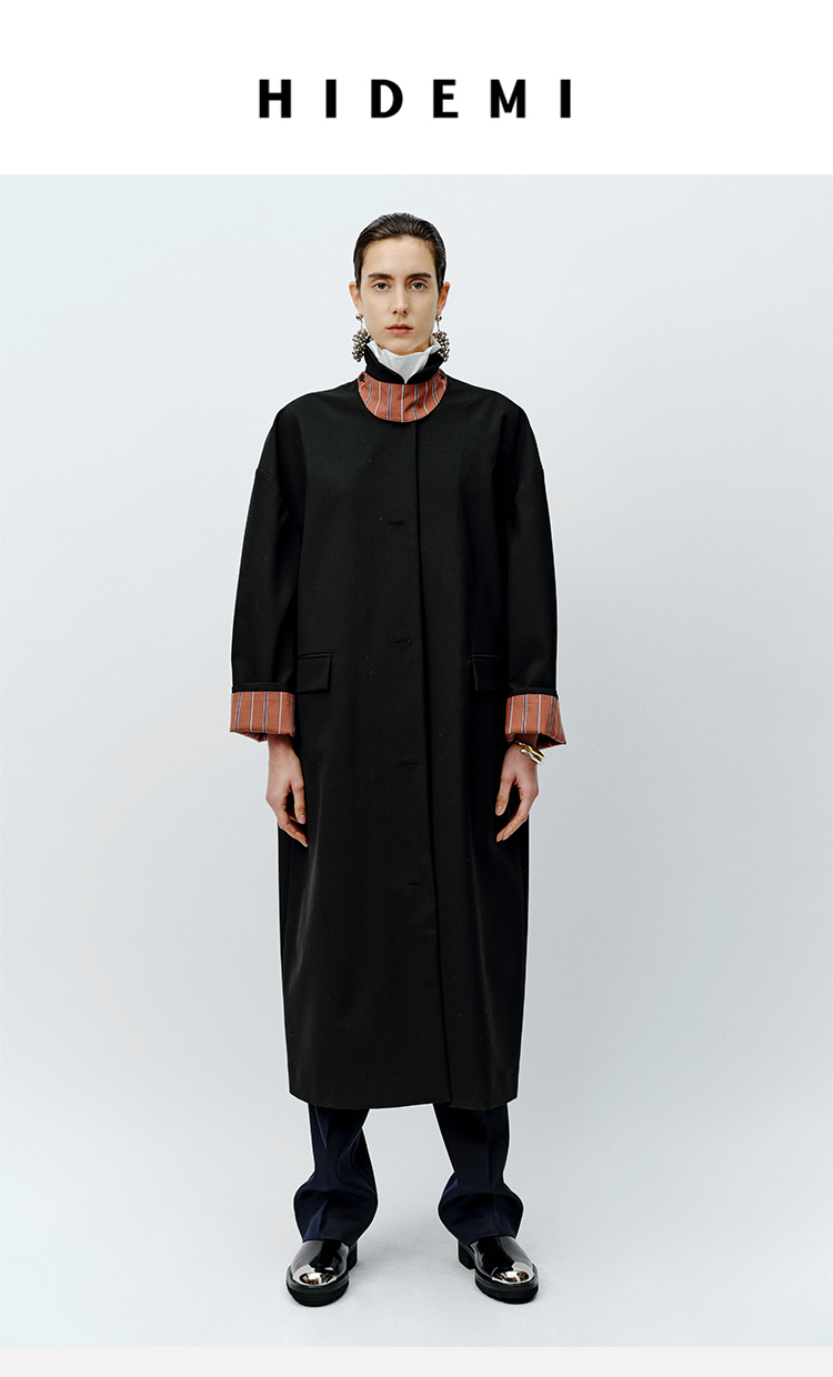 HIDEMI 廓形条纹翻边复古长款精纺羊毛风衣