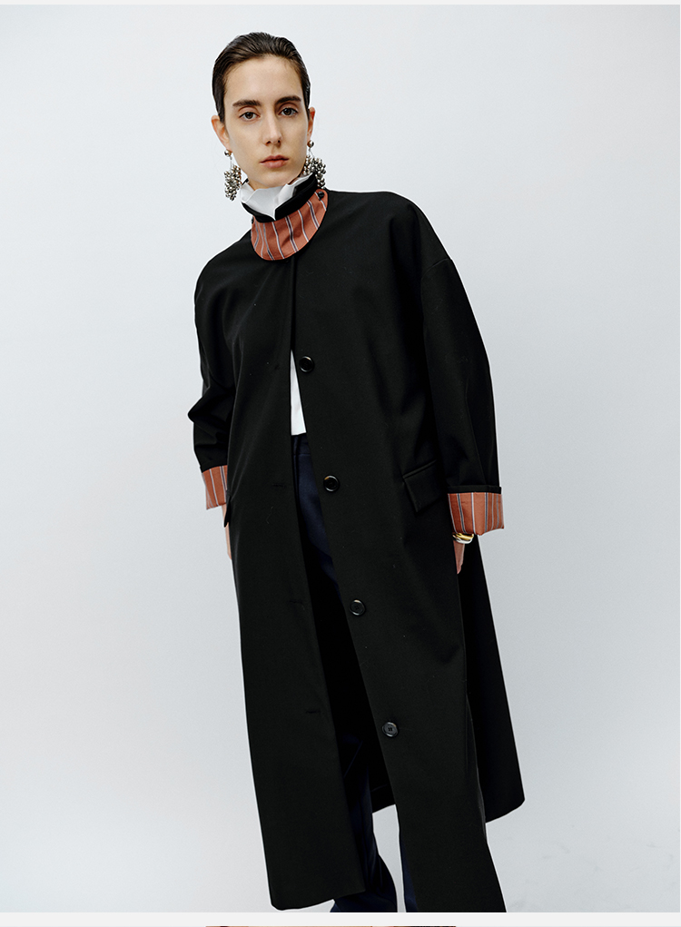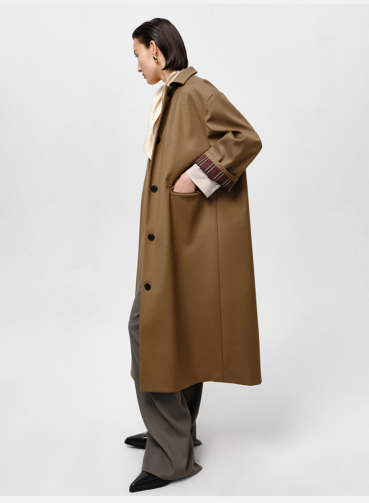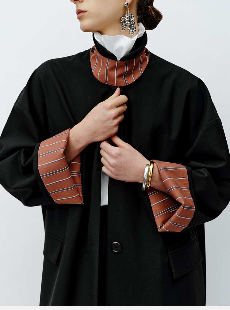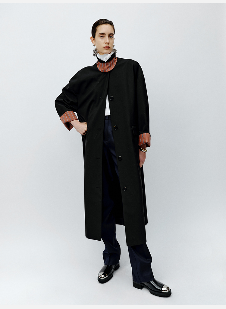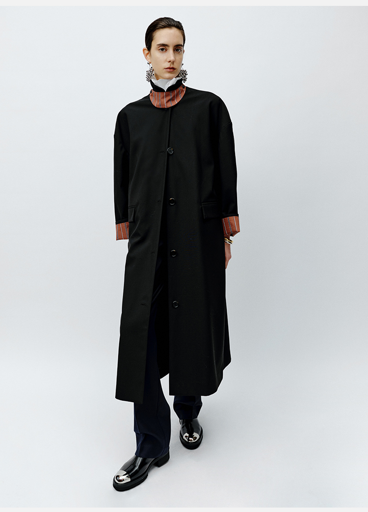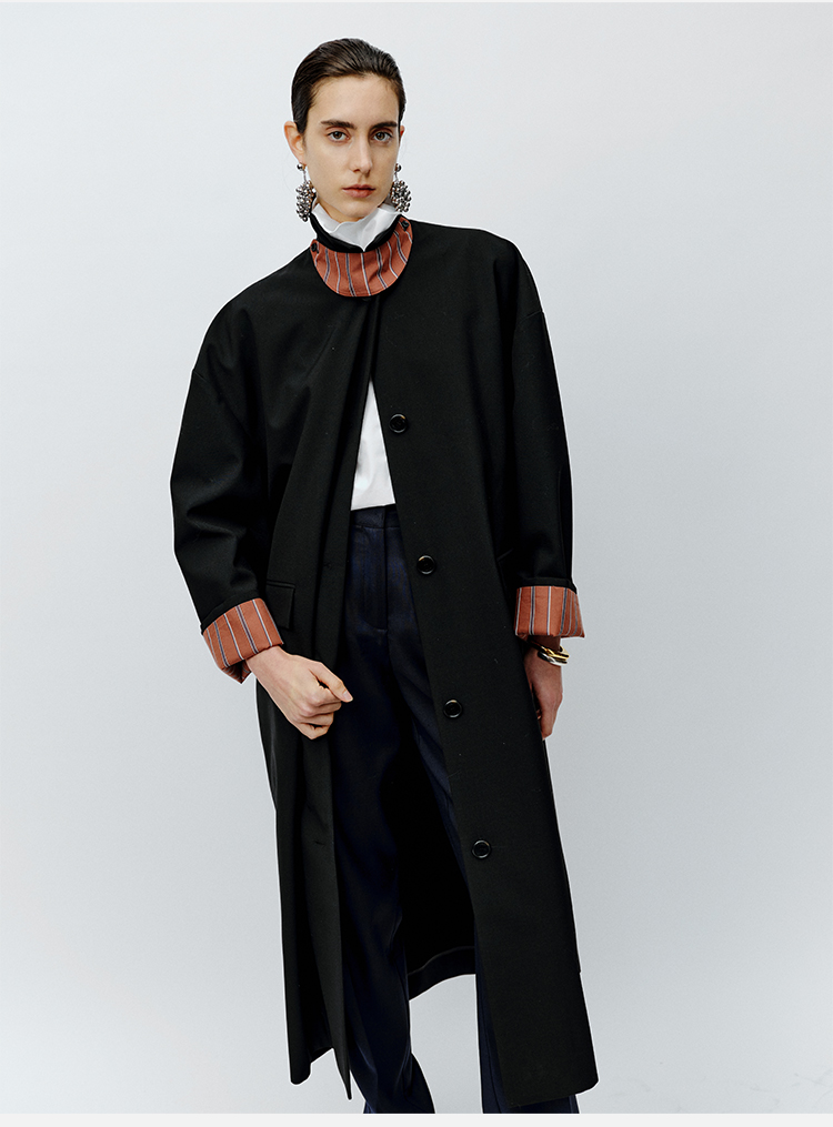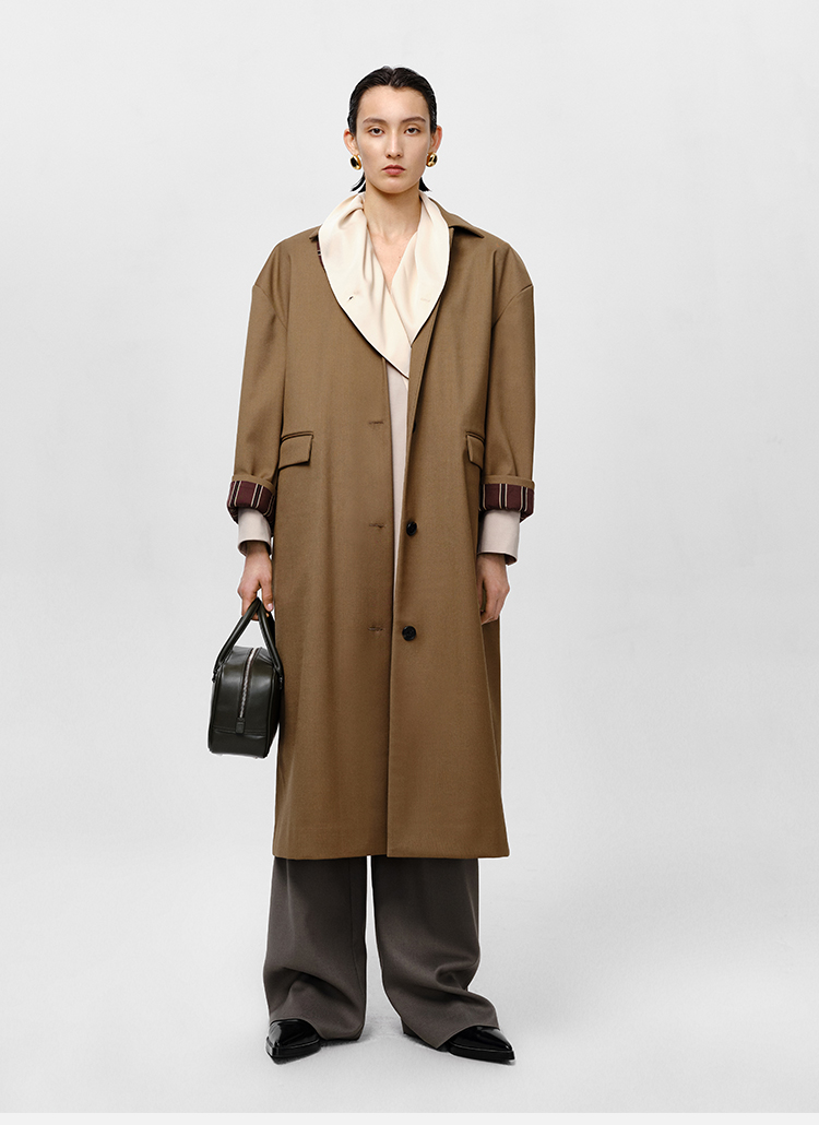 HIDEMI 廓形条纹翻边复古长款精纺羊毛风衣