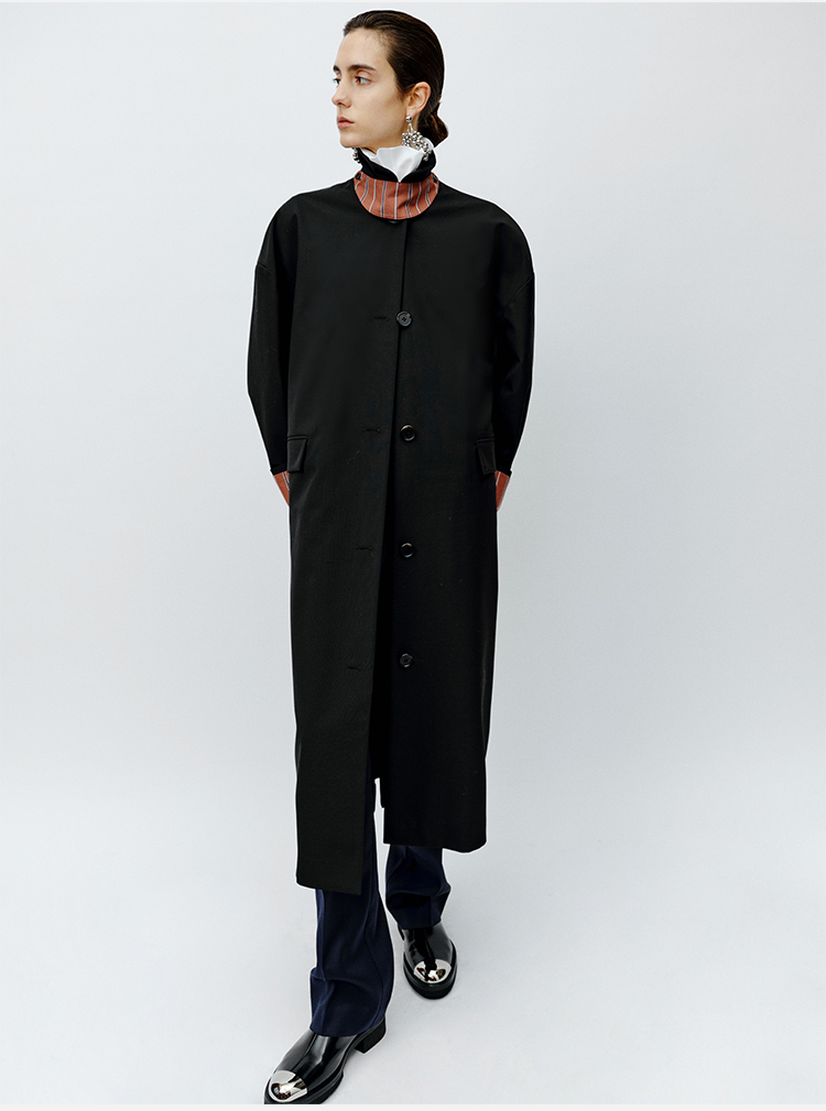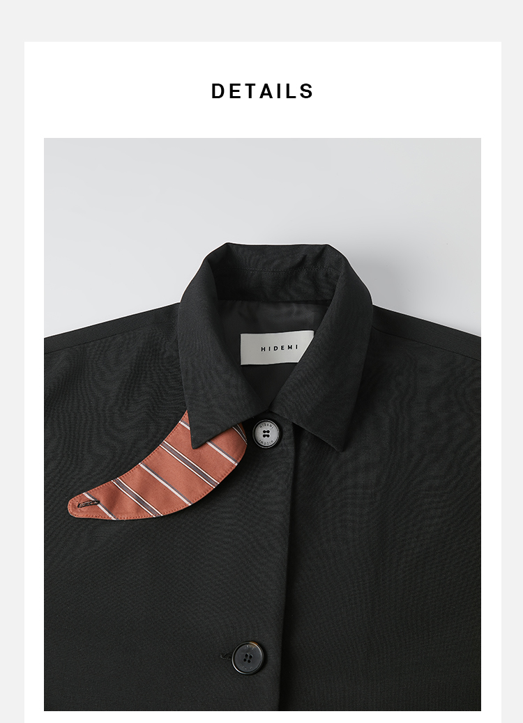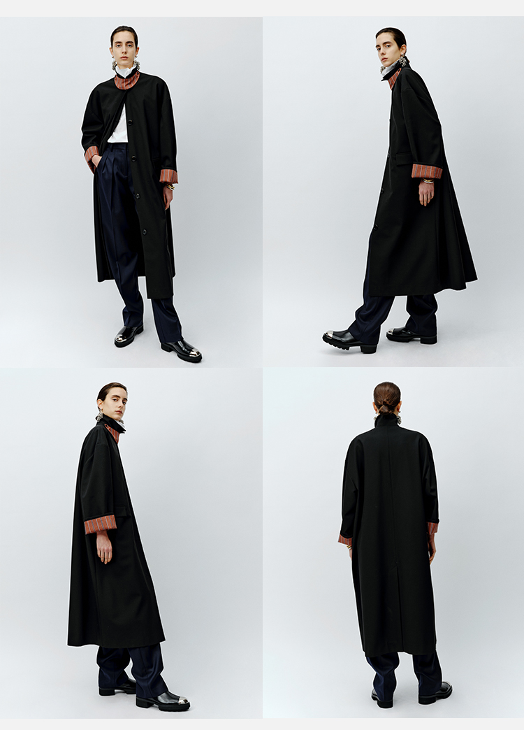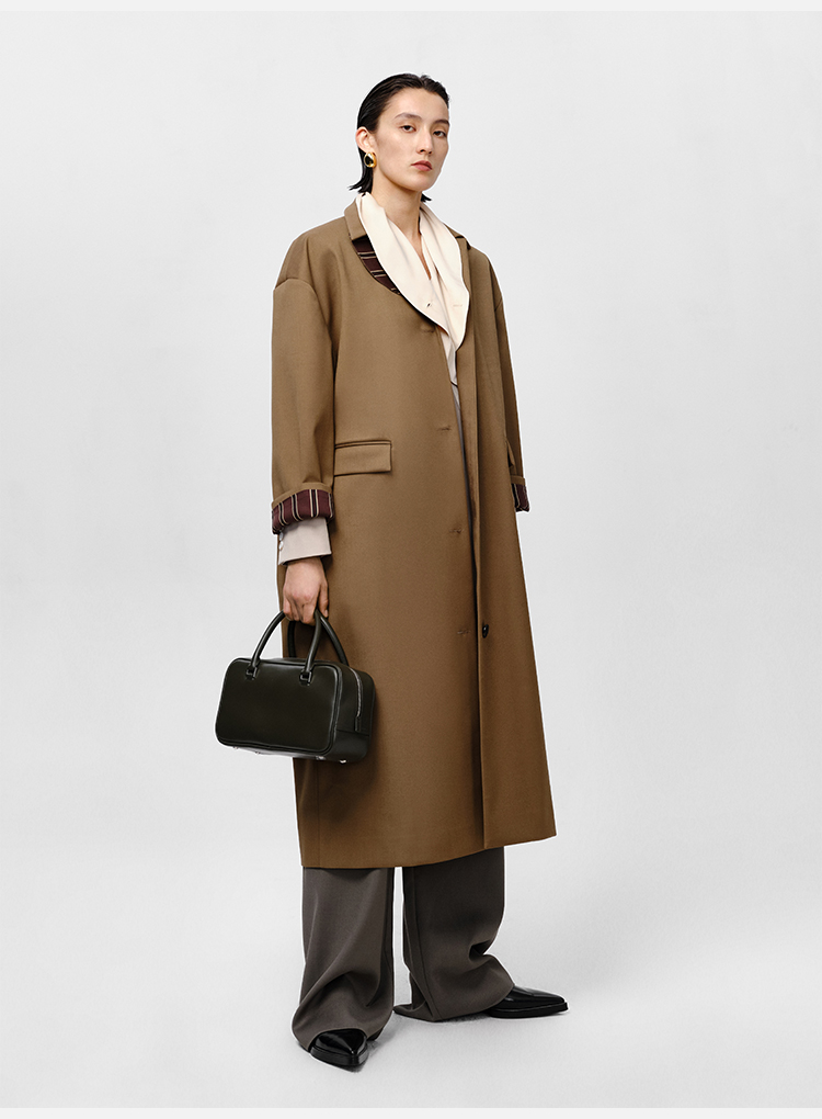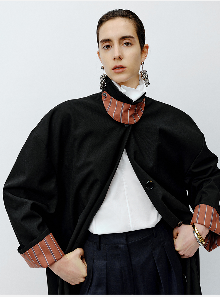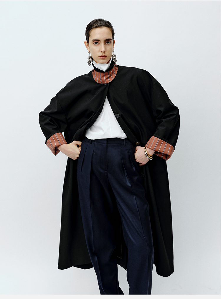 HIDEMI 廓形条纹翻边复古长款精纺羊毛风衣