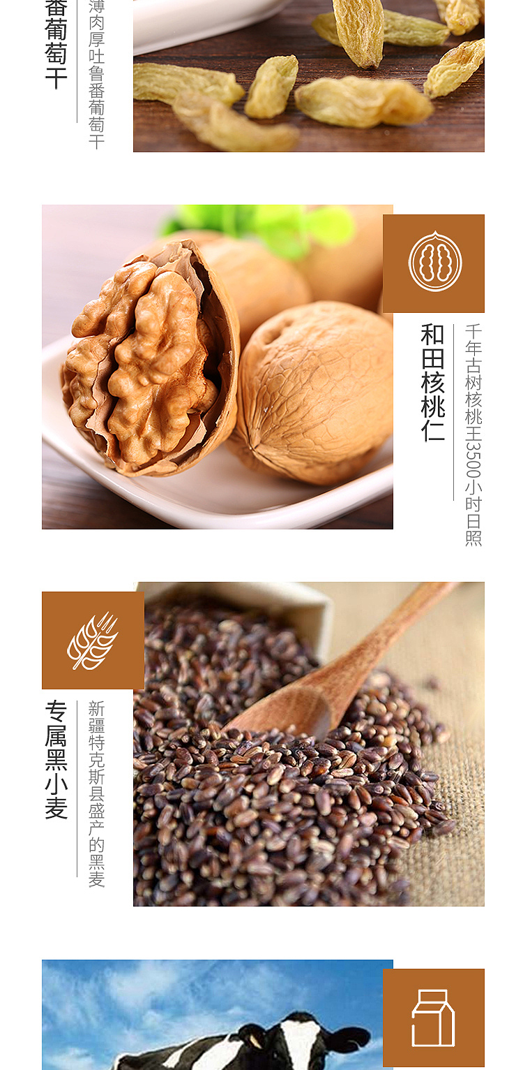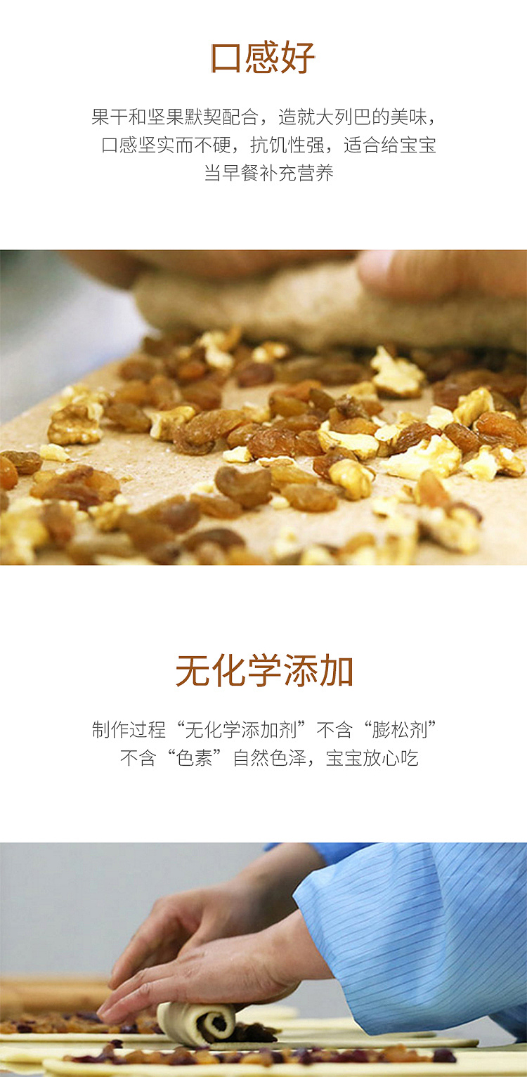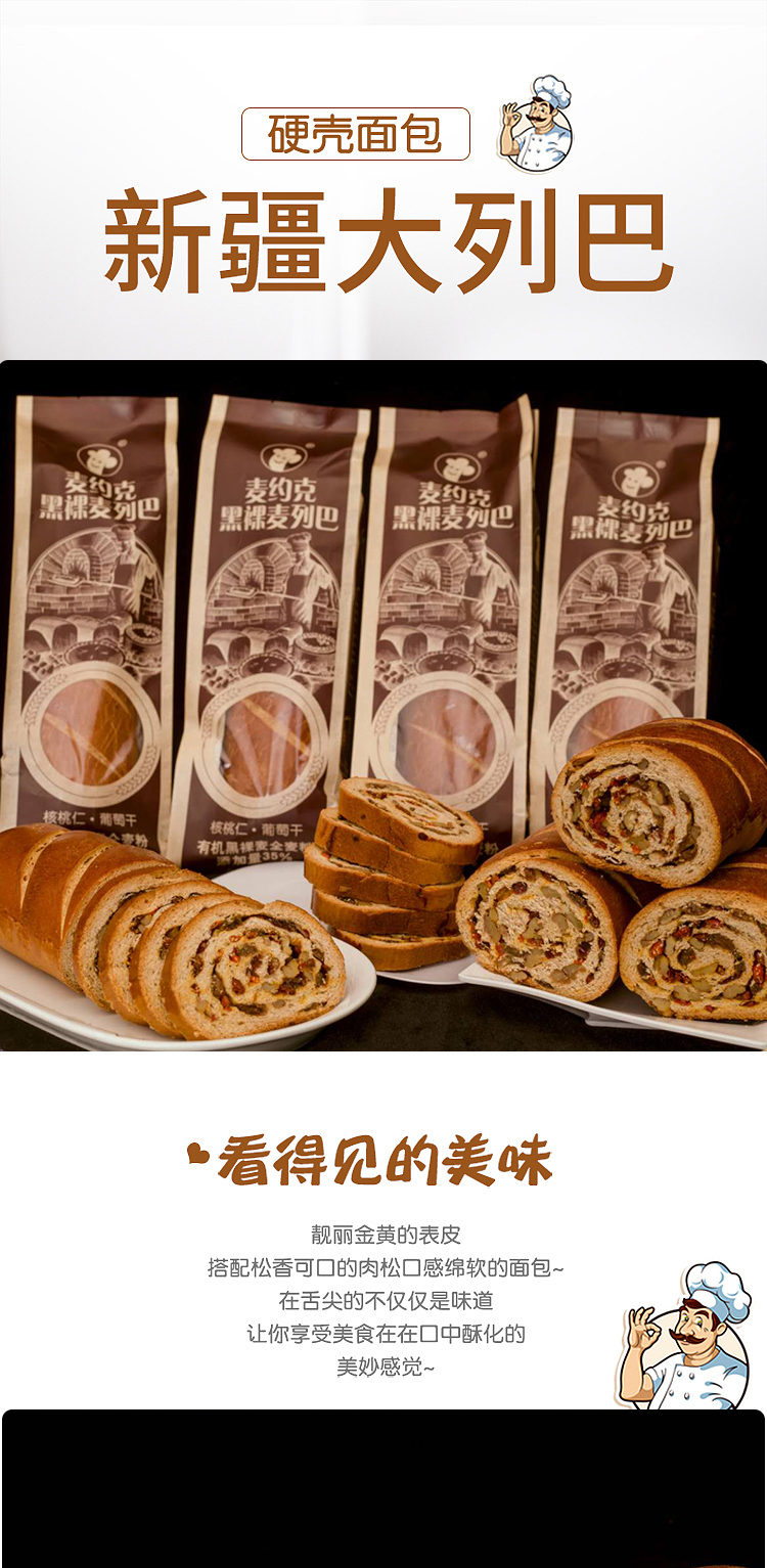 大列巴到了瓜果飘香的新疆之后也做了不少改变,单个重达500g,扎实的面包里还夹满了坚果。关键是这种大列巴不含任何添加剂、膨松剂、染色剂,是真正的纯天然营养大坚果包!
