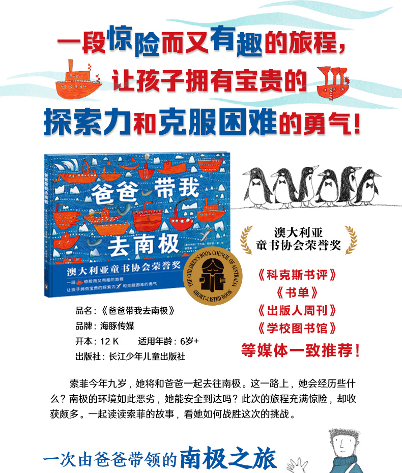 一本充满童趣的科普绘本。以九岁女孩索菲为第一人称,从孩子的视角讲述了一段惊险而有趣的南极之旅。通过阅读同龄人的故事,在潜移默化中向读者传递勇气与成长的力量。澳大利亚童书协会荣誉奖。