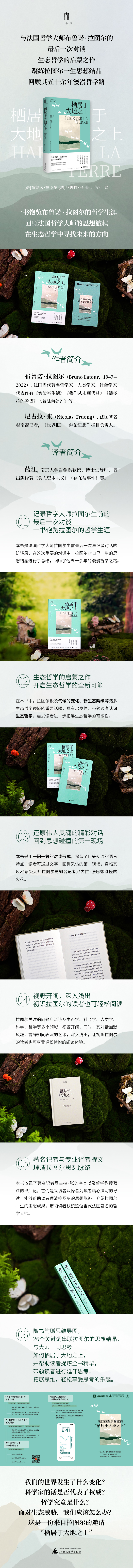 在这本书中,拉图尔从改变世界谈到现代性的终结,从“盖娅入侵”谈到“着陆何处?”运动,从新生态阶级谈到集体装置的发明,从宗教谈到科学,从实存模式谈到政治圈子,再从什么是哲学谈到给未来一代的寄语……话题可谓包罗万象,而拉尔图对“栖居于大地之上”的呼吁亦始终贯穿其中,可以说,拉图尔五十余年的哲学研究,都被浓缩到了这本小书里。
