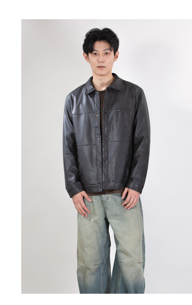 DRONKOO 2025 翻领左胸金属标仿真皮修身中厚皮衣