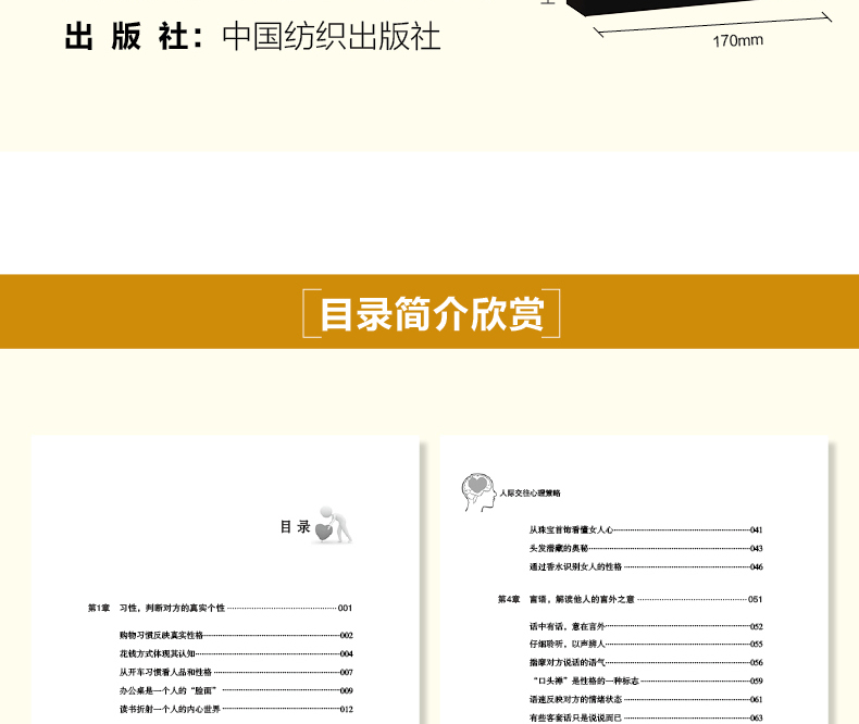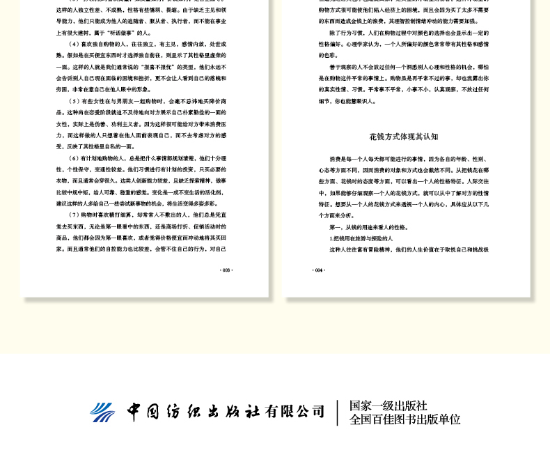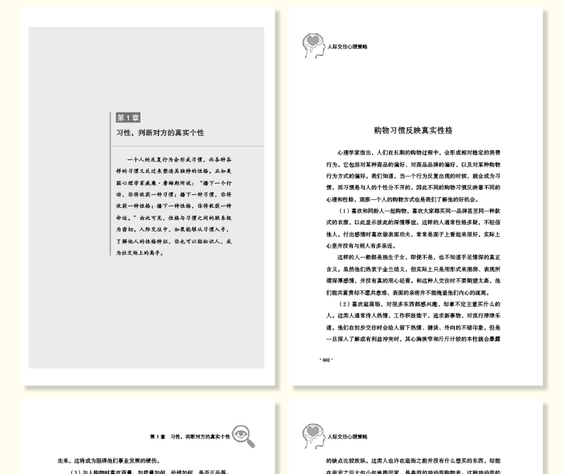 章 习性,判断对方的真实个性 001购物习惯反映真实性格002花钱方式体现其认知004从开车习惯看人品和性格007办公桌是一个人的“脸面”009读书折射一个人的内心世界012第2章 行为,探寻动作背后的秘密 015从握手了解对方的心理016习惯性小动作暴露潜意识019吃相泄露出的个性秘密023微表情隐藏的真实意图025打姿势暴露人心029第3章 形象,辨别对方真实本性 033解读女人的化妆行为034从领带的佩戴看男人的心理需求036手提揭示女人的性格039从珠宝首饰看懂女人心 041头发潜藏的奥秘 043通过香水识别女人的性格 046第4章 言语,解读他人的言外之意 051话中有话,意在言外 052仔细聆听,以声辨人 055揣摩对方说话的语气 056“口头禅”是性格的一种标志 059语速反映对方的情绪状态 061有些客套话只是说说而已 063第5章 姿势,解语各种体态语言 067头部姿势大有“乾坤” 068不容忽视的手势语言 071一个人的走姿与内心 074站姿透露内心的秘密 077从下意识的睡姿看性格 080从坐姿看穿性格秘密 083第6章 嗜好,窥探对方的为人态度 087透过色彩判断对方性格趋向 088从电视节目看人的心理 091音乐喜好与人格类型 093从宠物偏好观察对方性格 096喝什么透露一个人的品位 099从收藏发现一个人的生活追求 1第7章 服饰,嗅出装扮里的品位 5衣如其人,着装风格的学问 6衣服是思想的形象 8一件内衣暴露她的性格 111小小帽子透露真实心理 113职业着装的语言符号 115从他佩戴的眼镜看其性格 117第8章 沟通策略,让对方畅所欲言 121让话题围绕对方展开 122合适的称呼,让对方倍感亲切 124倾听是表示友好的一种方式 126认同效应,多谈一见如故的话题 129微笑,的身份证 131适时鼓励,激发对方潜能 134第9章 迎合策略,赢得对方的好感 137点滴善意,足以打动人心 138宽以待人,有容乃大 140请求他人的小帮助 143迎合对方特别的习惯 145善于与人分享功劳和荣耀 148第章 肯定策略,让对方心花怒放 151先认可对方,满足其心理需要 152懂得正确赞美的人更受欢迎 155给予对方更多的肯定 157诚实而真挚地赞美 160适时恭维,满足其虚荣心 1631章 信任策略,拉近彼此感情 167自嘲的艺术,营造和谐气氛 168少说“我”而多用“你” 171中带点小缺憾,更受人欢迎 173打消对方顾虑,赢得信任 175给对方一些好处,让人觉得你贴心 178偶尔的缺点让人更亲切 1802章 形象心理,给对方留下好印象 183以诚待人,守护一份信誉 184适时作出决定,切勿自作主张 186恰当展示迷人个性 188把握机遇,推荐自己 191把人格魅力当作资本 194扬长避短,展现自己的闪光点 195参考文献 198