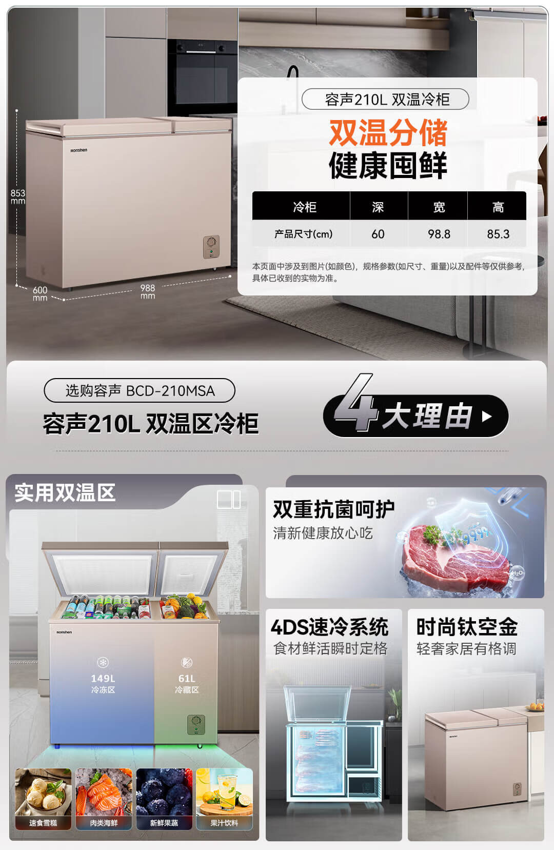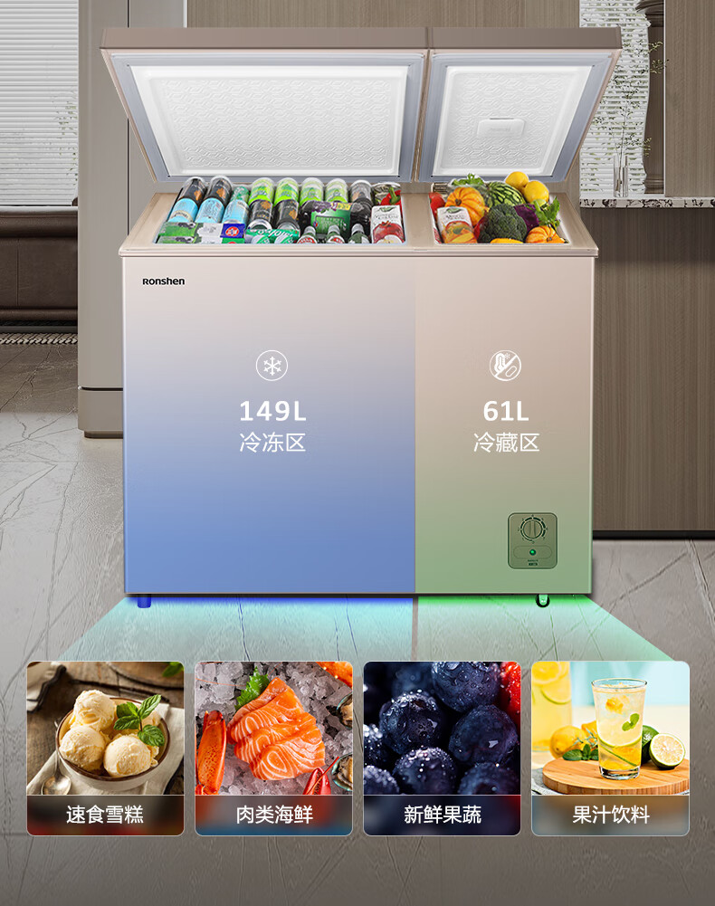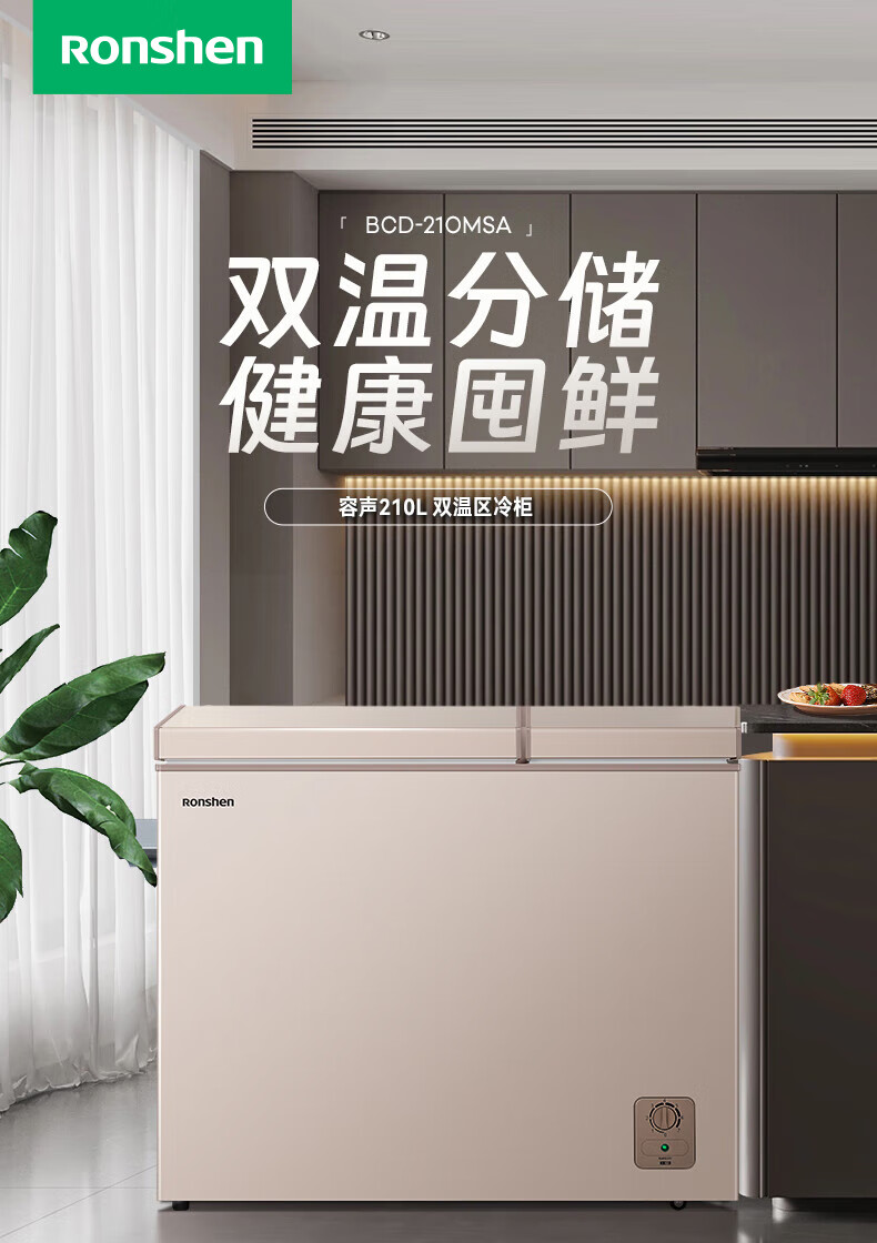容声(Ronshen) 210升 双温冷柜 大容量冰柜 家用商用 冷藏冷冻 一级能效 独立双温 卧式厨房冰箱BCD-210MSA