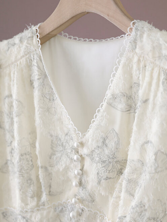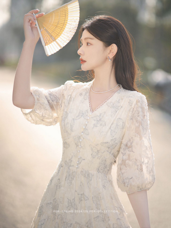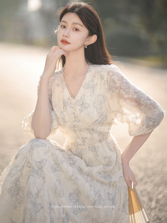 采用蝴蝶提花+剪花面料,别具视觉亮点 肌理纹路清晰,营造动态丰盈的美感 制作工艺非常重工,展现无处不在的高贵气韵 整体飘逸自如,质地柔软细腻 上身透汽亲肤,穿着舒适不易皱
