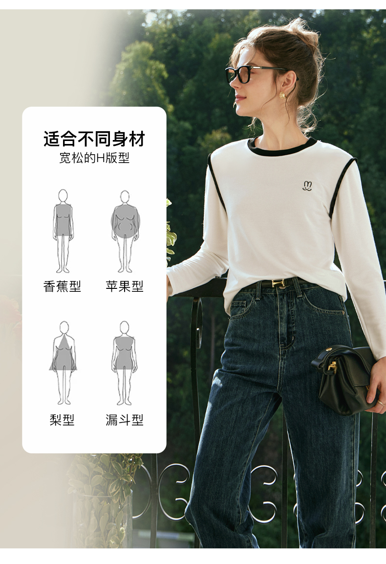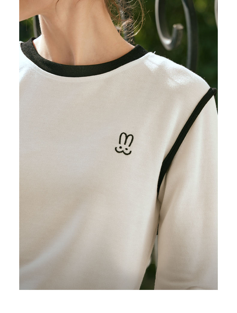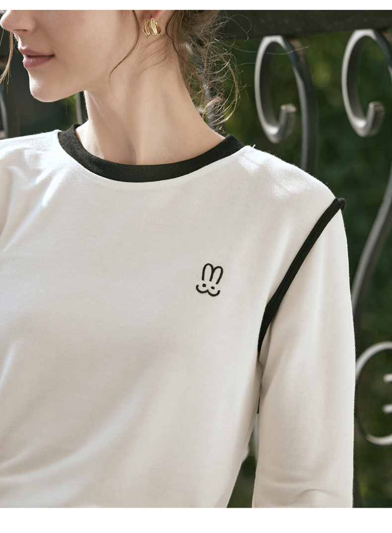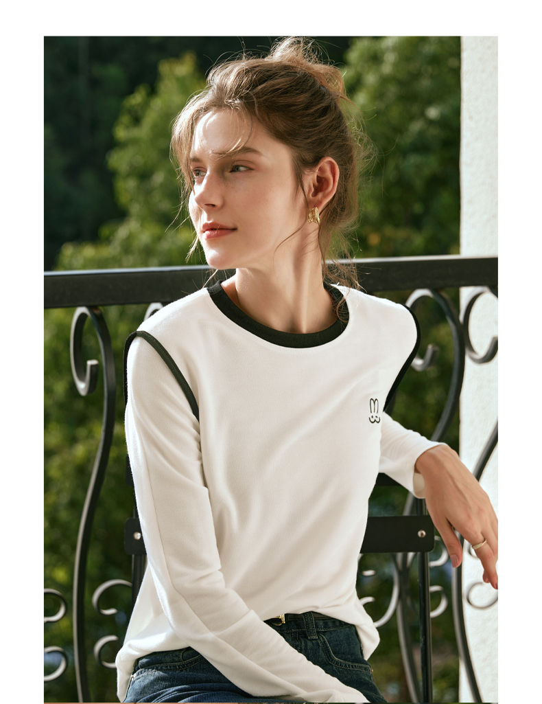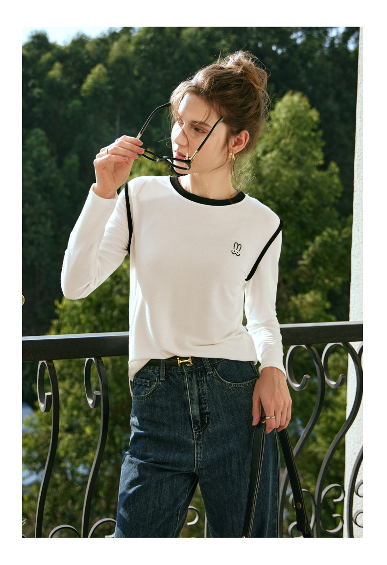 OLrain欧芮儿白色T恤女秋冬2023年新款简约百搭显瘦撞色刺绣长袖