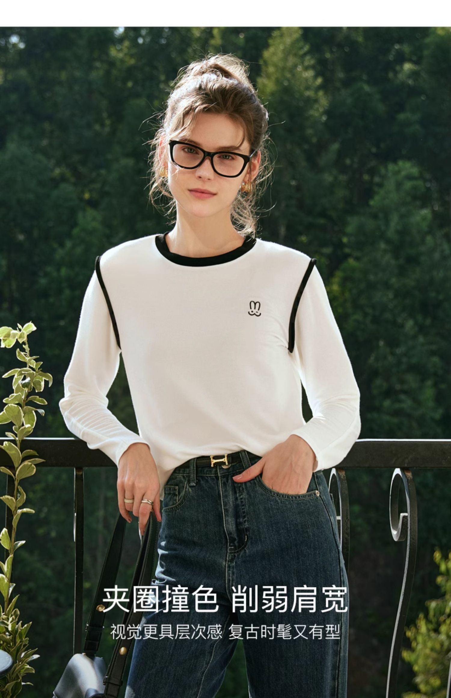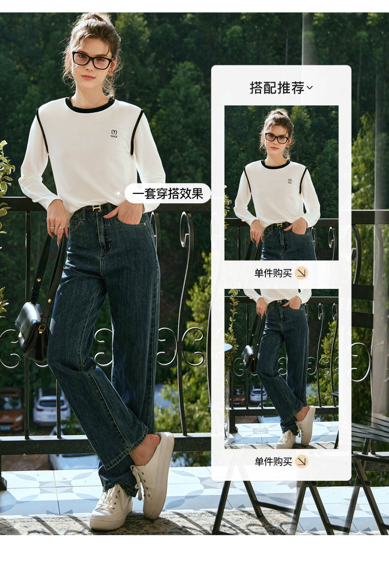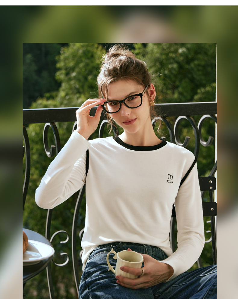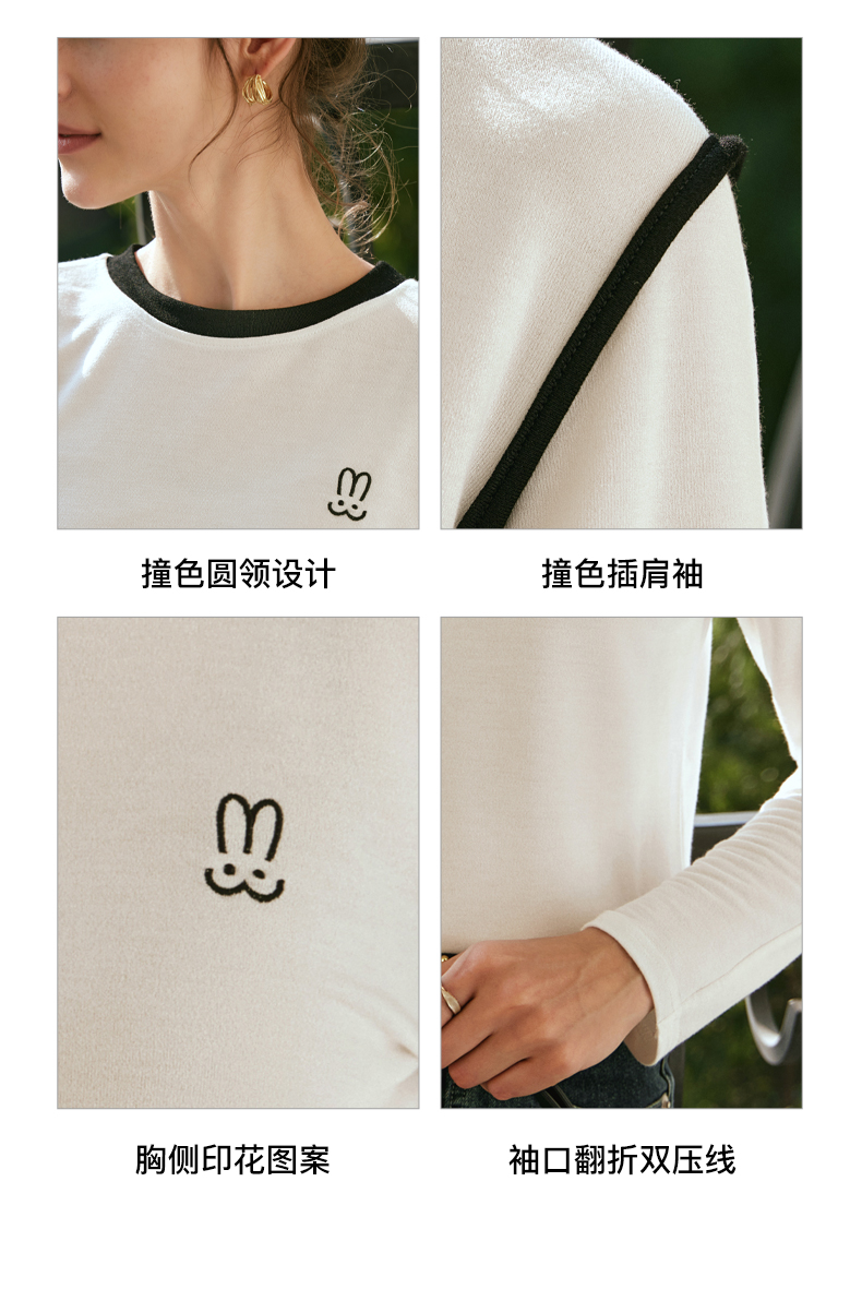 OLrain欧芮儿白色T恤女秋冬2023年新款简约百搭显瘦撞色刺绣长袖