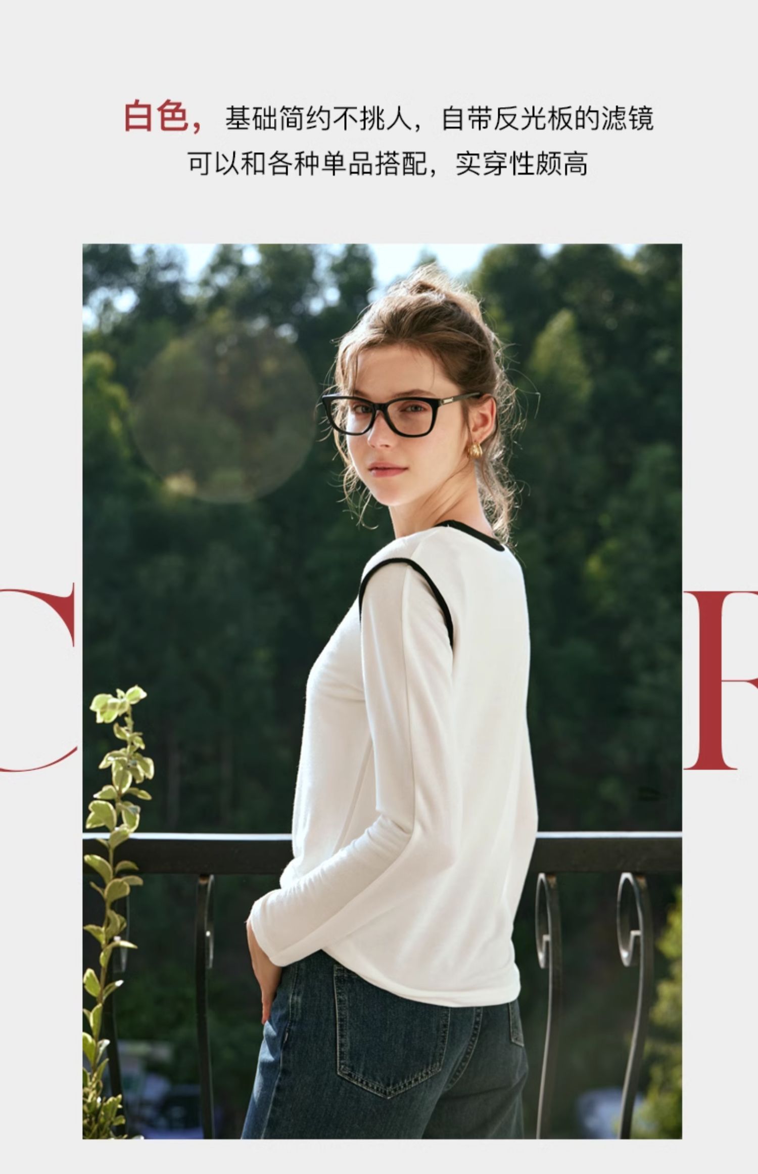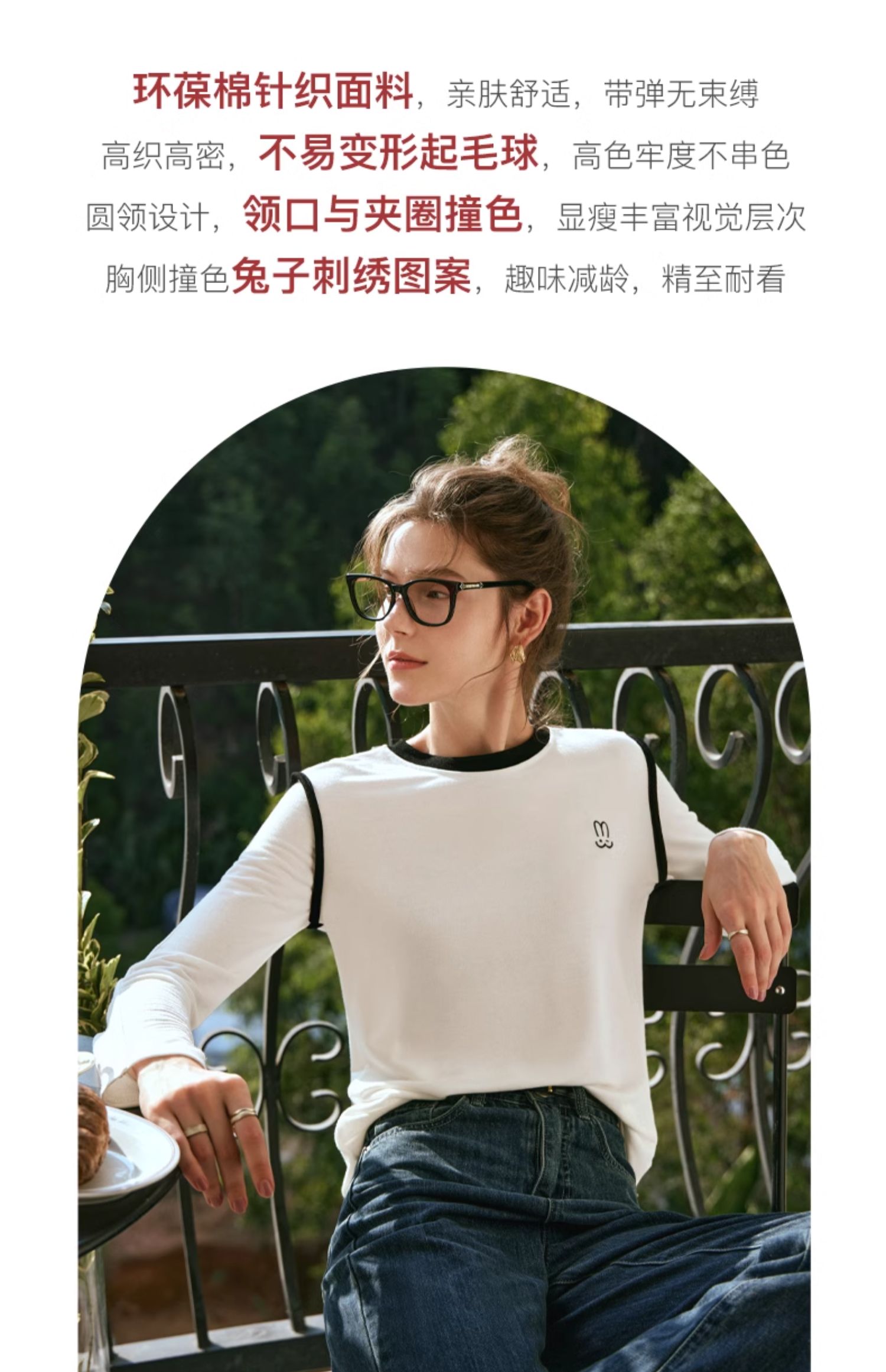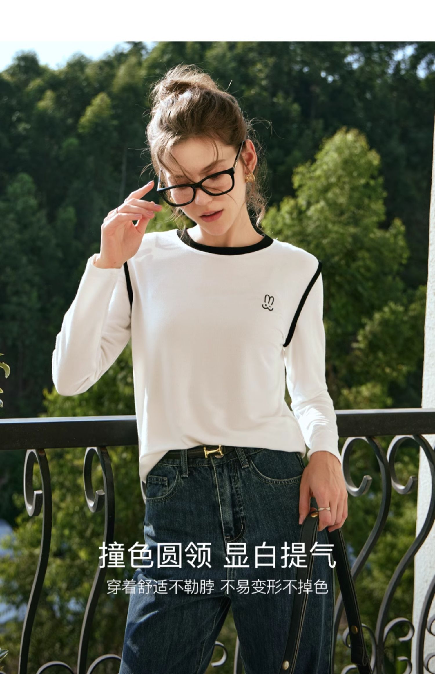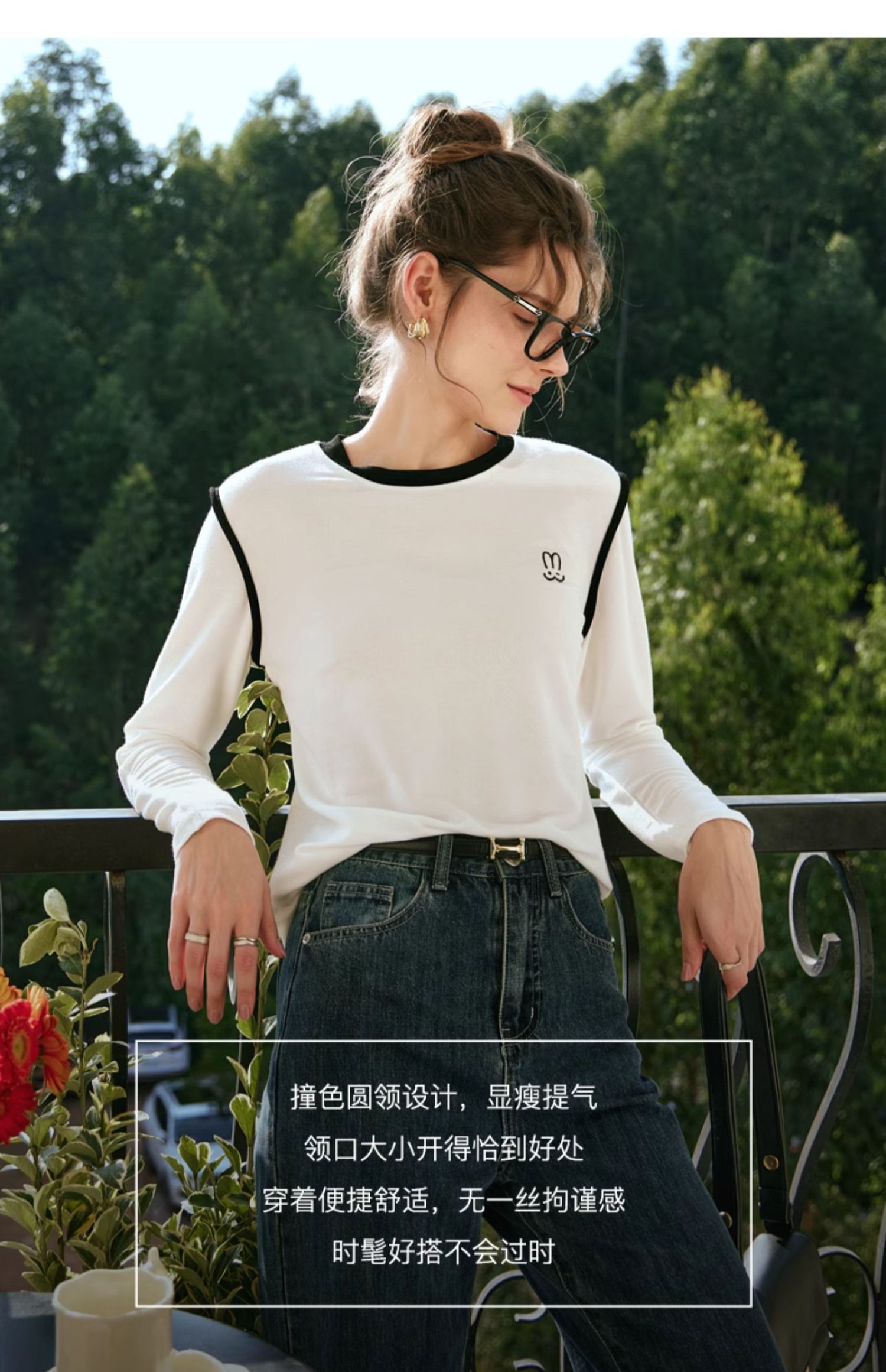 OLrain欧芮儿白色T恤女秋冬2023年新款简约百搭显瘦撞色刺绣长袖