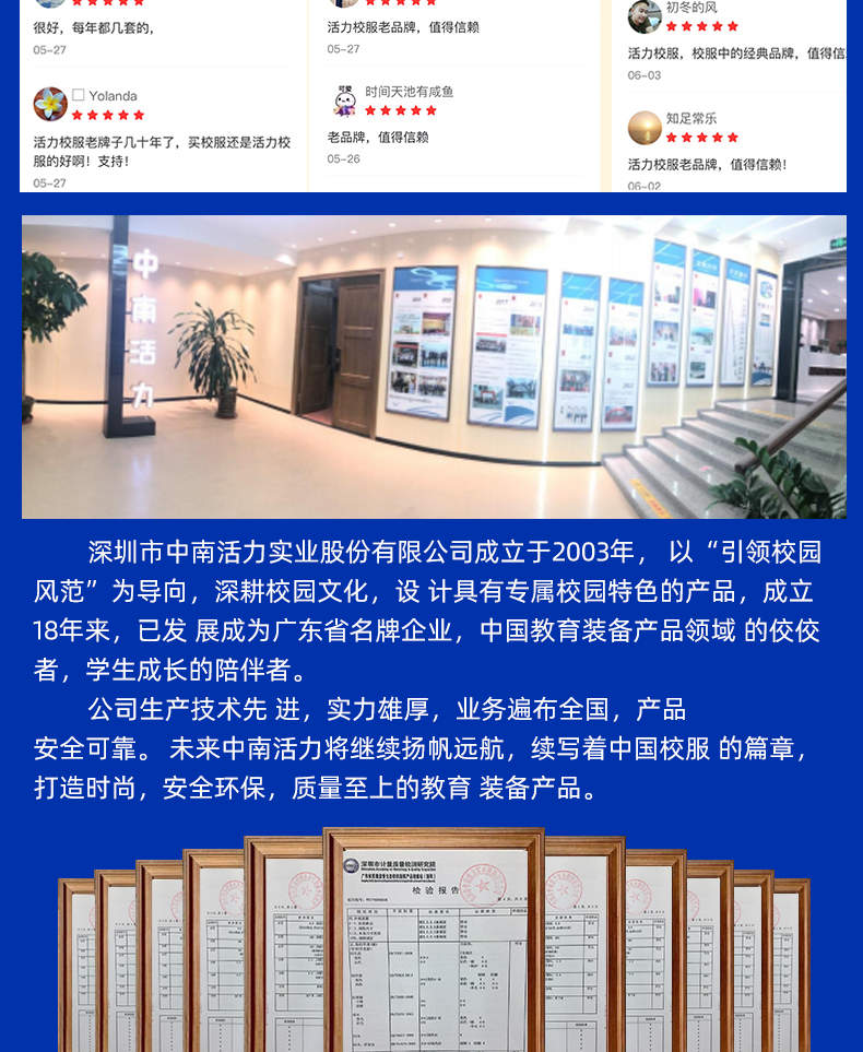 活力校服由深圳市中南活力实业股份有限公司创建的品牌,深圳二十一年老品牌,教育局中标企业;主营深圳校服、广州校服、东莞校服、佛山校服、肇庆校服、江苏校服、鞋袜、学生床上用品等学生课桌椅一站式教育领域产品