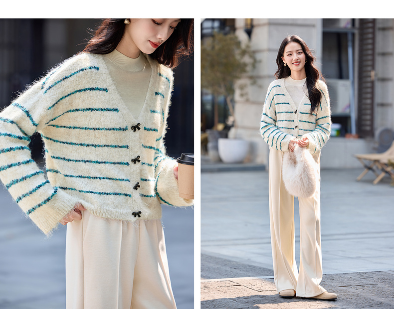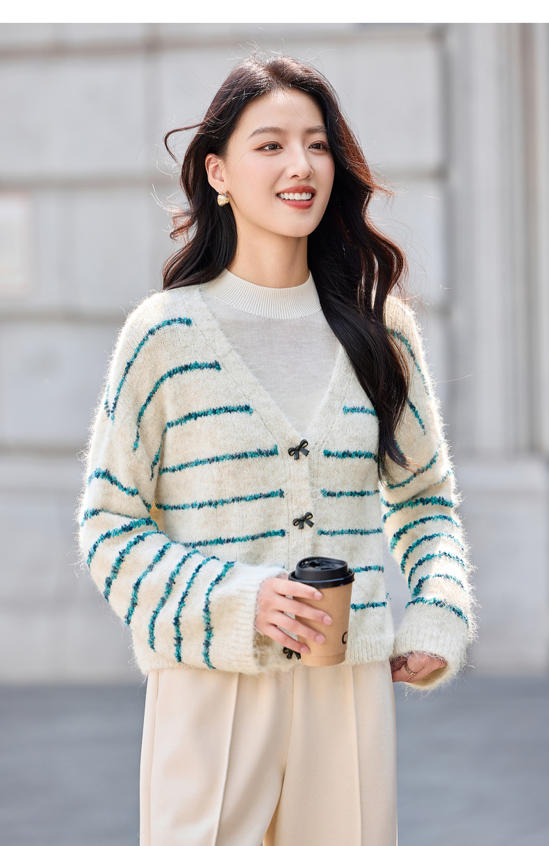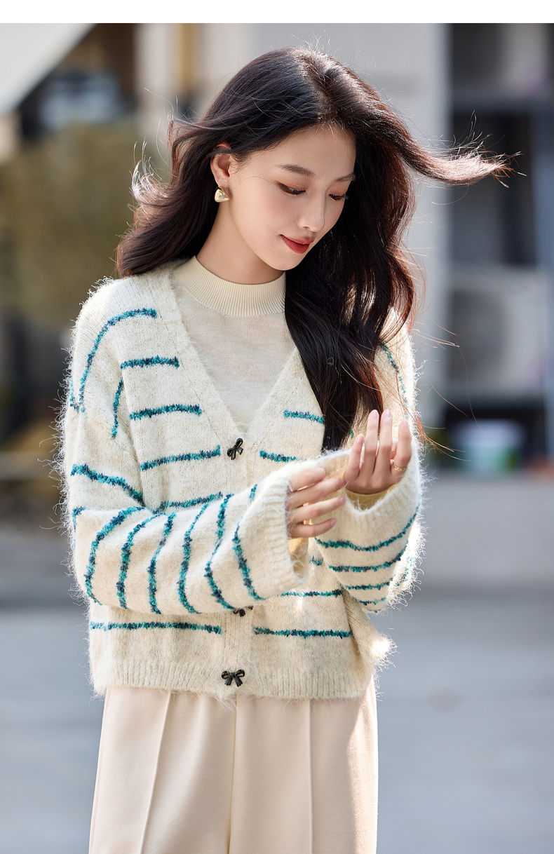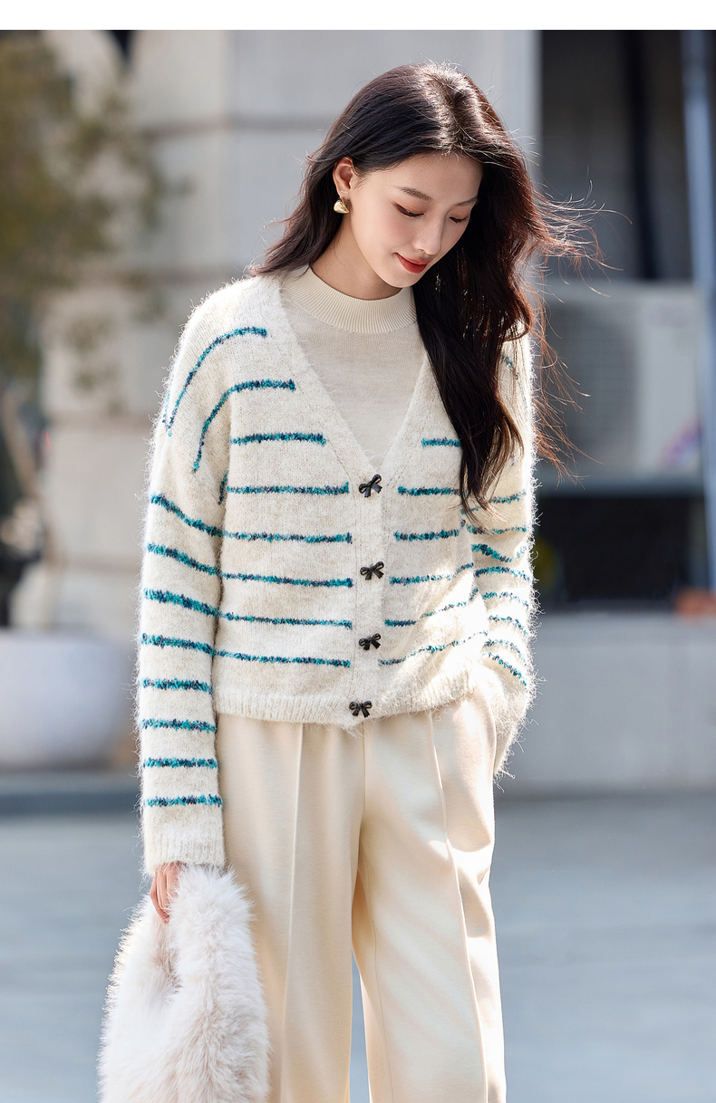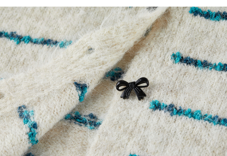 【内购】【梦幻条纹】时尚V领撞色蝴蝶结宽松含绵羊毛弹力厚保暖开衫毛衣-W54EB4846