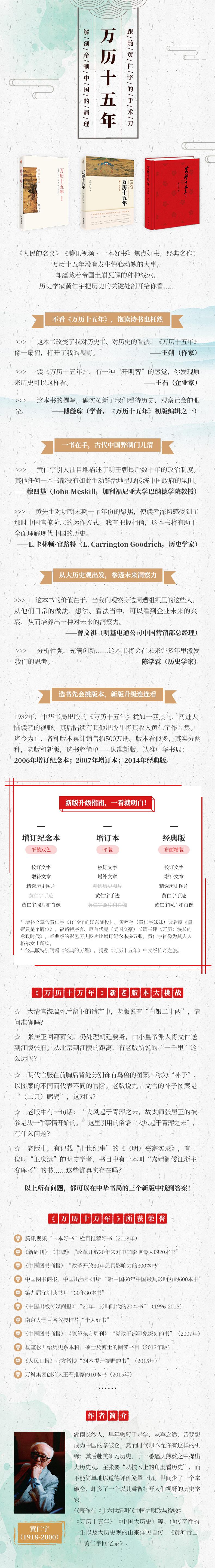 黄仁宇著的《万历十五年(增订纪念本)》问世后,风行数十年,英文本被美国多所大学采用为教科书,并两次获得美国书卷奖历史类好书的提名;中文本入选《新周刊》和《书城》“改革开放20年来对中国影响优选的20本书”、中国出版科研所“新中国60年拥有影响力的600本书”、第九届深圳读书月“30年30本书”等。中文增订纪念本核校全部文字,改正多处错误,并增收历史图片数十幅及黄仁宇先生《1619年的辽东战役》等数篇文字,使全书内容更趋完善、充实。